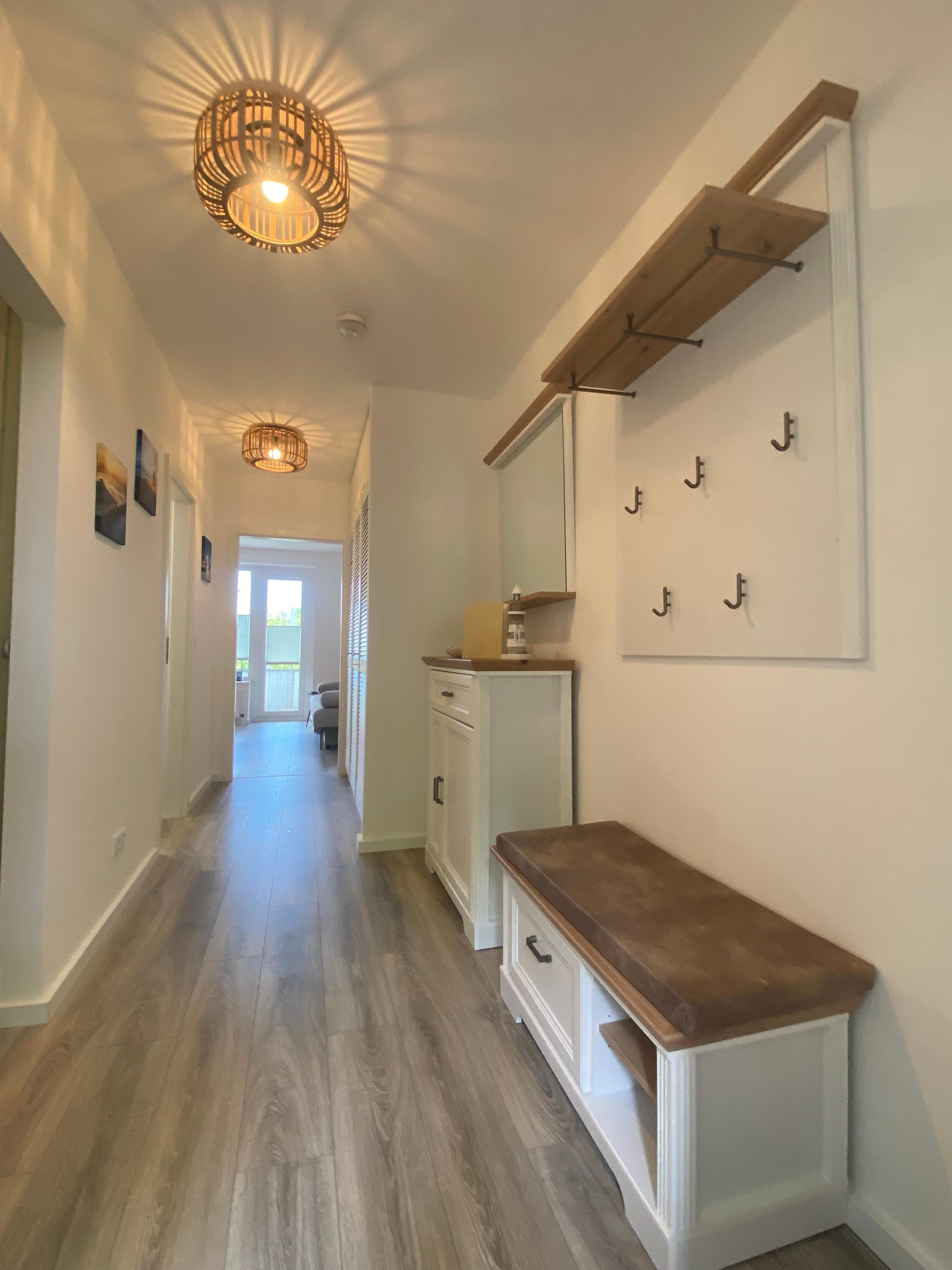 Das kernsanierte und neu eingerichtete 43 qm Ferienapartment befindet sich im 2. OG mit Balkon. Beim Betreten der Wohnung empfängt Sie ein langer Flur, mit viel Staufläche und von dem alle Räume abgehen. Im Wohnzimmer lässt sich alles vereinbaren Essen, Kochen, Relaxen, Entspannen. Die offene, moderne Pantry- Küche ist gut ausgestattet und verfügt über alle Dinge, die sie im Urlaub benötigen. Ein Esstisch lädt zum gemeinsamen Frühstück und Abendessen für 2-4 Personen ein. Das gemütliche Schlafsofa (200 X 150) im Wohnzimmer bietet Platz für eine weitere Person. Im kuscheligen Schlafzimmer (Doppelbett 160 x 200 cm) lässt sich der Abend entspannt ausklingen. Das innenliegende Badezimmer ist modern gefliest und verfügt über eine Dusche.