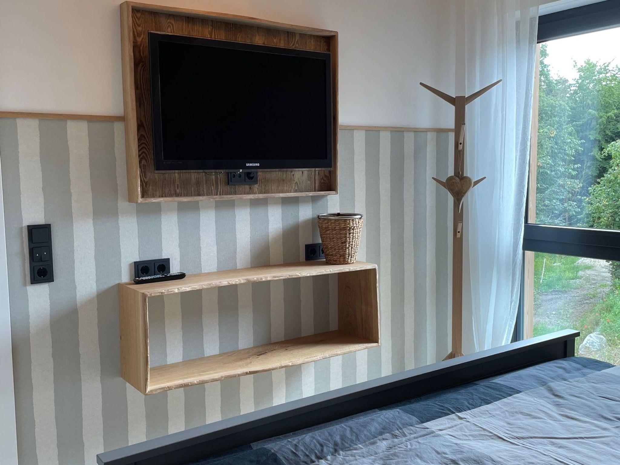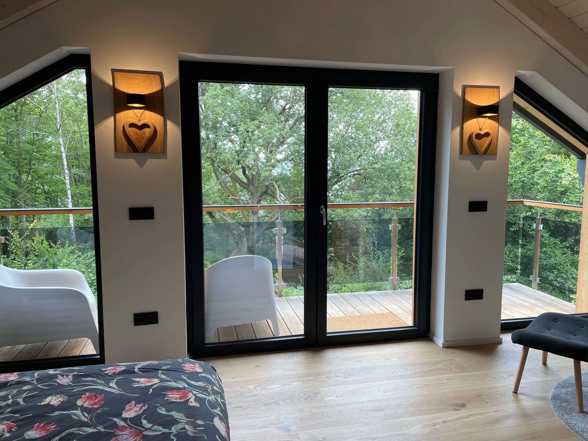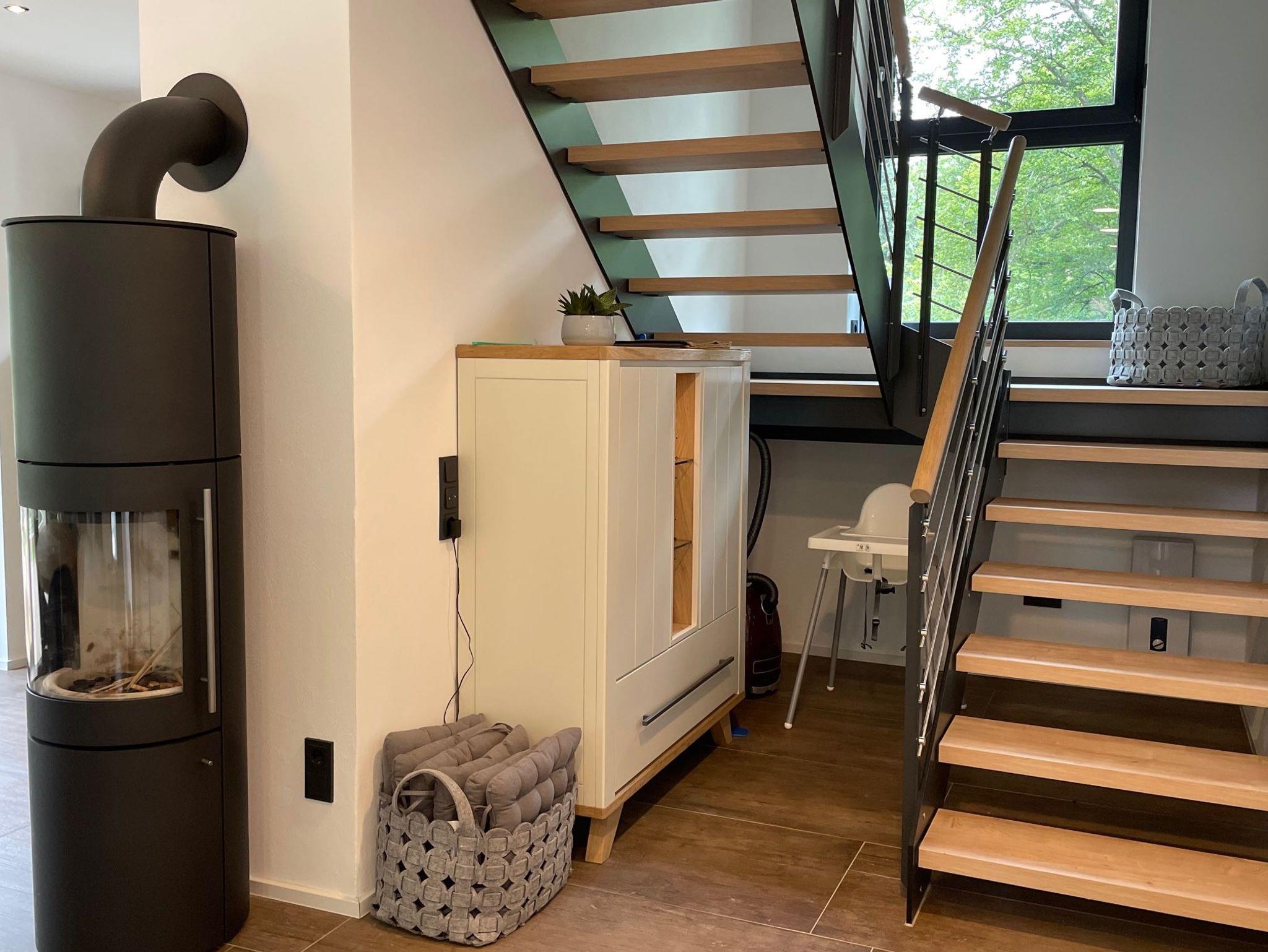 Im Obergeschoß befindet sich ein zweites Bad mit freistehender Badewanne und zwei Ruheräume, einer davon mit eigenem Balkon und Blick vom Bett ins Grün. The Green One bietet Platz für 2–5 Personen, mit einem großzügigen Wohn-, Küchen- und Essbereich, zwei Bädern und zwei, bzw. drei Schlafzimmern.