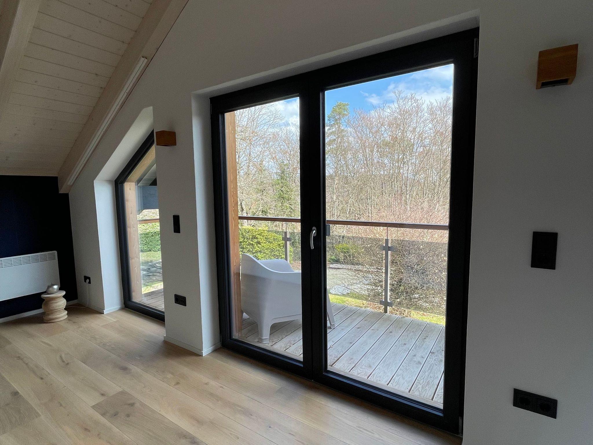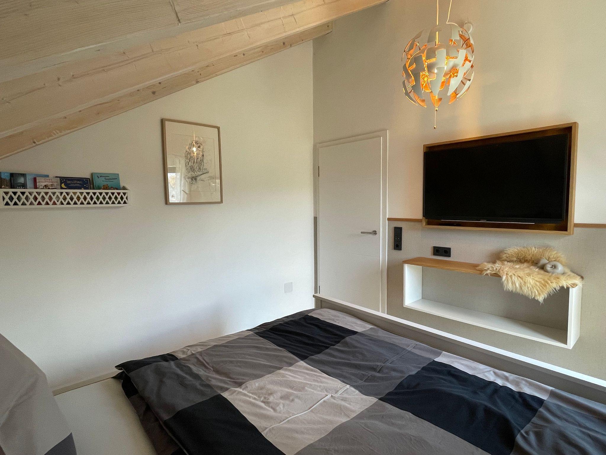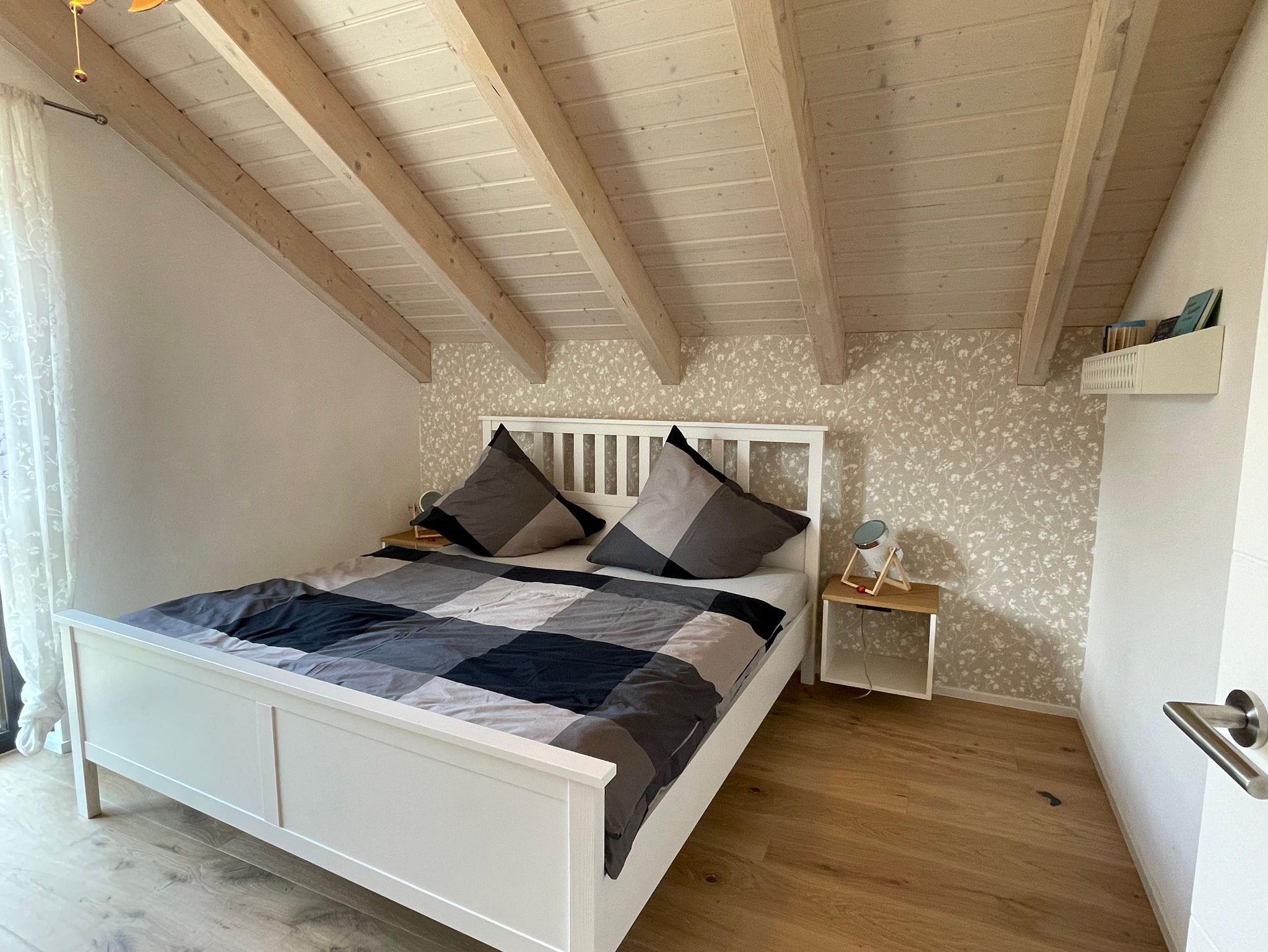 Im Obergeschoß befindet sich ein zweites Bad mit Badewanne und zwei Ruheräume, einer davon mit eigenem Balkon und Blick vom Bett ins Grün.