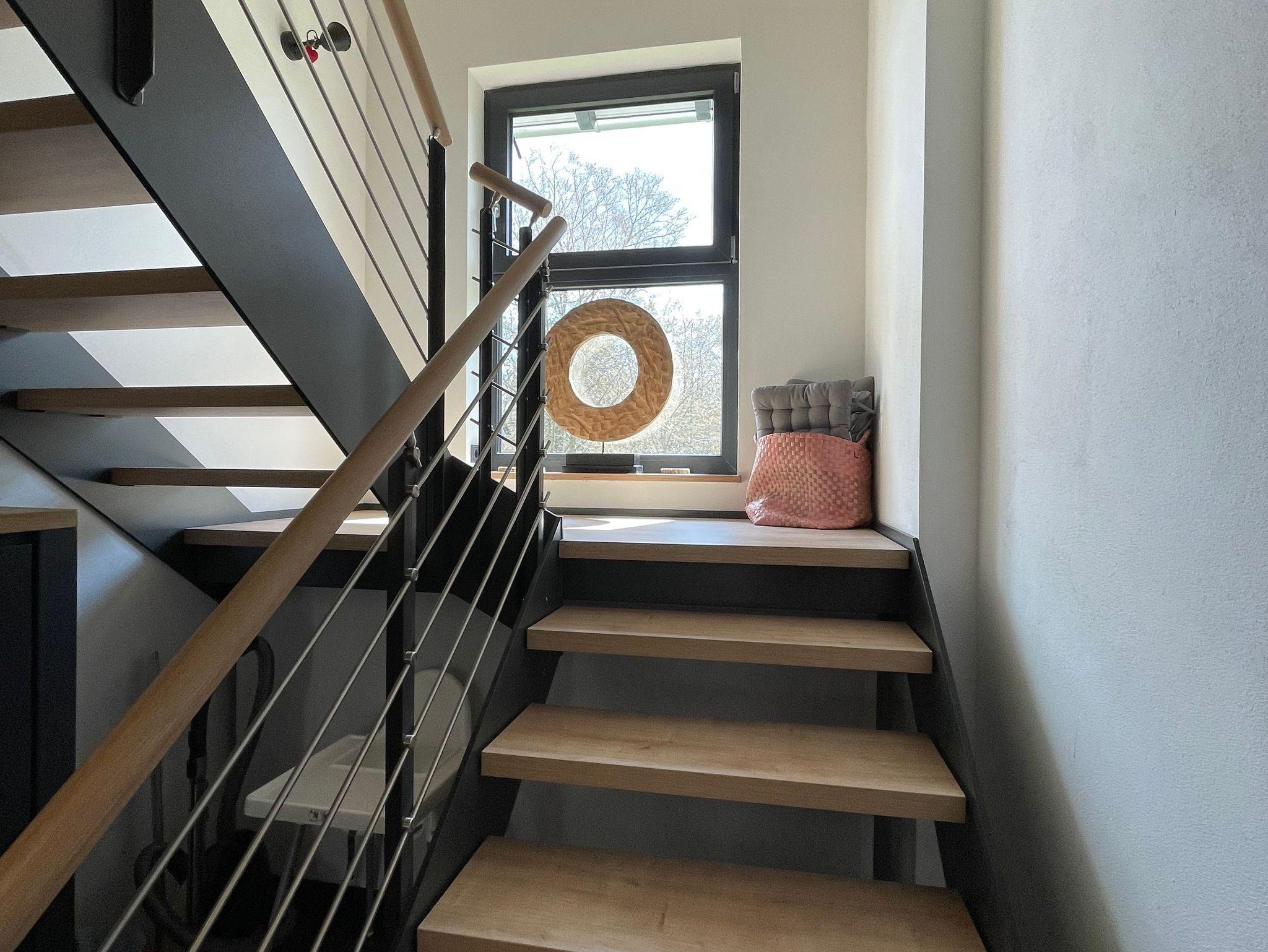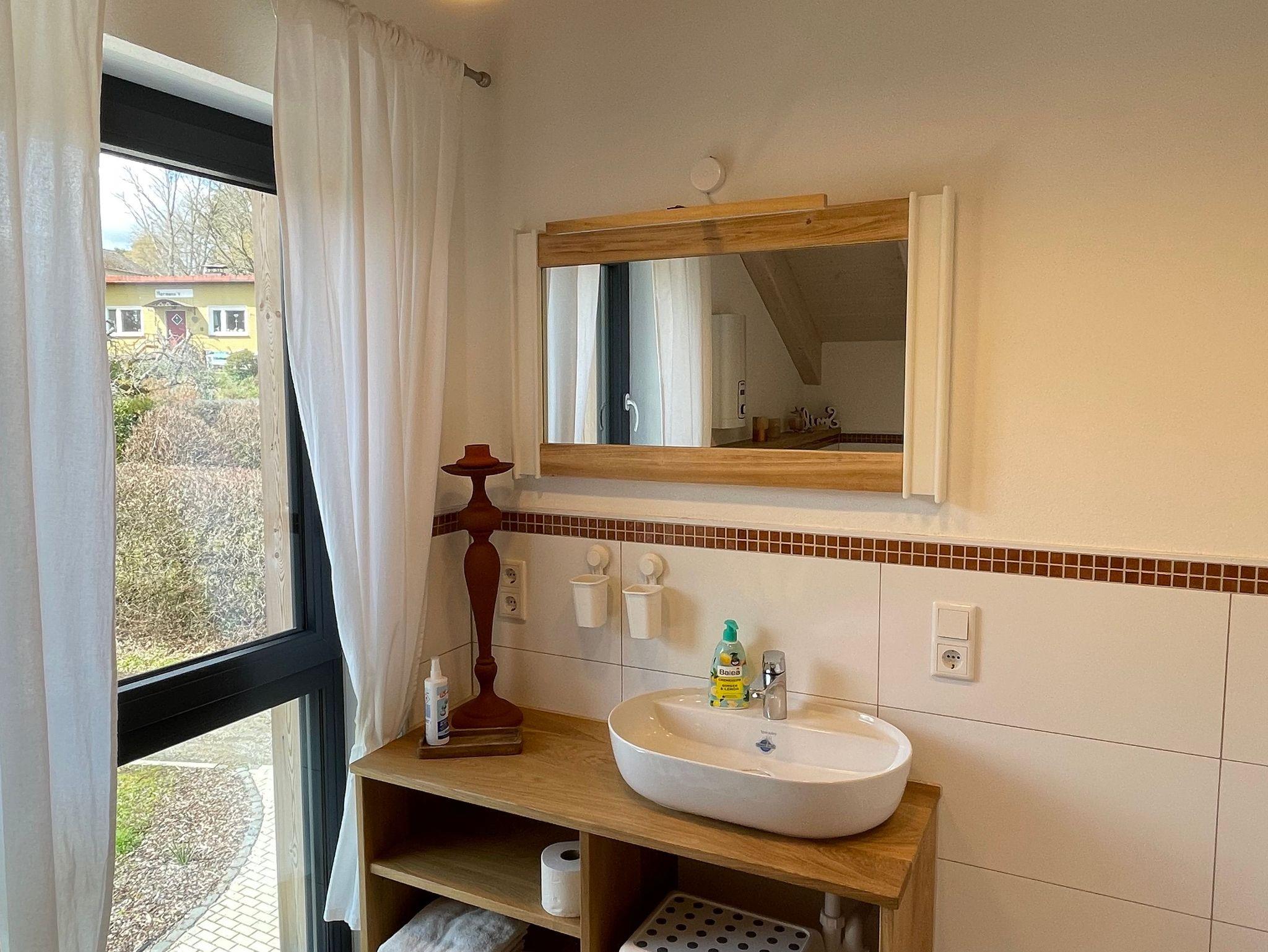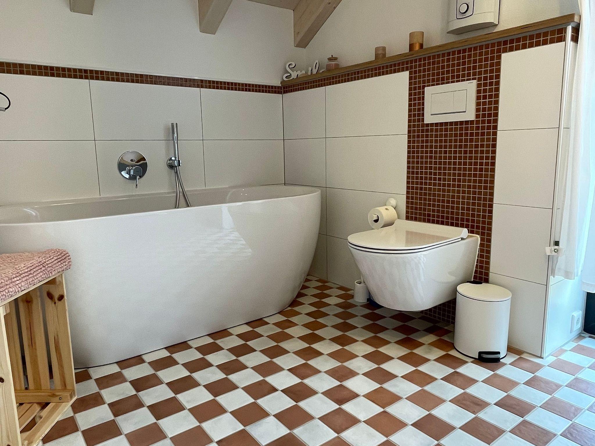 Im Obergeschoß befindet sich ein zweites Bad mit Badewanne und zwei Ruheräume, einer davon mit eigenem Balkon und Blick vom Bett ins Grün.