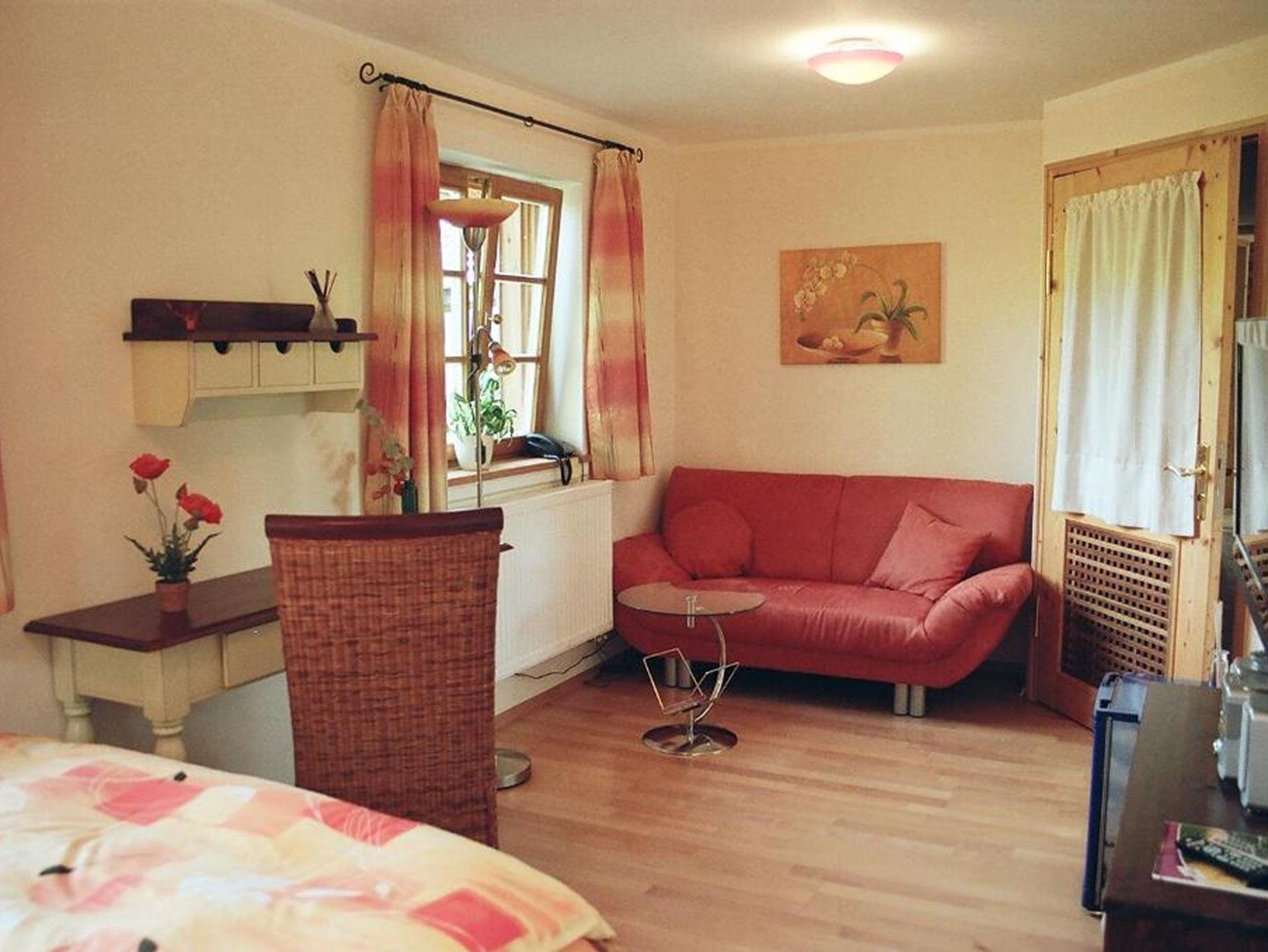 UDie Empore I ist unser kleinstes Ferienzimmer. Dieses Einzelzimmer bietet auf ca. 16 qm jeglichen Komfort, der bei 5 Sternen selbstverständlich ist. Hierzu kommen die wohlige Wärme und Liebe, die nicht nur die Farben ausstrahlen, sondern sich auch im Interieur wiederspiegeln. Zur Entspannung können Sie den Flat-Screen Fernseher mit DVD Player entweder zum 140 cm breitem, handgefertigten Bett oder zur Kuschelcouch hin schwenken. Die Nachmittags- und Abendsonne durchflutet diese Zimmer mit seinen Strahlen. Das sonnengelbe WC liegt separat auf den Gang. Leider müssen wir die Gäste dieses Zimmers bitten, die Duschen im Wellnessbereich zu nutzen. In der Gemeinschaftsküche können Sie Ihr Essen zubereiten. Das paradiesische Verwöhnfrühstück können Sie sich auch auf Wunsch von uns zubereiten lassen und im Frühstücksraum einnehmen.