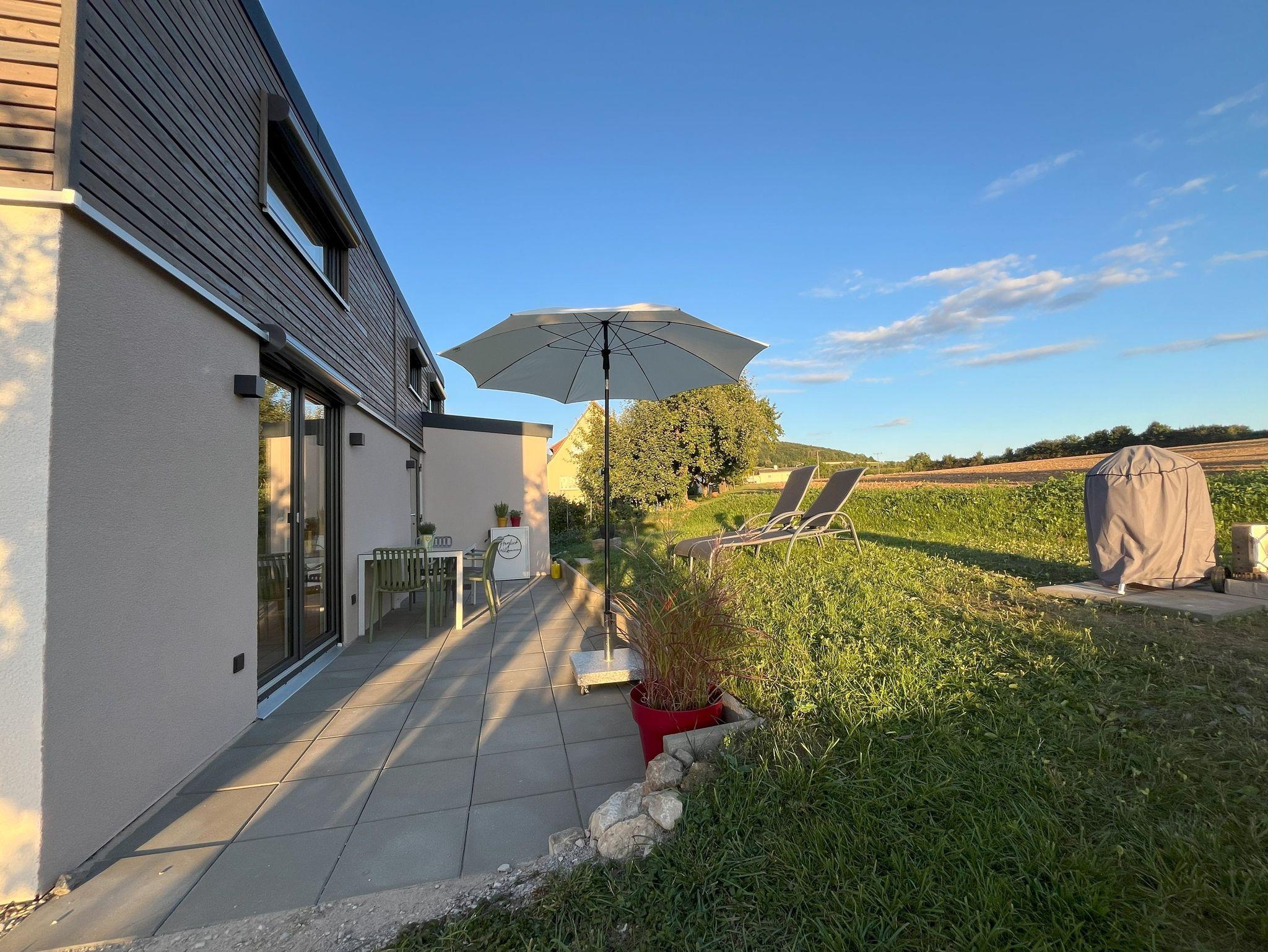 Hier kann man mitten in wunderschöner Natur, umgeben von Feldern, Wiesen und Obstbäumen mit wunderschöner Aussicht auf die lange Meile und nach Eggolsheim, an einem perfekten Ort zum Entspannen und Erholen, Ferien machen.