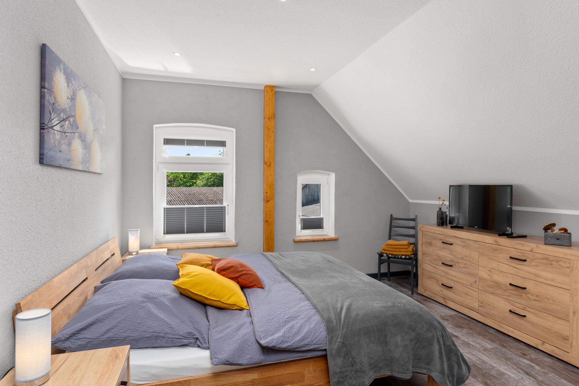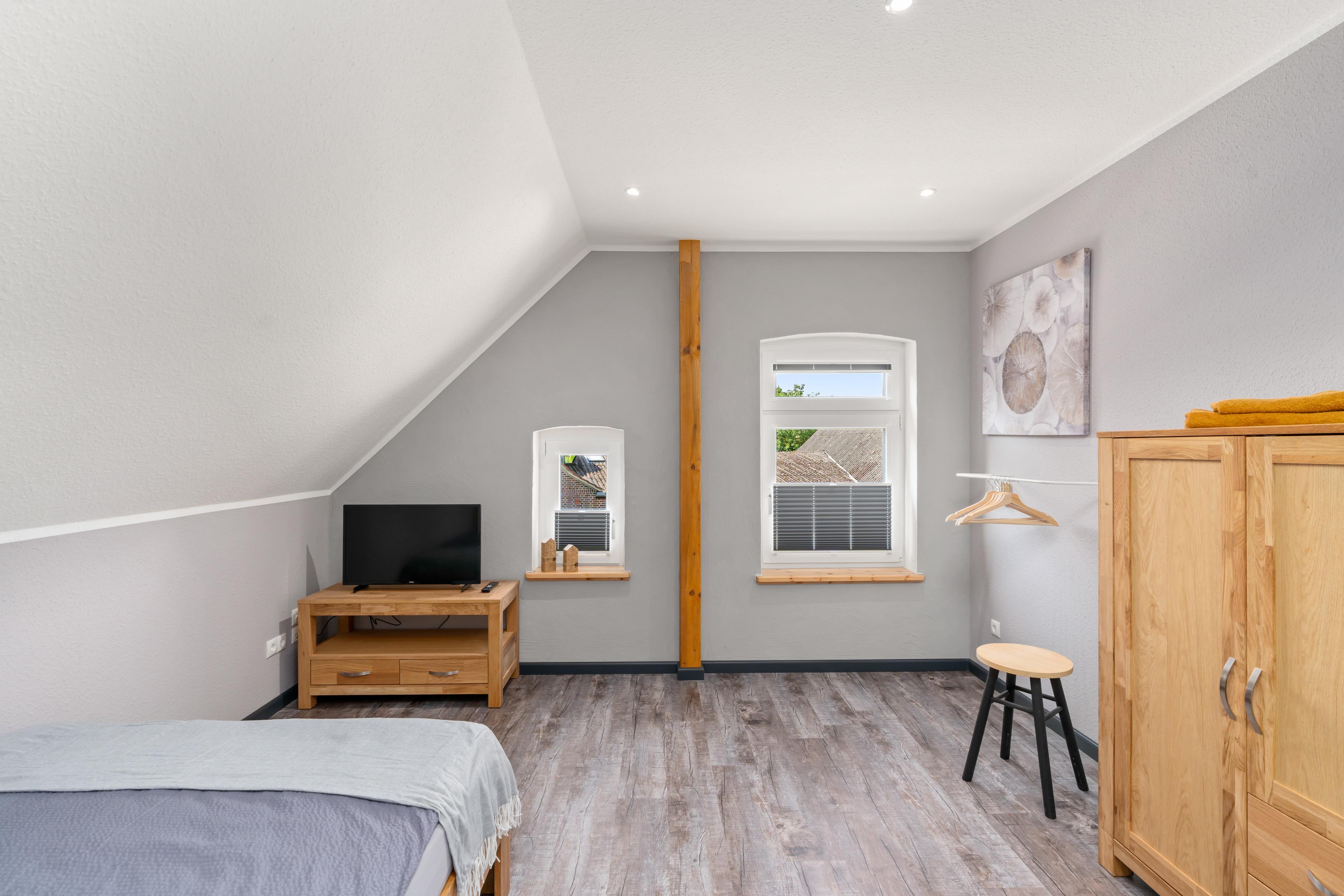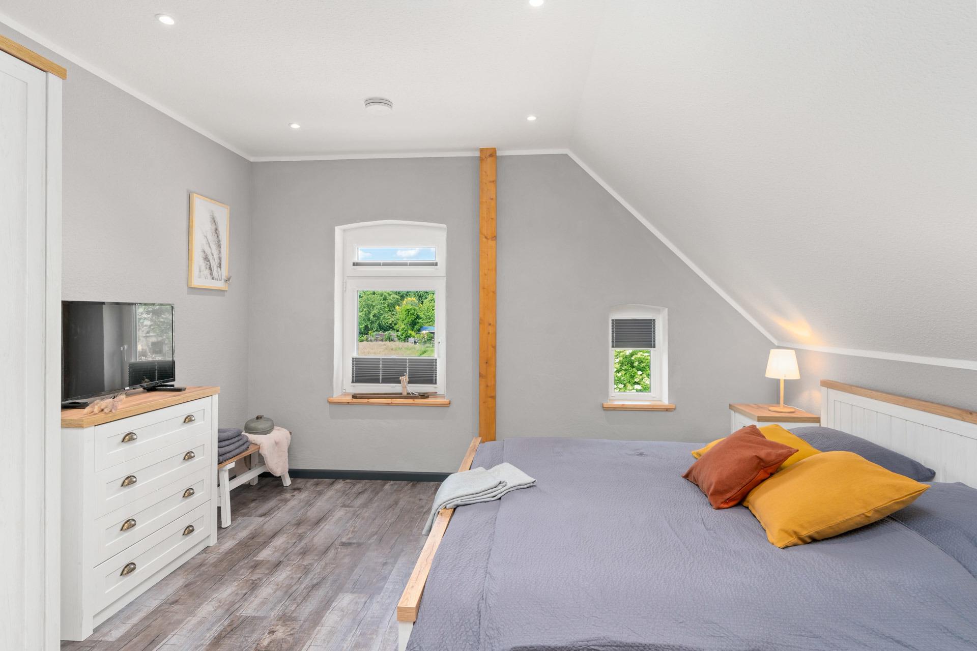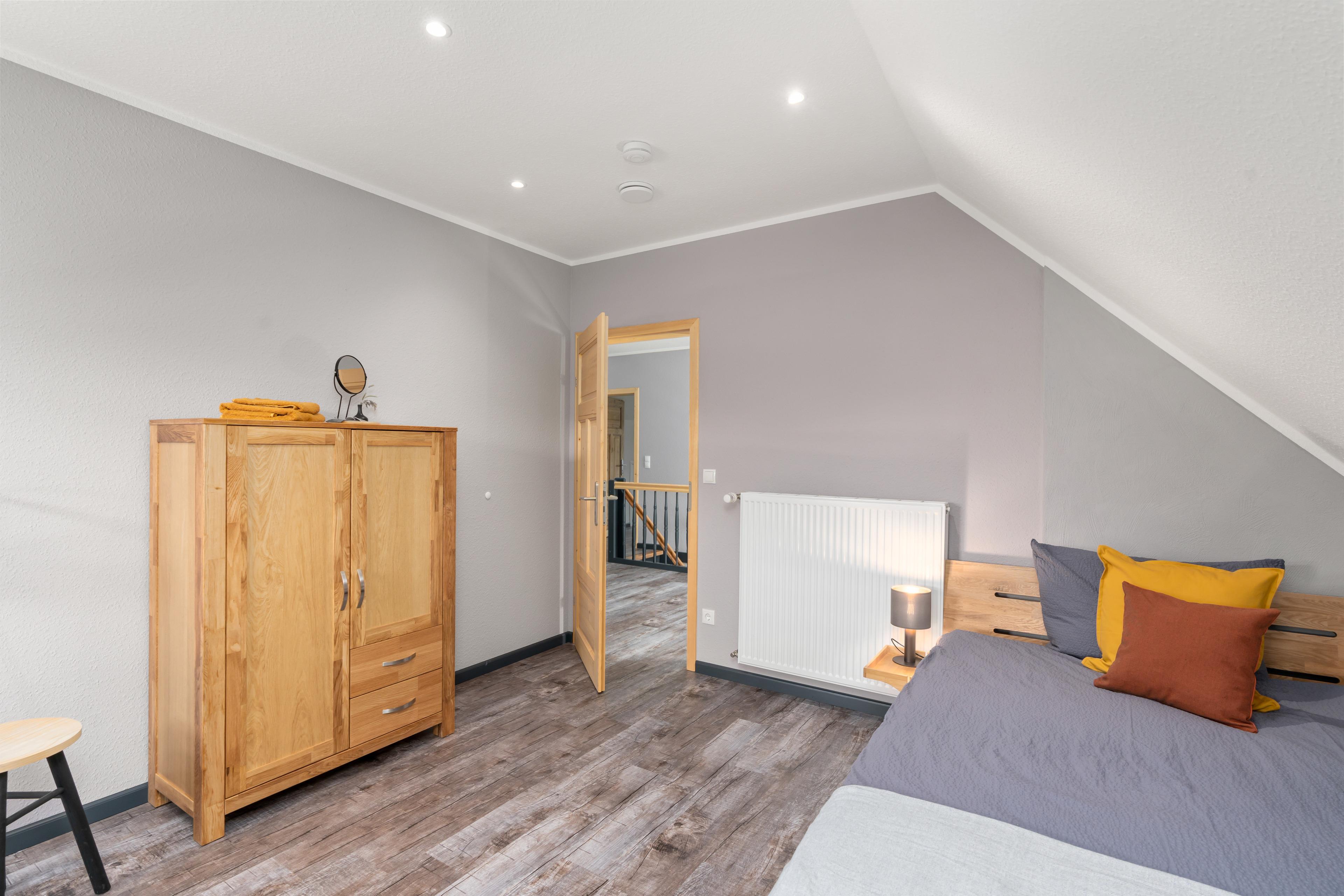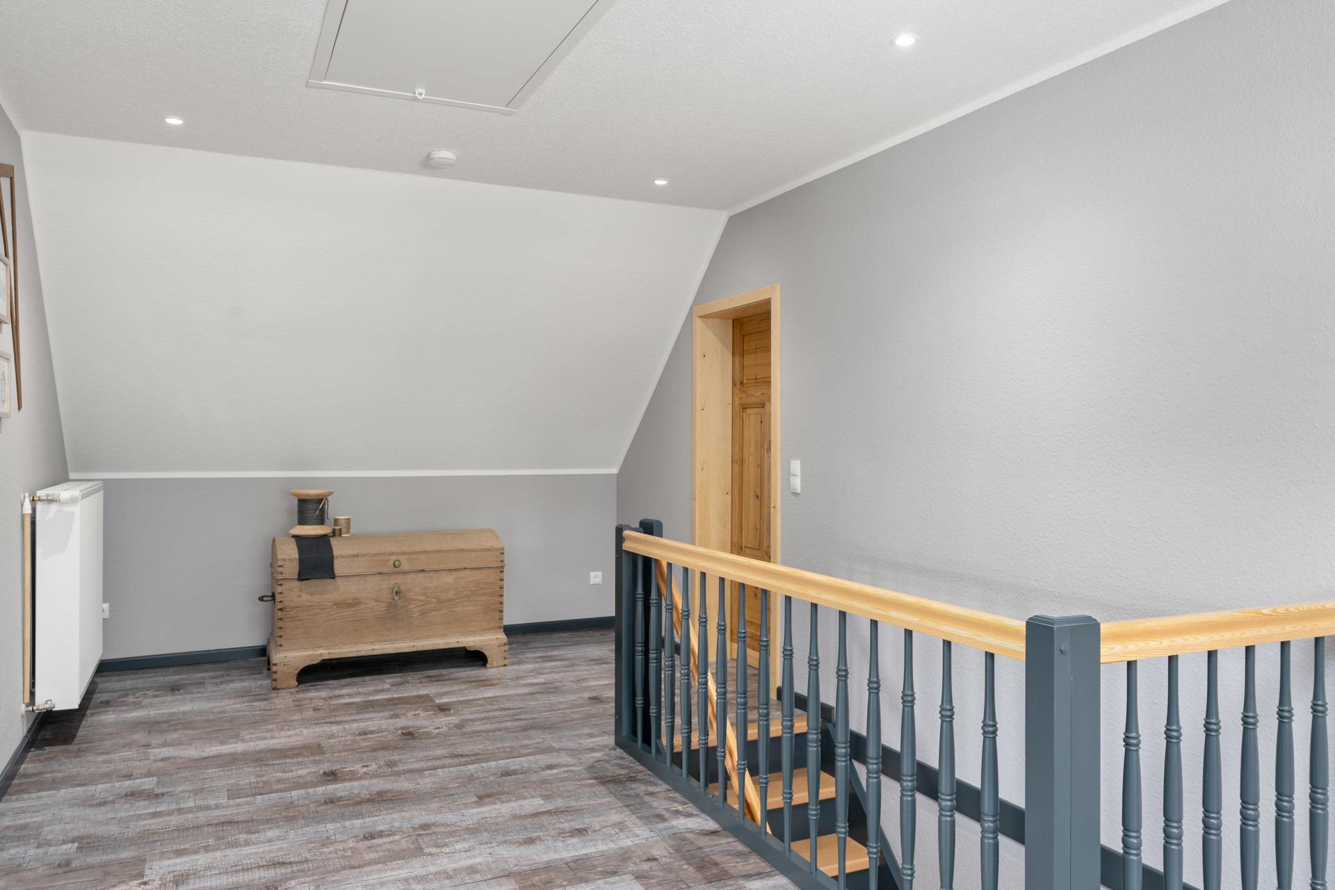 Im Obergeschoss gibt es drei Schlafzimmer: Das erste Schlafzimmer hat ein 1,40 m breites Bett, das zweite Schlafzimmer ein 1,80 m breites Doppelbett und das dritte Schlafzimmer ebenfalls ein 1,80 m breites Doppelbett. Außerdem gibt es ein Badezimmer mit Dusche und WC sowie einen gemütlichen Flur mit Leseecke.