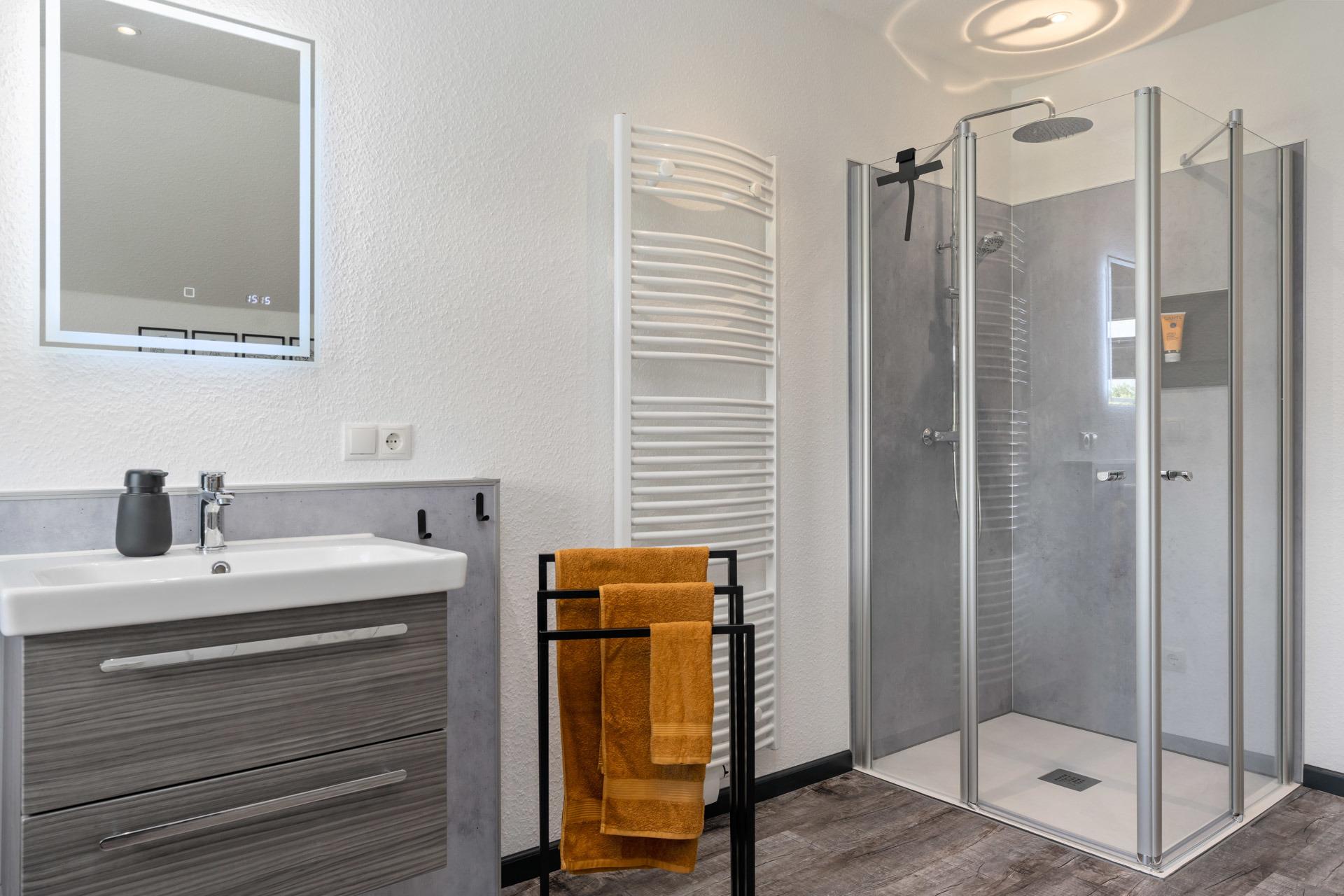 Es ist eine kontrollierte Be- und Entlüftung im Haus verbaut und ein Gasheizung sorgt für warmes Wasser und hält das Haus warm.