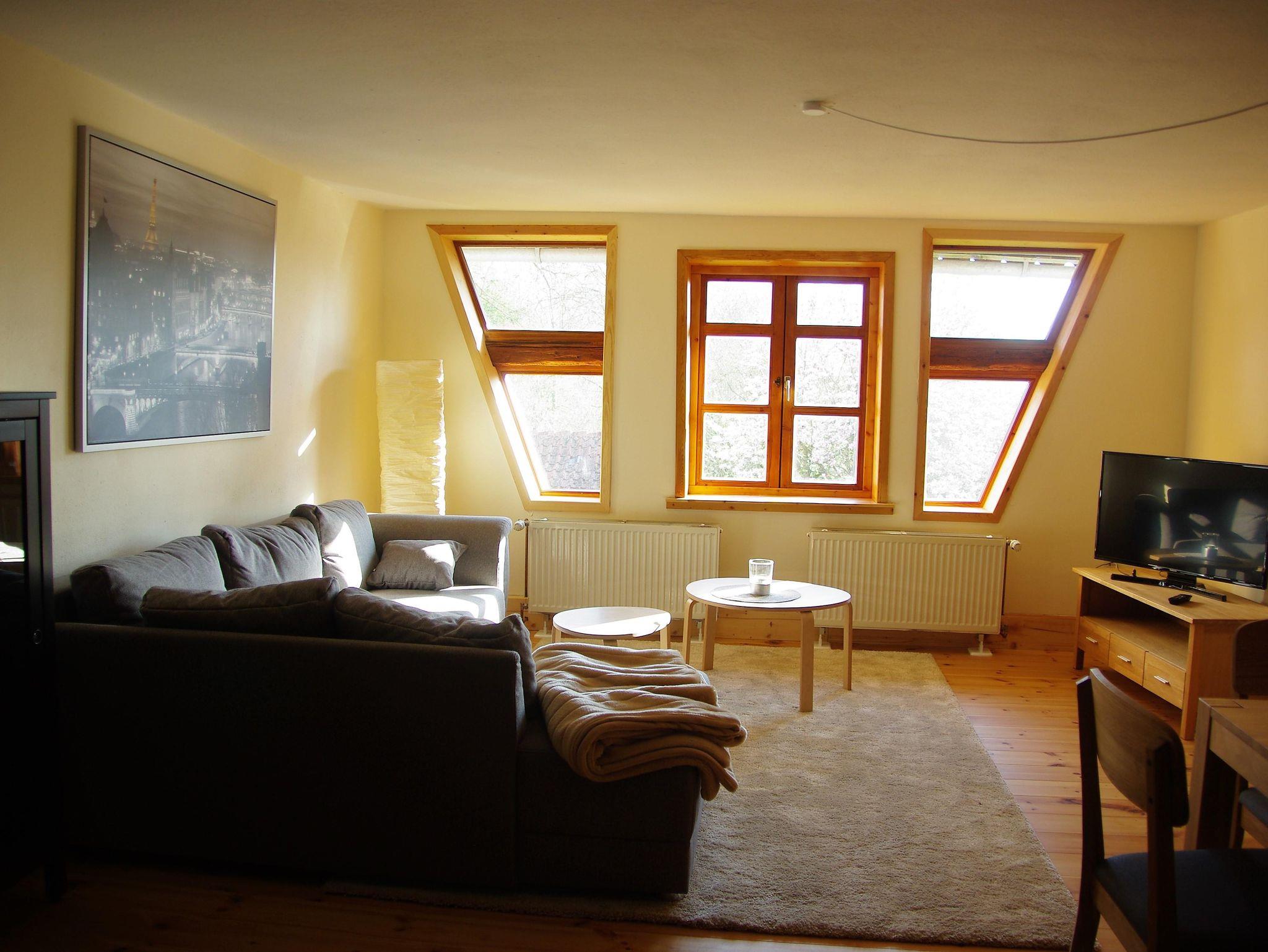 Die Wohnung liegt im 1.Stock des Hauses und ist 90 m² groß. Über einen Innentreppe erreichen Sie 2 separate Schlafräume, ein Wohnzimmer mit kombinierter Essecke und Wohnküche, ein Badezimmer mit Dusche und einem kleinem Balkon.