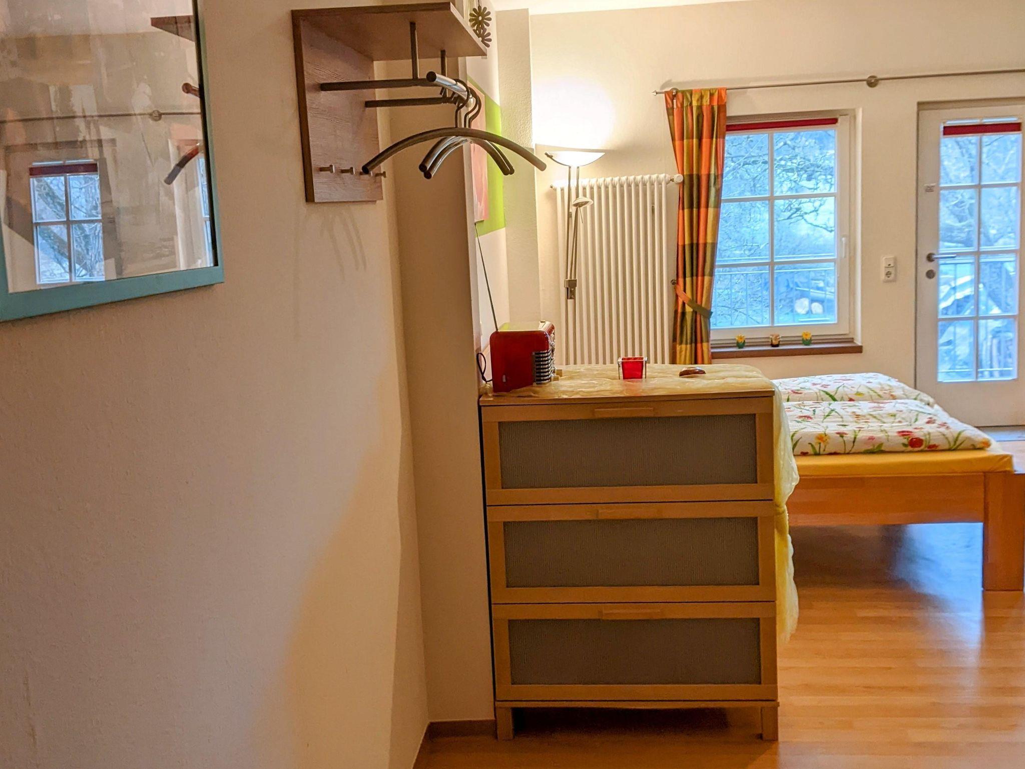 Auf ca. 40 m² mit separatem Eingang steht Ihnen ein heller Wohn- und Schlafraum mit komplett eingerichteter Küchenzeile, TV und Kompaktanlage, Bad mit Dusche und WC und ein großer Balkon (5 x 1,5 m) zur Verfügung.