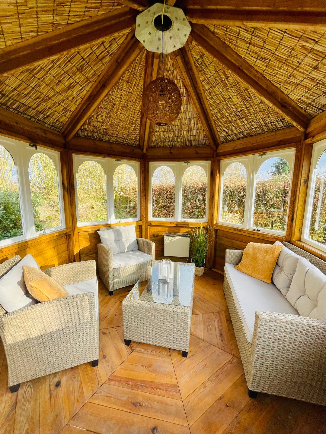 Für aktive Urlauber steht eine E-Bike Ladestation im Carport zur Verfügung. Die Terrasse mit Gartenmöbeln, Grill und Sonnenschirm lädt zum Entspannen im Freien ein, während der großzügige Garten mit Strandkorb und Gartenlaube zum Verweilen einlädt.