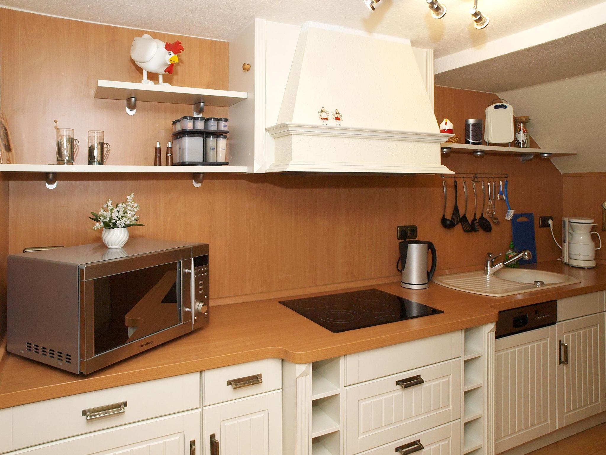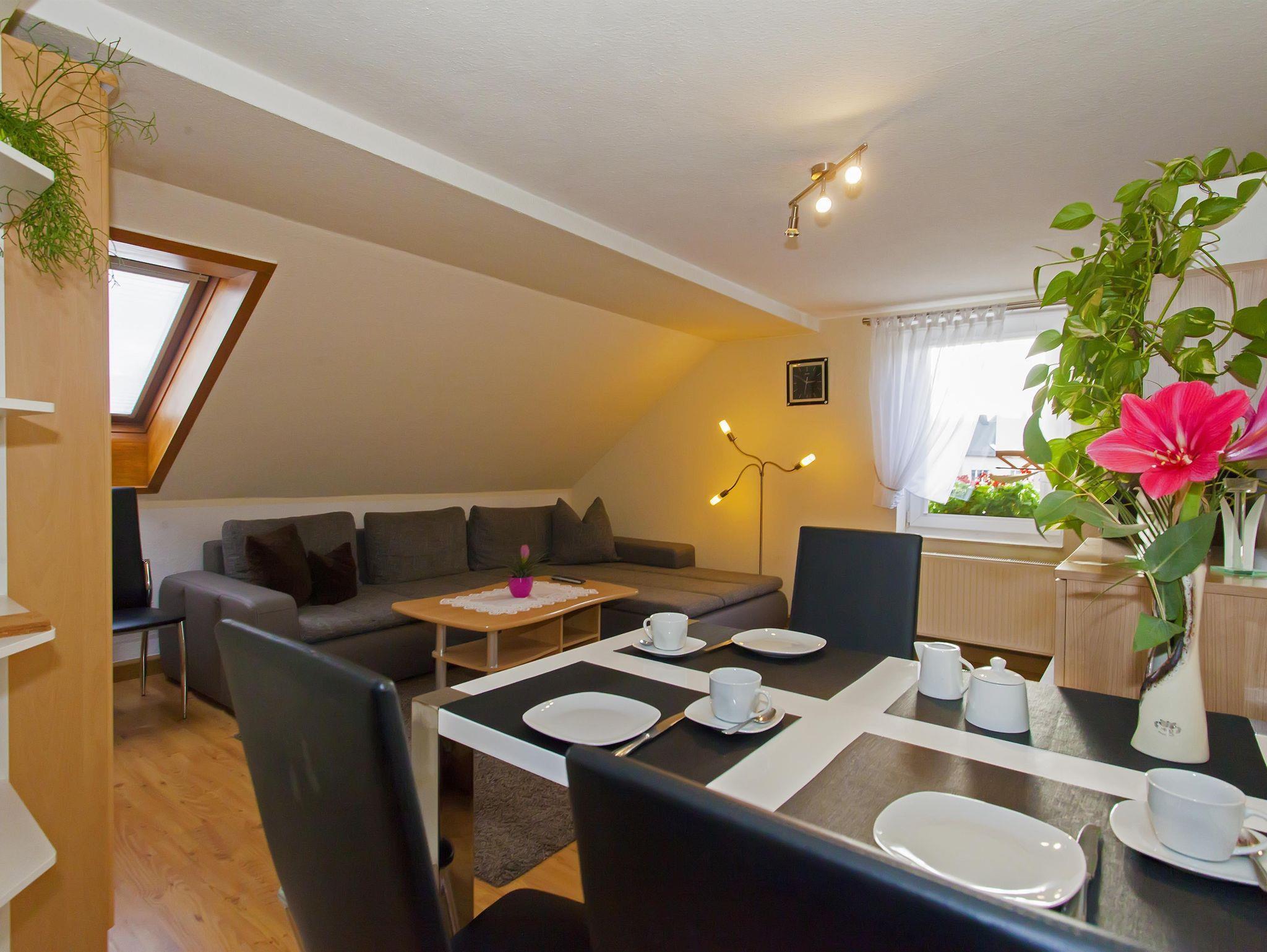 Unsere 50 m² große Ferienwohnung (Nichtraucher) für 2 Personen verfügt über ein modern eingerichtetes Schlafzimmer (Doppelbett), Wohnzimmer, TV, W-LAN, Küchenzeile - komplett ausgestattet mit Geschirr, Kochgelegenheit, Kühl-Gefrierkombination und Mikrowelle, Bad mit Badewanne/WC , 1 Flasche Wasser und Obst zur Begrüßung, 2 Aufbettungen möglich, Frühstück auf Anfrage, Haustiere auf Anfrage.