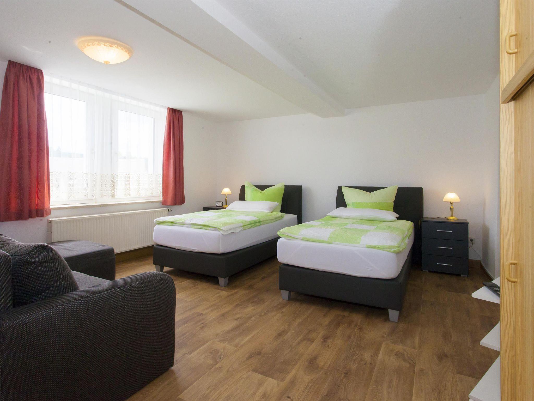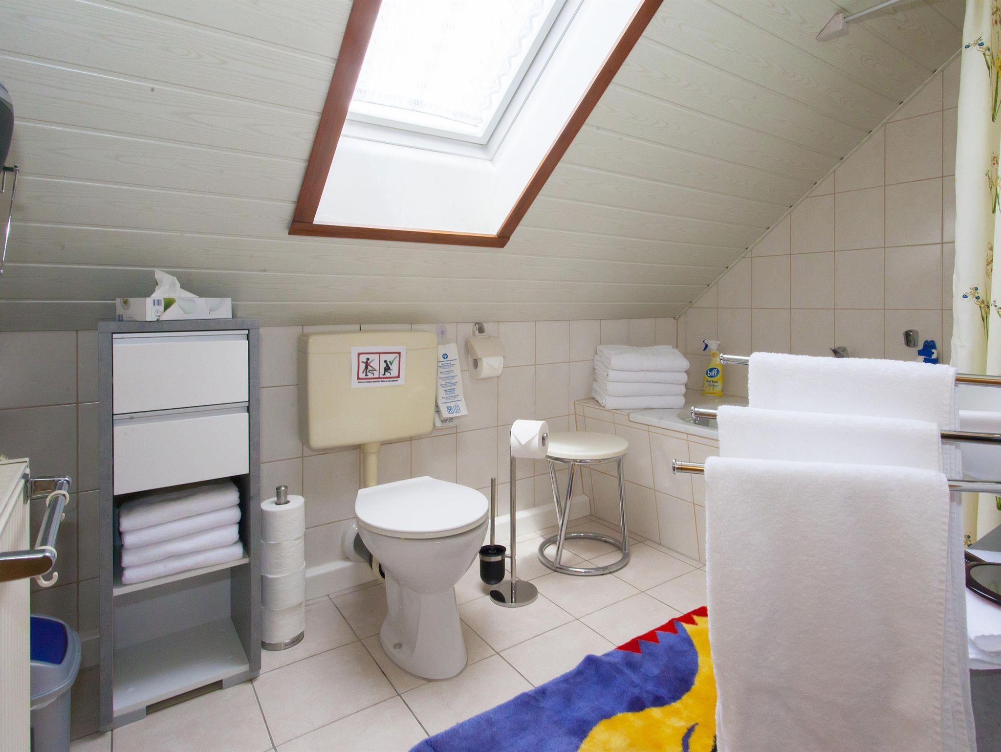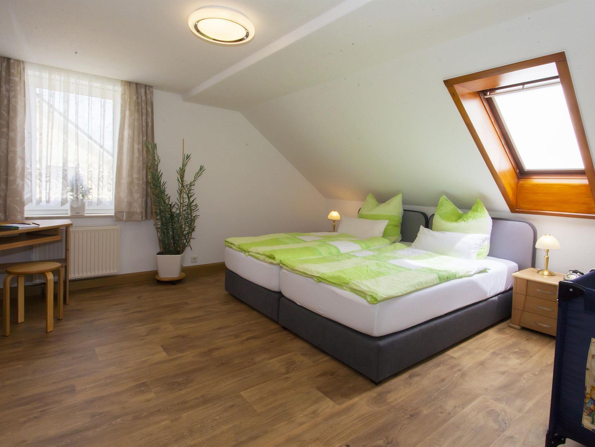 Unsere neue 75 m² große Ferienwohnung (Nichtraucher) befindet sich im 2. Stock unseres Hauses. Sie verfügt über ein Schlafzimmer mit 2 Boxspringbetten, Kuschelecke und großen TV, ein 2. Schlafzimmer mit 2 Boxspringbetten und Schreibtisch, Wohnküche mit TV. W-LAN Anschluß in allen Räumen. Küche komplett ausgestattet mit Geschirr, Kühlschrank, Herd mit Ceranfeld, Mikrowelle, Geschirrspüler u. Wasserkocher. Bad mit Badewanne, WC, Föhn und für Babys WC -Erhöhung und Babytopf. Handtücher, Bettwäsche, Babybett und Babystuhl sind vorhanden. Frühstück auf Anfrage, Haustiere auf Anfrage, 1 Flasche Wasser und Obst zur Begrüßung.