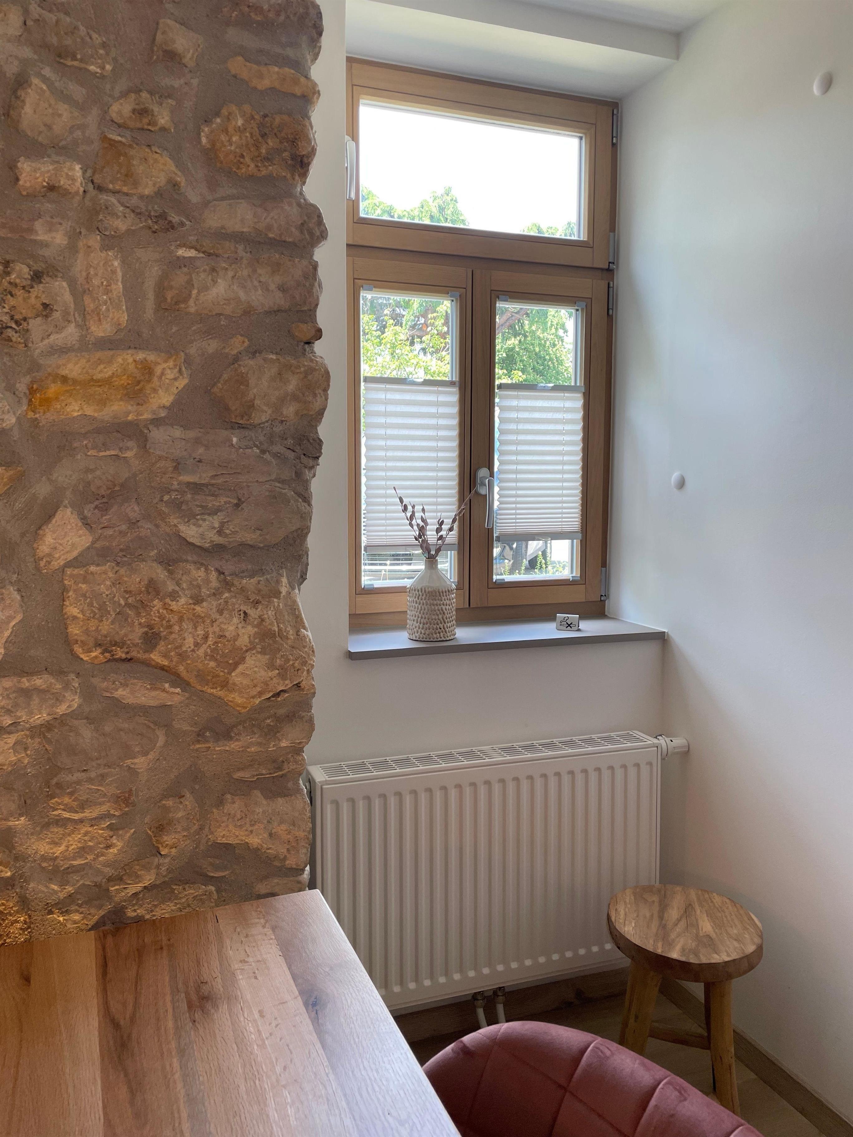 Ein Teil der freigelegten Stadtmauer aus dem Jahr 1330, nach historischem Vorbild geschreinerte Eichenfenster und aufgearbeitete Fachwerkstreben verdeutlichen den Charme der alten Zeiten.