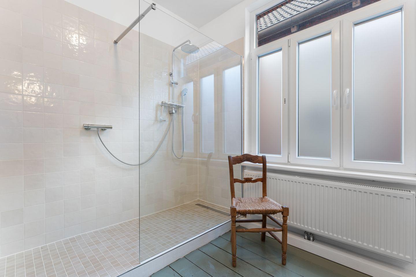 Das Badezimmer ist modern und durchdacht: eine große, begehbare Dusche mit clever installierter Armatur, die sich bedienen lässt, ohne dass man gleich nass wird – für einen entspannten Start in den Tag. Föhn und Kosmetikspiegel sind selbstverständlich vorhanden.