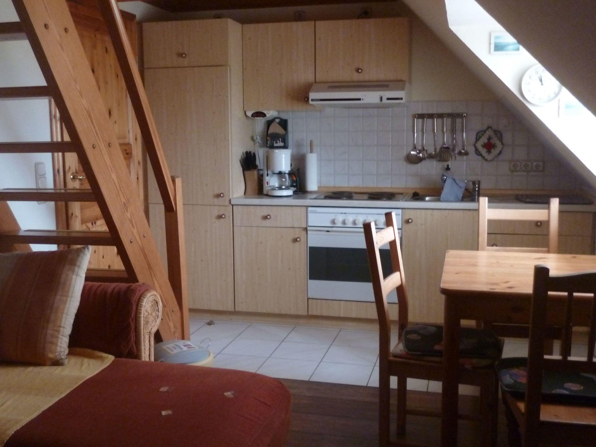 Flat in the holiday home The flat Dear guests, you can expect a lovingly furnished flat with an open-plan bedroom in a somewhat Nordic style and fully equipped. Your beds are already made when you move in. You have a view over meadows and fields and you might even spot a few deer and rabbits. You can relax in our natural garden, sit in the sun or have a barbecue. In the evening, you can gaze at the endless starry sky. Because nothing obscures your view here, except the clouds. Excursions
