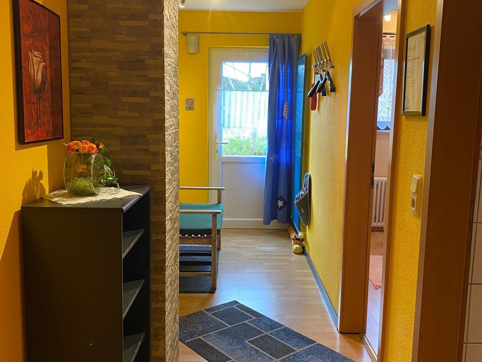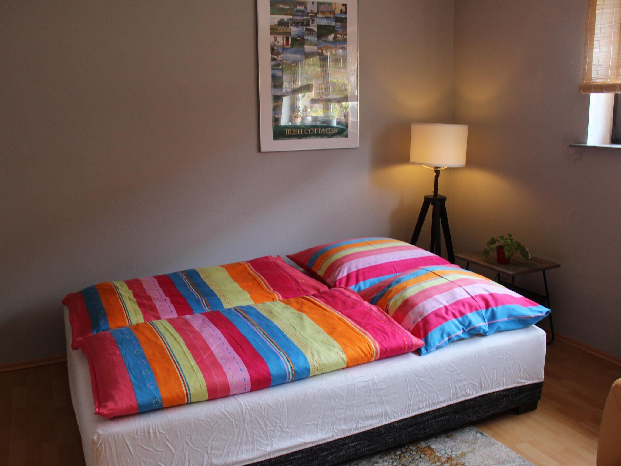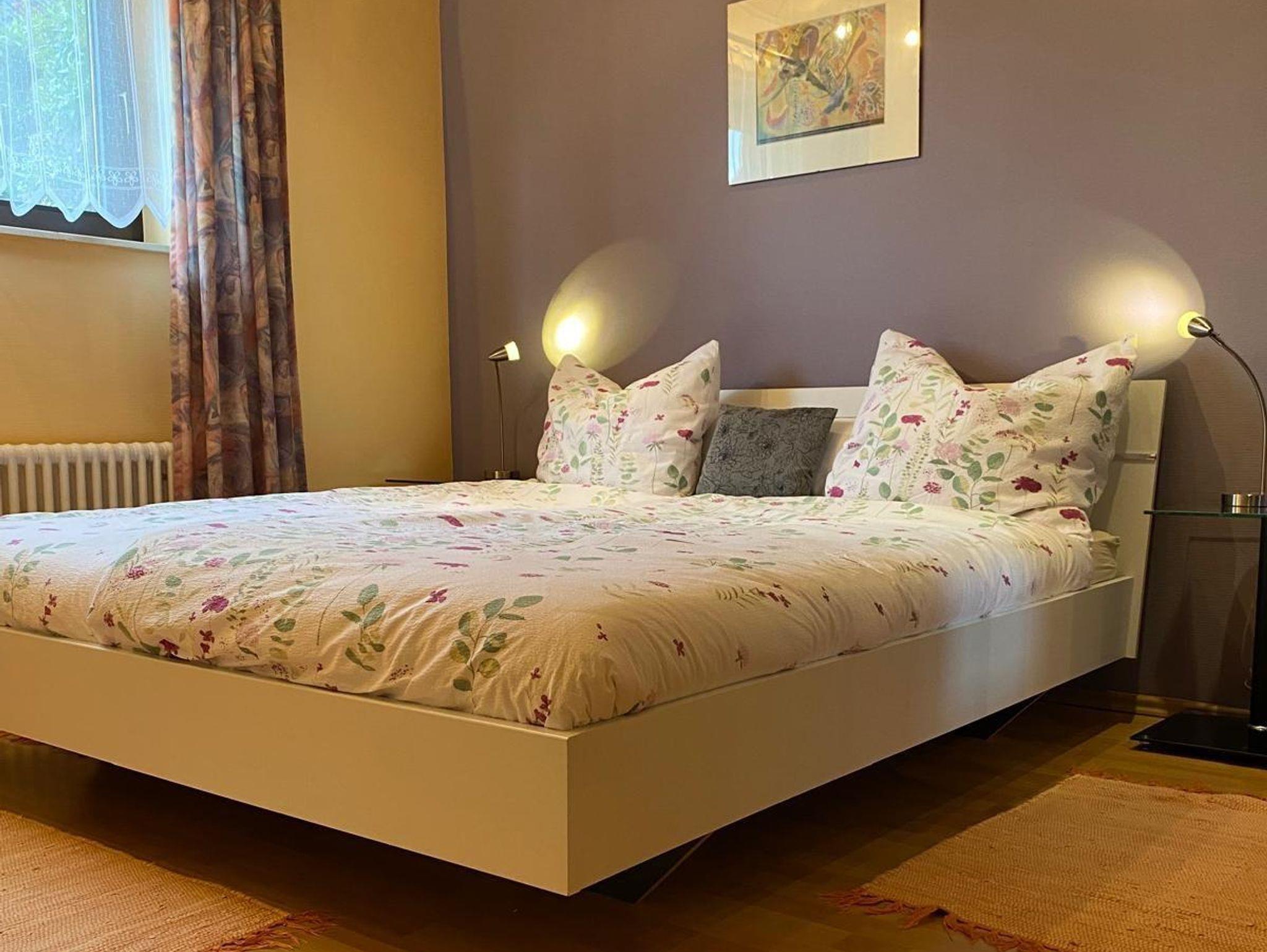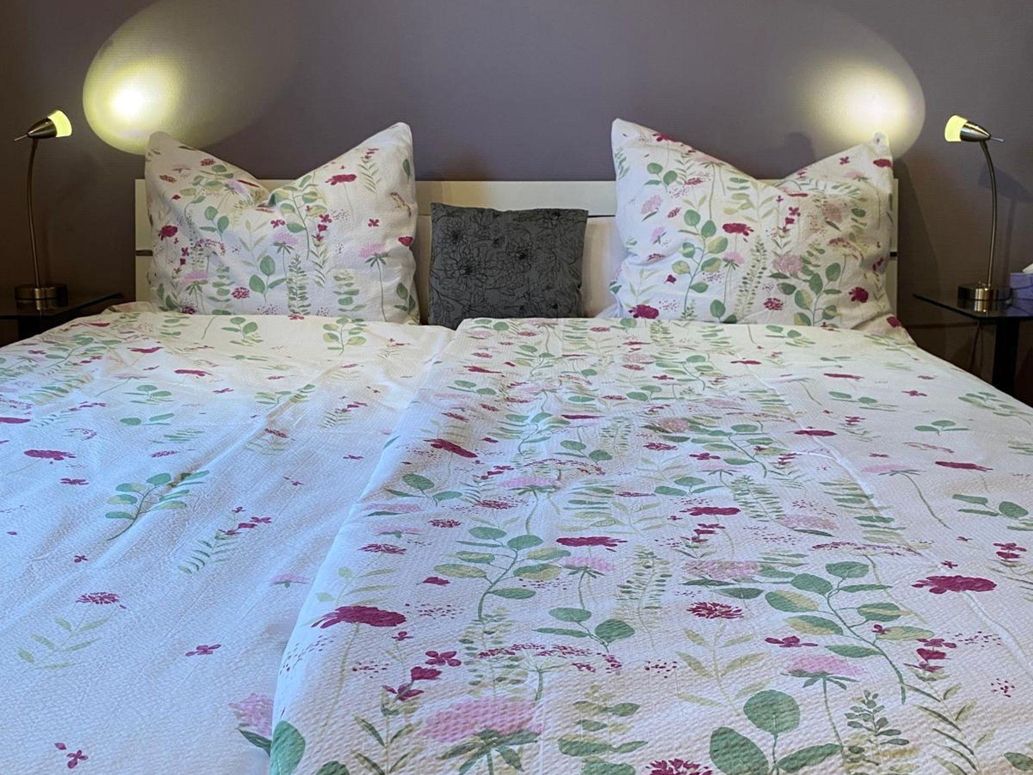 Unsere gemütliche Ferienwohnung ist 60 qm gross. Ein grosses Wohnzimmer mit intergrierter voll ausgestatteter Küche samt Esstheke und einem zusätzlichen Essplatz lädt zum Verweilen ein. Im Raumteiler gibt es ein Radio, Bücher und Spiele. TV und DVD Player sowie kostenloser Internetzugang stehen bereit. Das Schlafzimmer ist mit Doppelbett, Nachtkonsolen, kleiner Kommode und geräumigem Kleiderschrank und Bettwäsche ausgestattet, Platz für ein Reisebett ist auch noch. Das modern eingerichtete Badezimmer punktet mit Badewanne incl. Duschtrennwand, Waschtisch, Toilette und Hand- und Duschtüchern.
