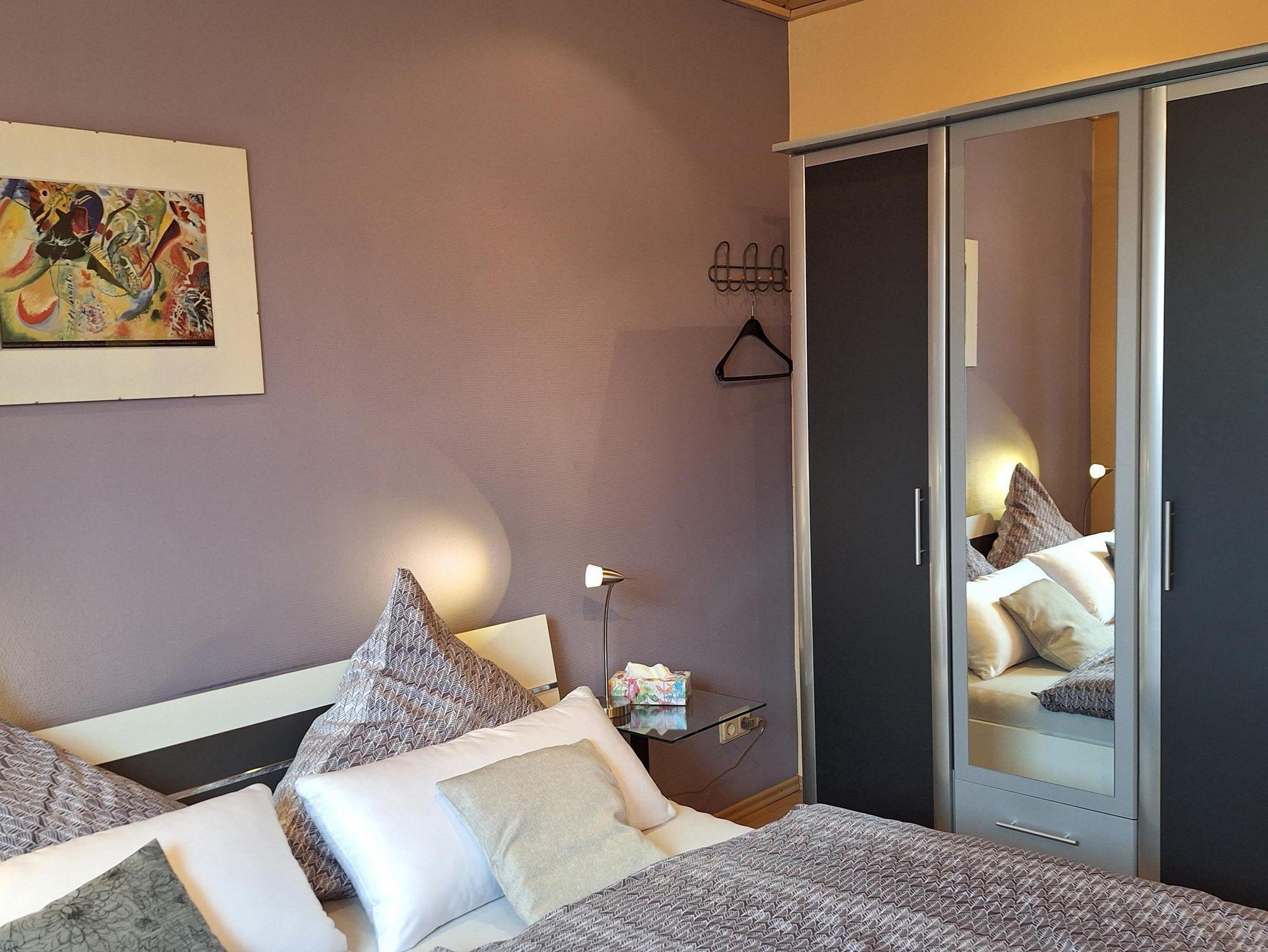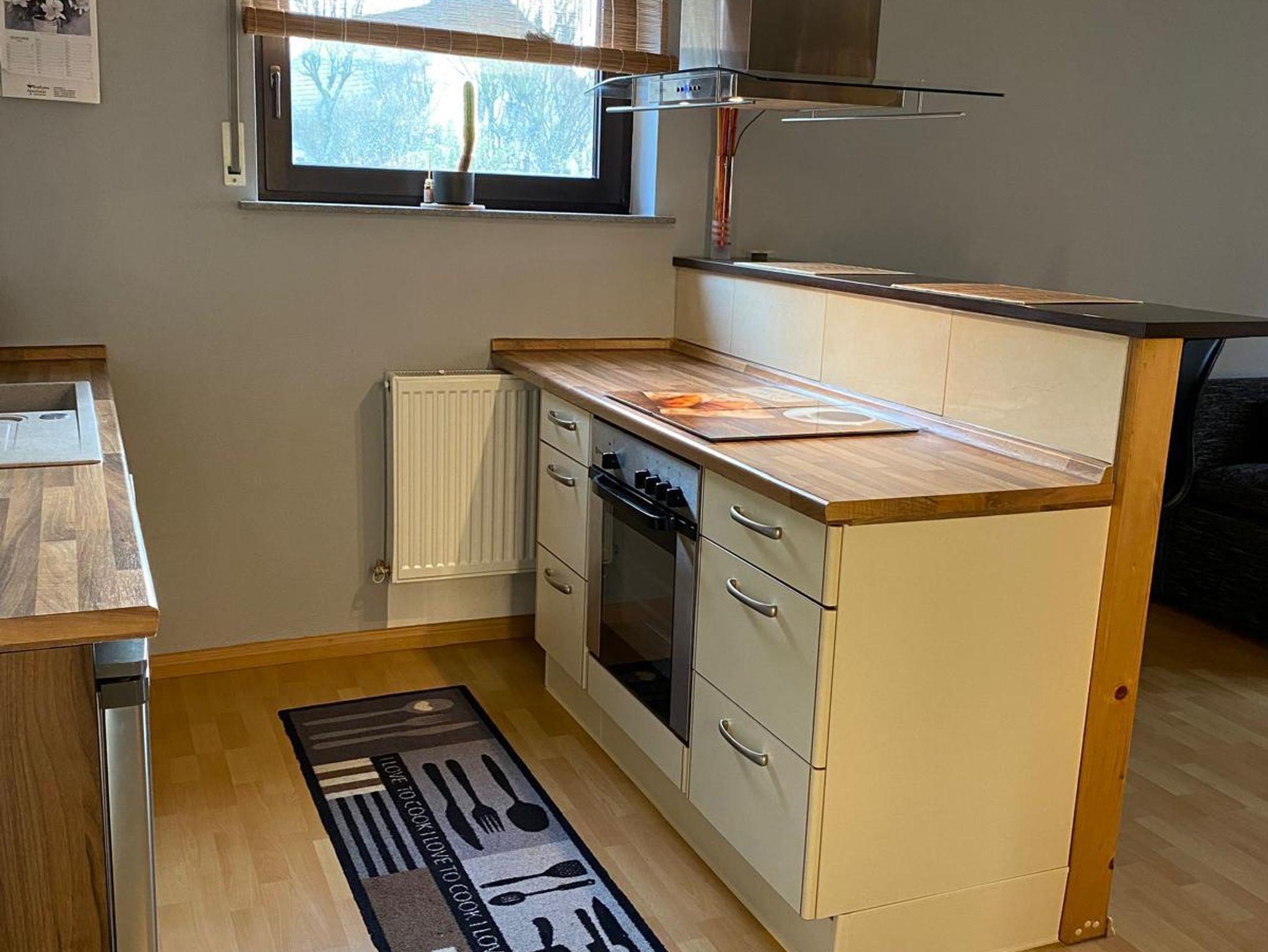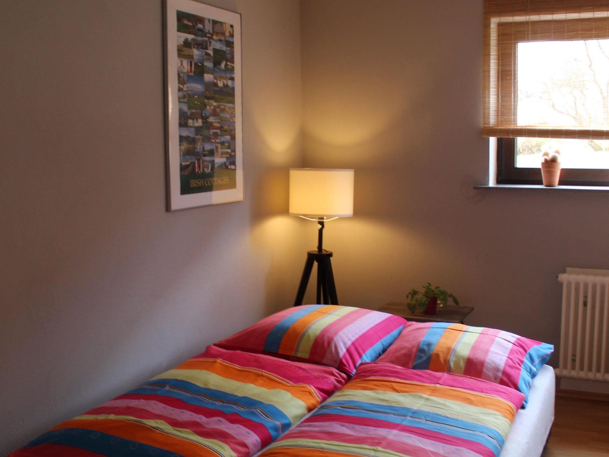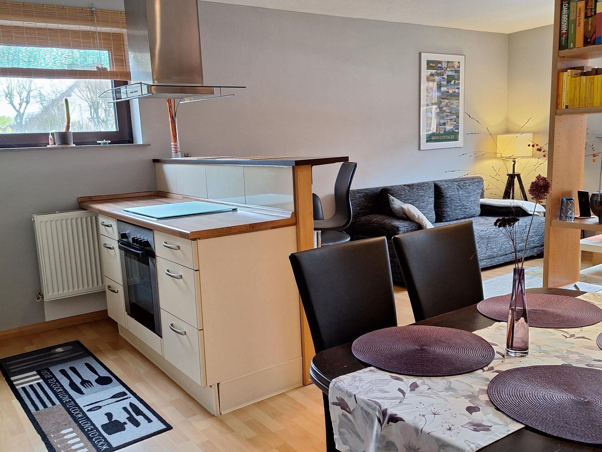 Unsere gemütliche Ferienwohnung ist 60 qm gross. Ein grosses Wohnzimmer mit intergrierter voll ausgestatteter Küche samt Esstheke und einem zusätzlichen Essplatz lädt zum Verweilen ein. Im Raumteiler gibt es ein Radio, Bücher und Spiele. TV und DVD Player sowie kostenloser Internetzugang stehen bereit. Das Schlafzimmer ist mit Doppelbett, Nachtkonsolen, kleiner Kommode und geräumigem Kleiderschrank und Bettwäsche ausgestattet, Platz für ein Reisebett ist auch noch. Das modern eingerichtete Badezimmer punktet mit Badewanne incl. Duschtrennwand, Waschtisch, Toilette und Hand- und Duschtüchern.