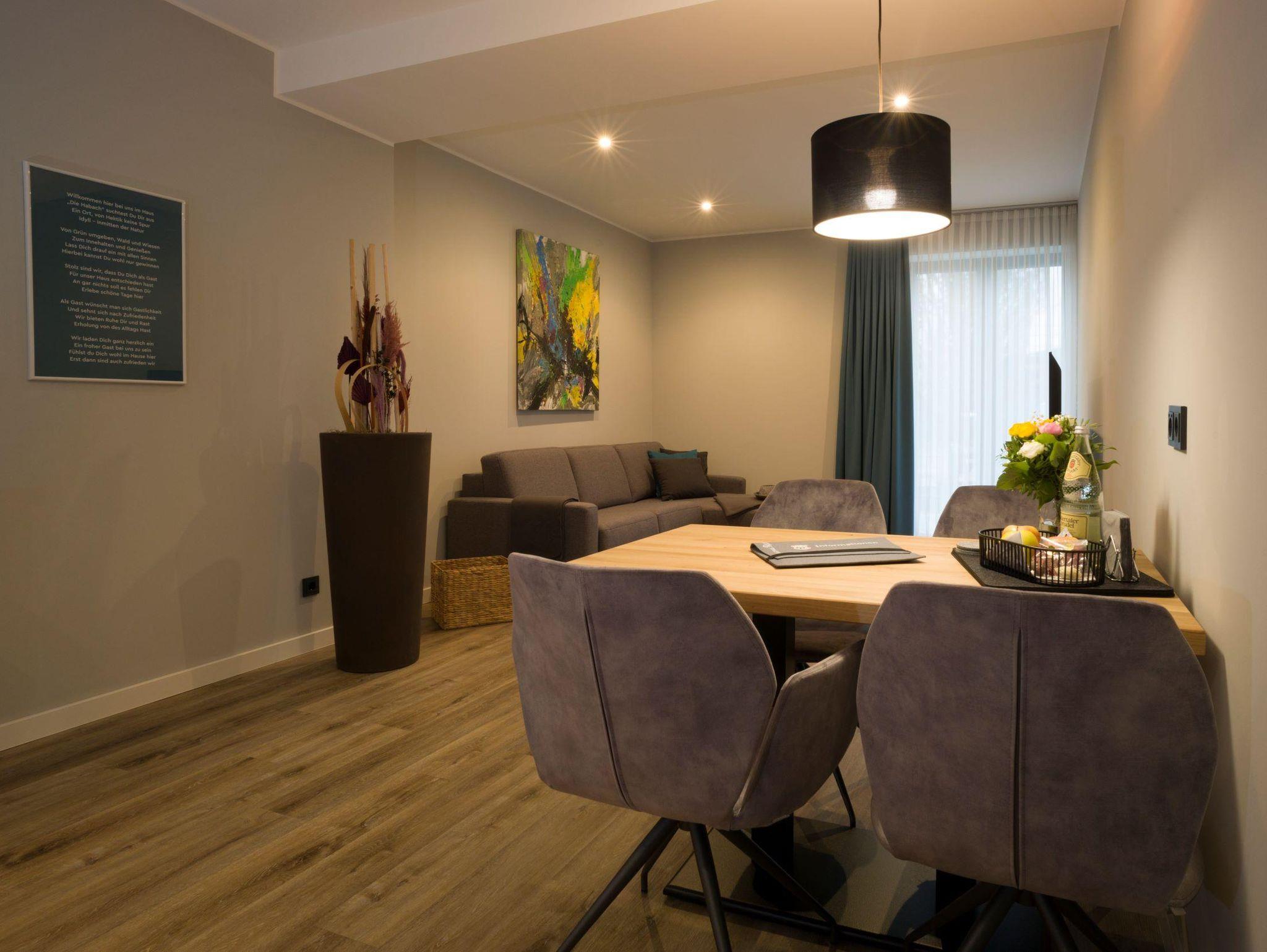In unseren DTV 5 Sterne klassifizierten nachhaltigen und barrierefreien Ferienappartements bieten wir Ihnen eine private Atmosphäre und herzlichen Rundumservice. Die 45 m² großen Appartements für 1-2 Personen bestehen aus einem offenen Wohn-Essbereich mit komplett ausgestatteter Küche, einem Schlafzimmer mit Doppelbett sowie einem großzügigen Badezimmer. Die angeschlossene Terrasse verfügt über Gartenmöbel und einen Sonnenschirm. Des Weiteren gibt es eine große Minibar im Eingangsbereich, eine Sauna zur gemeinschaftlichen Nutzung, kostenfreies WLAN im ganzen Haus und PKW-Stellplätze direkt vor der Tür. Gerne können Sie kosmetische Behandlungen, Wäscheservice, Brötchenservice, Roomservice und alle weiteren Leistungen in/von unserem Restaurant sowie Fahrdienste in Anspruch nehmen. Wir freuen uns auf Ihren Besuch!