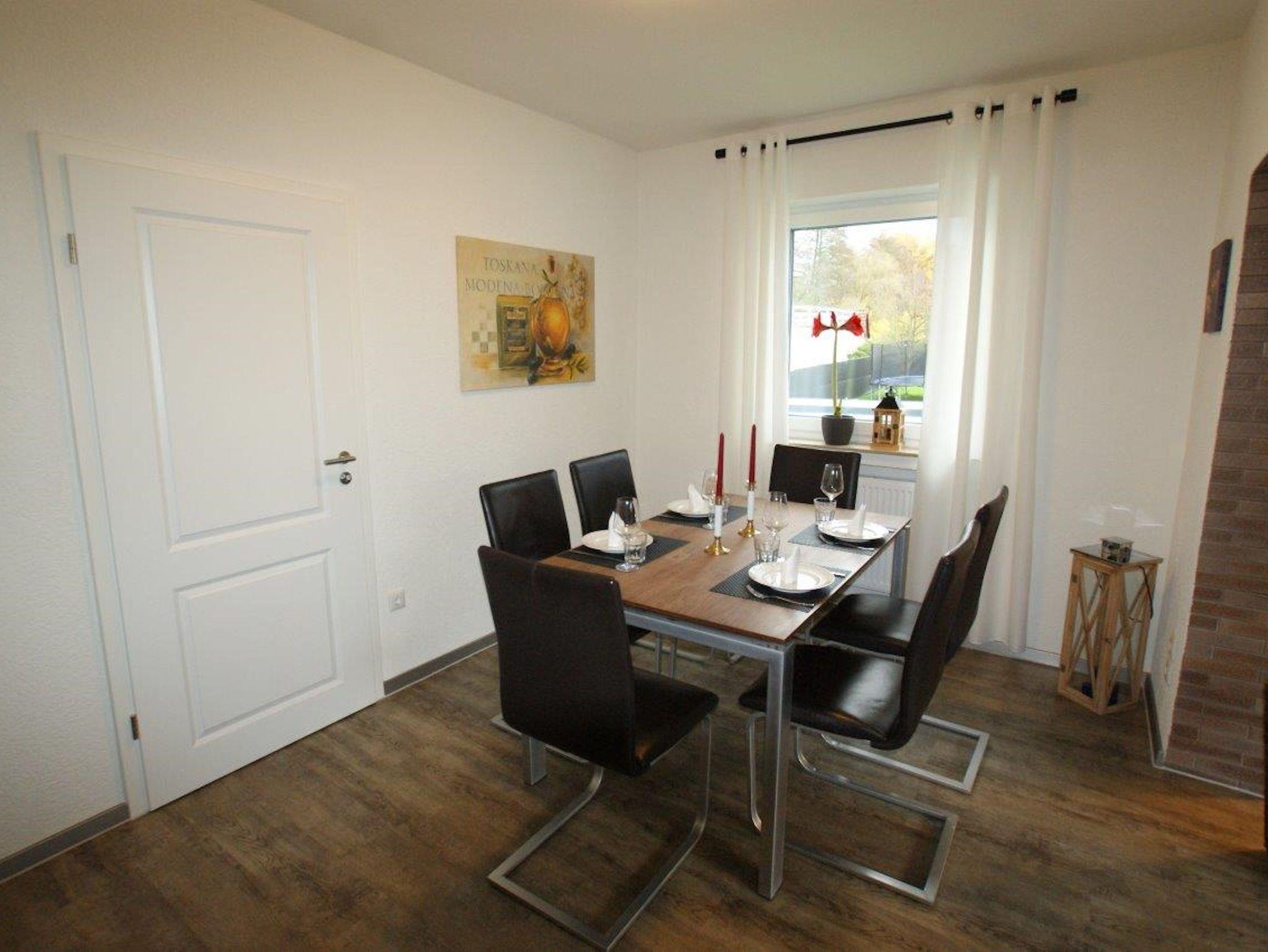 Von der Küche gelangen Sie in das Esszimmer mit Kommode, Tisch und 6 bequemen Stühlen und in das verbundene Wohnzimmer.