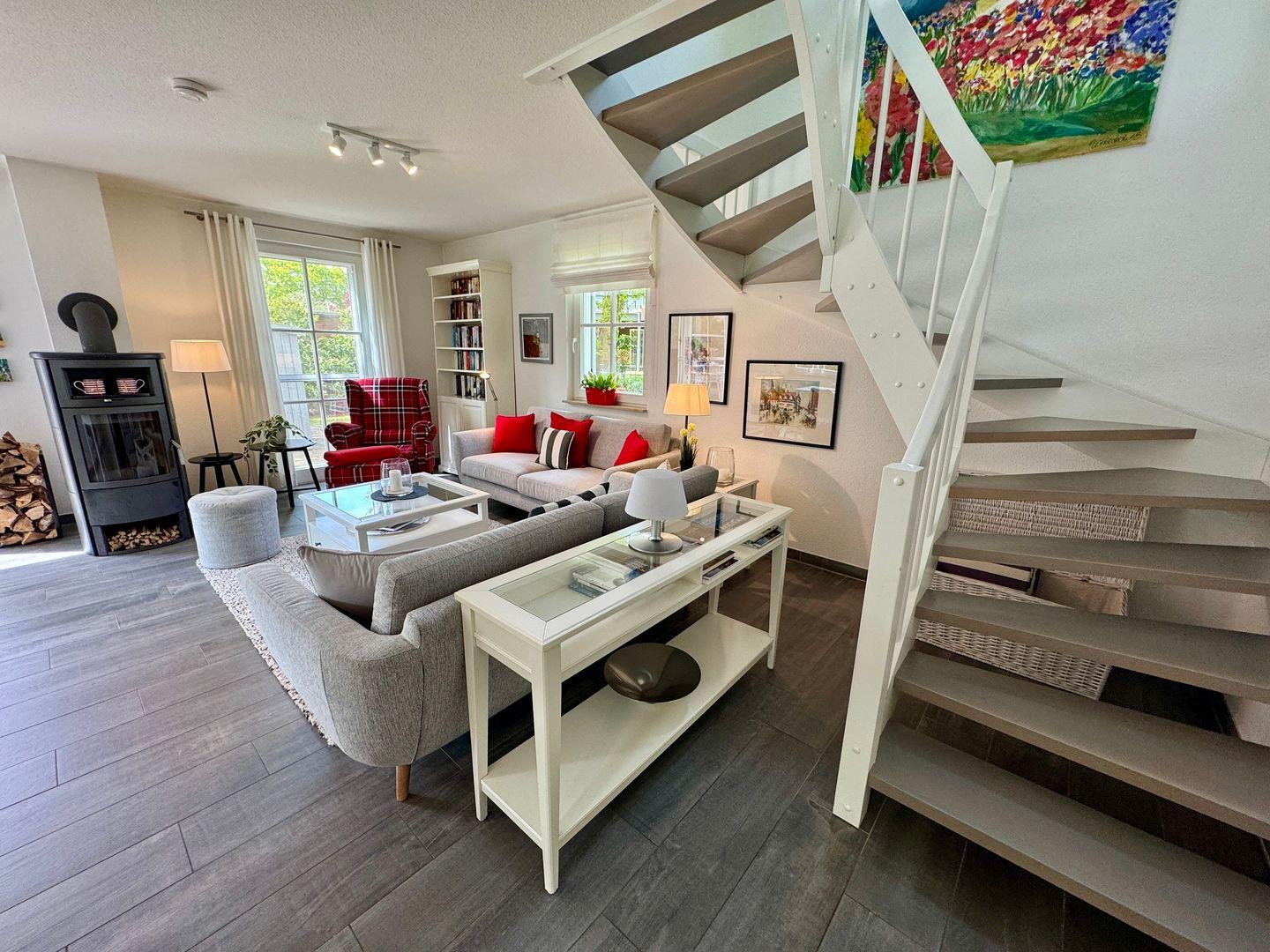 Der großzügige Wohnbereich bildet das Herzstück des Hauses. Eine gemütliche Sofaecke und der Kaminofen schaffen besonders an kühleren Tagen eine behagliche Atmosphäre – perfekt für entspannte Abende mit Familie oder Freunden. Die offene, komplett ausgestattete Küche mit angrenzendem Essbereich bietet alles, was Sie für gemeinsame Mahlzeiten und kulinarische Momente benötigen.
