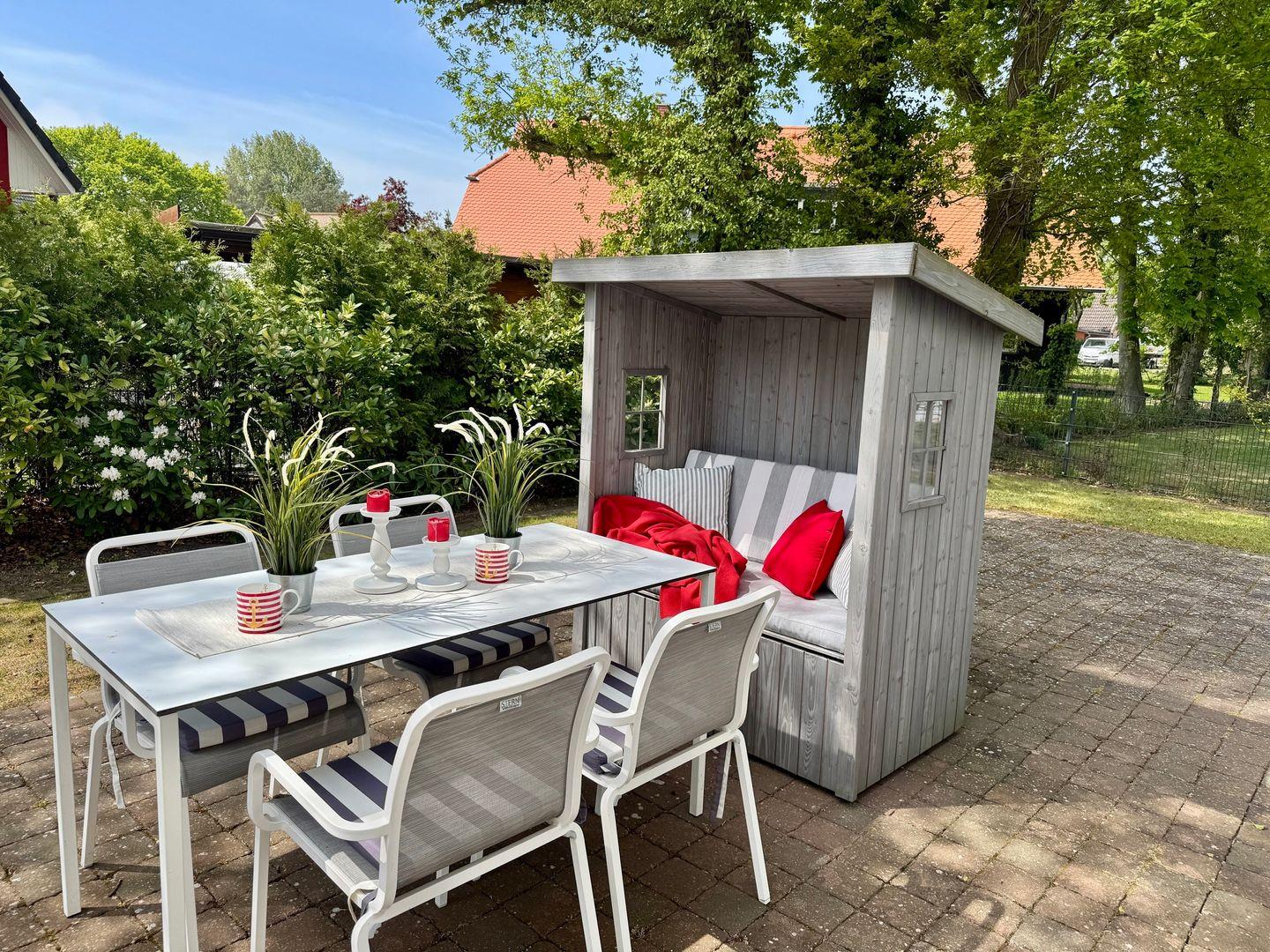 Im Außenbereich lädt die große Terrasse zum Verweilen ein. Der liebevoll angelegte Garten mit Liegewiese bietet viel Platz zum Entspannen, während Kinder im Grünen spielen können. Bequeme Gartenmöbel sorgen für gemütliche Stunden unter freiem Himmel.