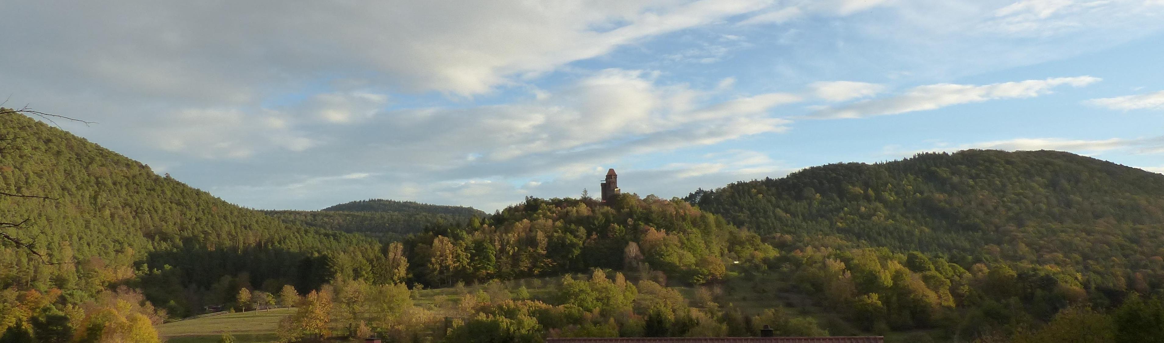 Fewo Monte Noble, genießen Sie das edle und komfortable Ambiente, das traumhafte langgestreckte Panorama mit Bergen bis zu den französischen Nordvogesen& 2 Burgen-Blick. Badesee am Ort. Perfekter Ausgangspunkt für Naturwunder Wanderungen, Radtouren.