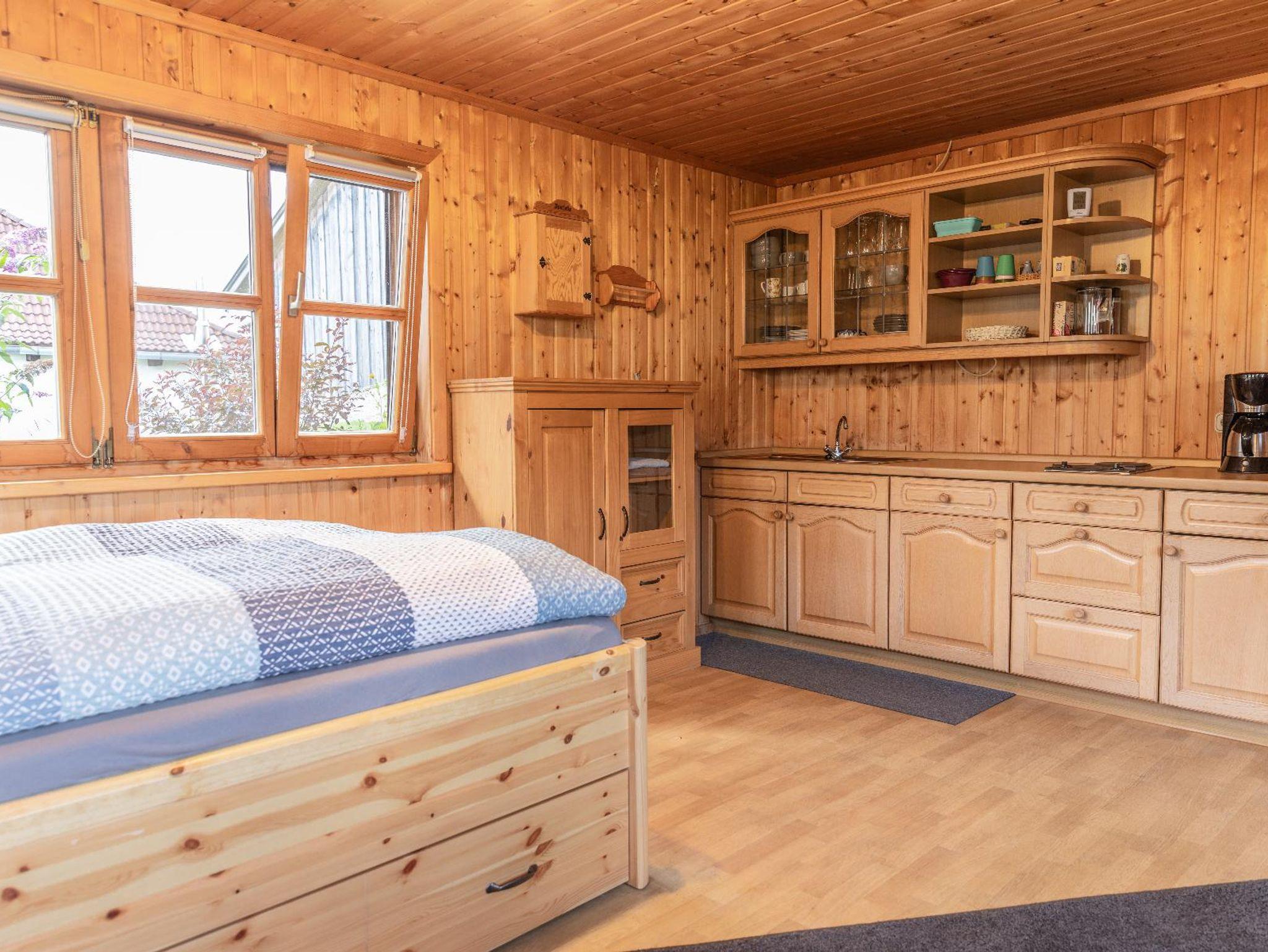 Schlicht und einfach Urlaub machen in unserer kleinen Ferienhütte ... wenn Sie Ruhe und Erholung suchen, preiswert und ohne großen Schnickschnack, dann sind Sie hier genau richtig. Die Hütte bietet in einem Doppelbett (2x1,40 m) Platz für 2 Personen. Auf Wunsch kann ein Klappbett oder Gitterbett dazu gestellt werden. Die Küche ist voll ausgestattet (Geschirr, Besteck, Töpfe, Kochplatte, Kühlschrank vorhanden). WC und Dusche (mit Fußbodenheizung) sind wenige Meter von der Hütte entfernt.