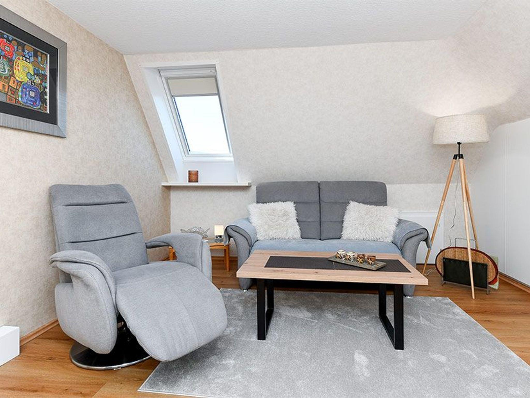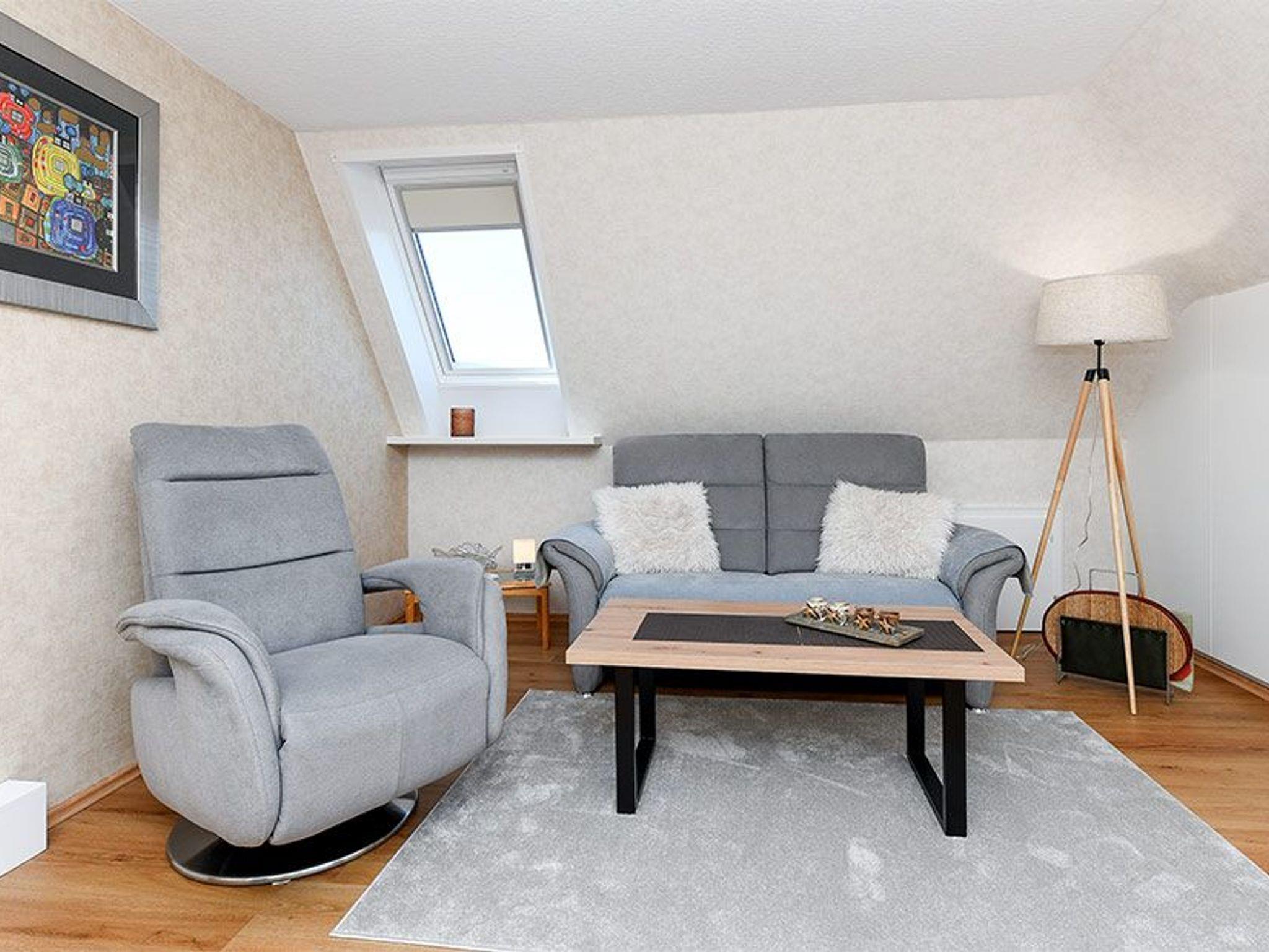 Größe ca. 70 Quadratmeter, Wohnzimmer, Galerie, Küche, Schlafzimmer, zweites separates Schlafzimmer/Kinderzimmer, Badezimmer mit Dusche, Waschtisch und WC, separates zweites WC, Obergeschoss, Balkon, Koffer-/Abstellraum, optimal für 1 bis 3 Personen.