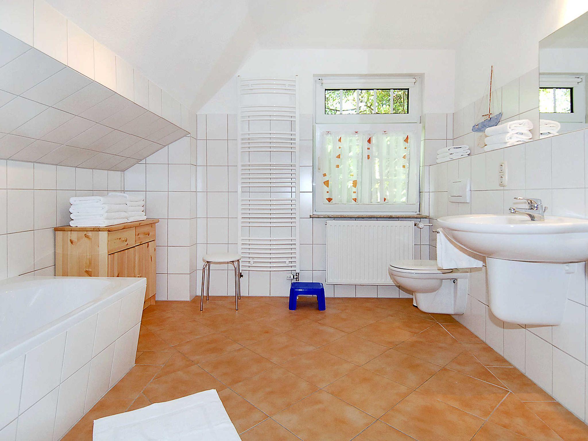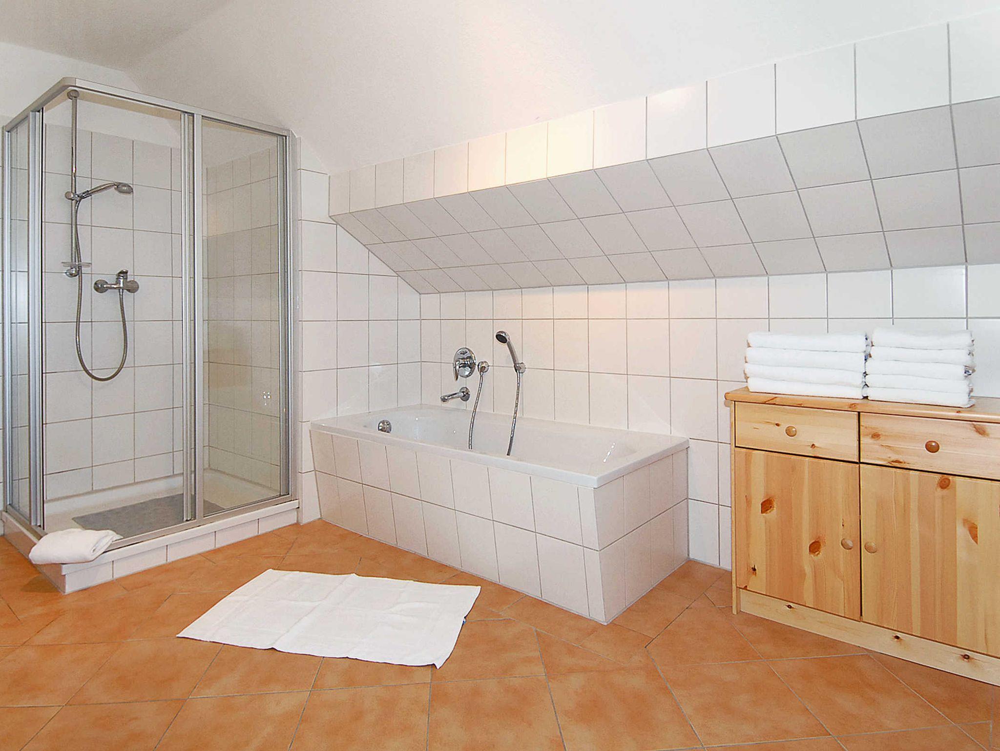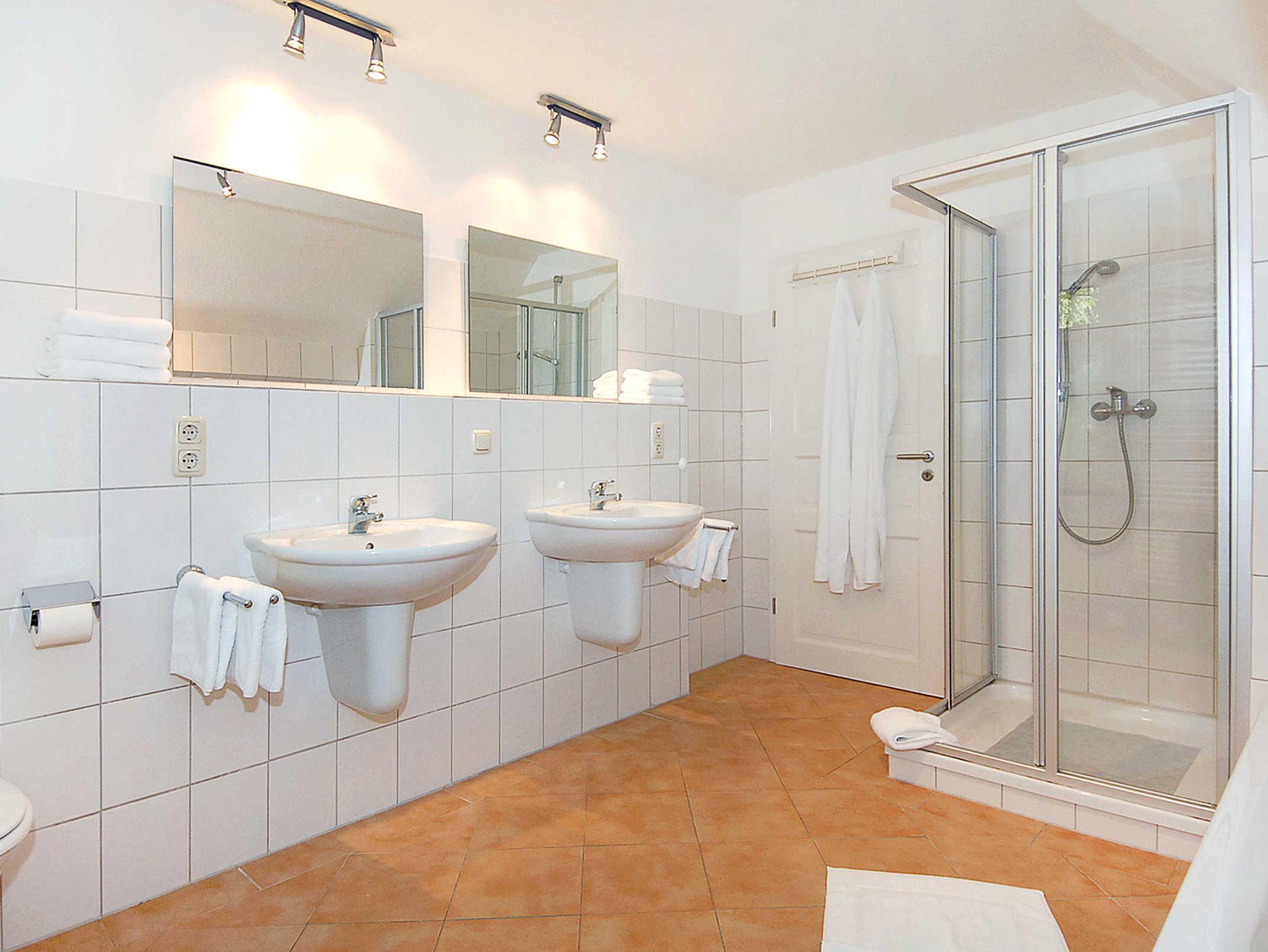 Badezimmer mit Doppel-Waschbecken, Dusche, Badewanne und WC