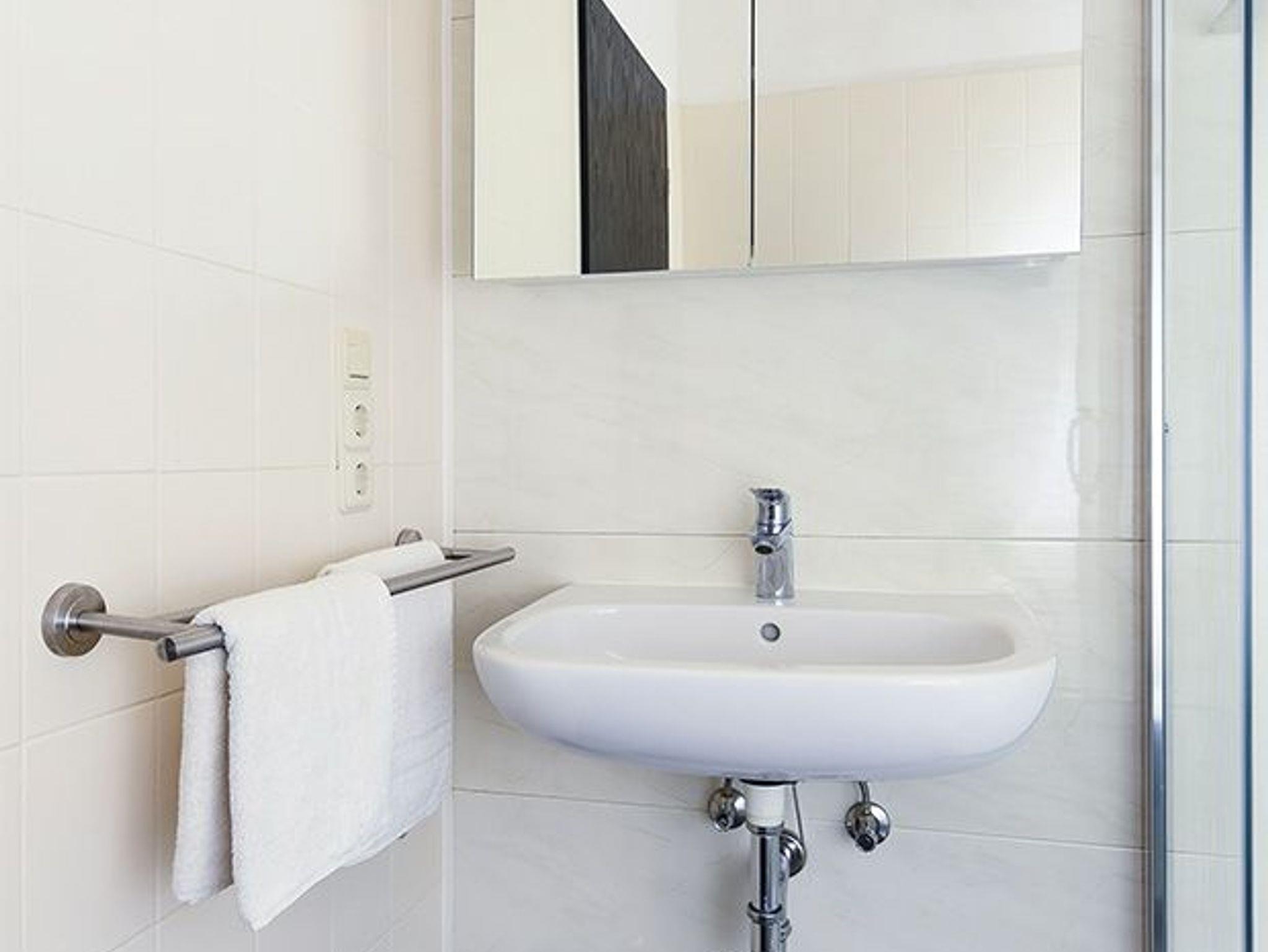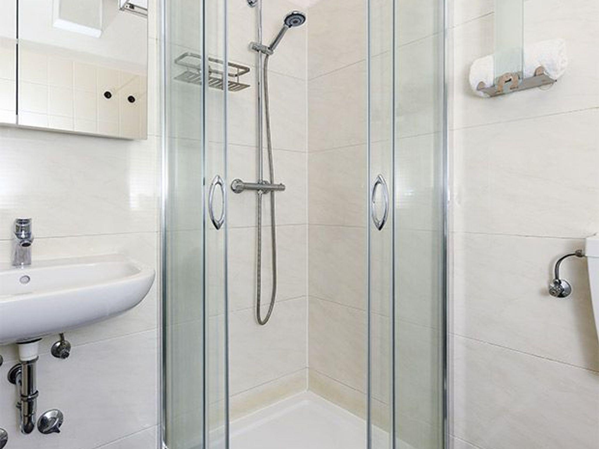 Badezimmer mit Dusche, Waschtisch und WC