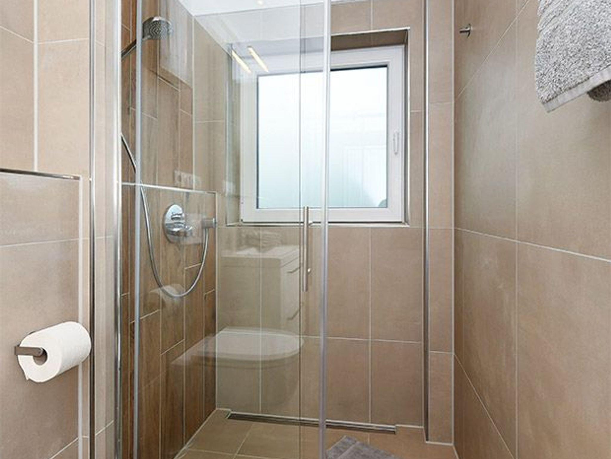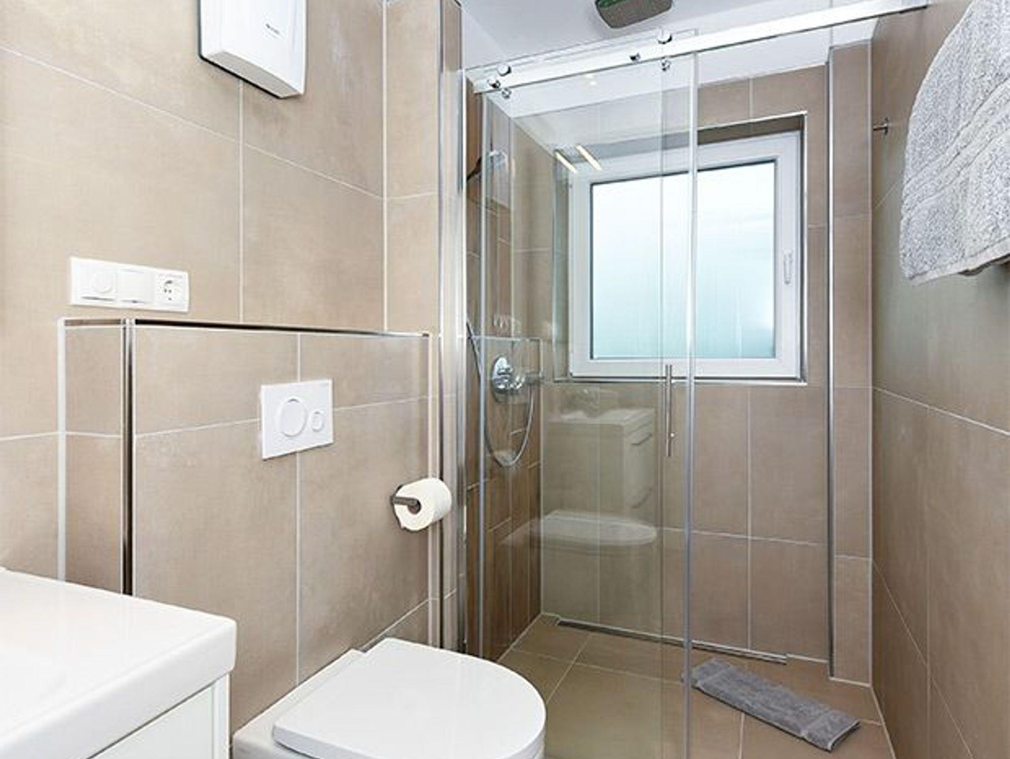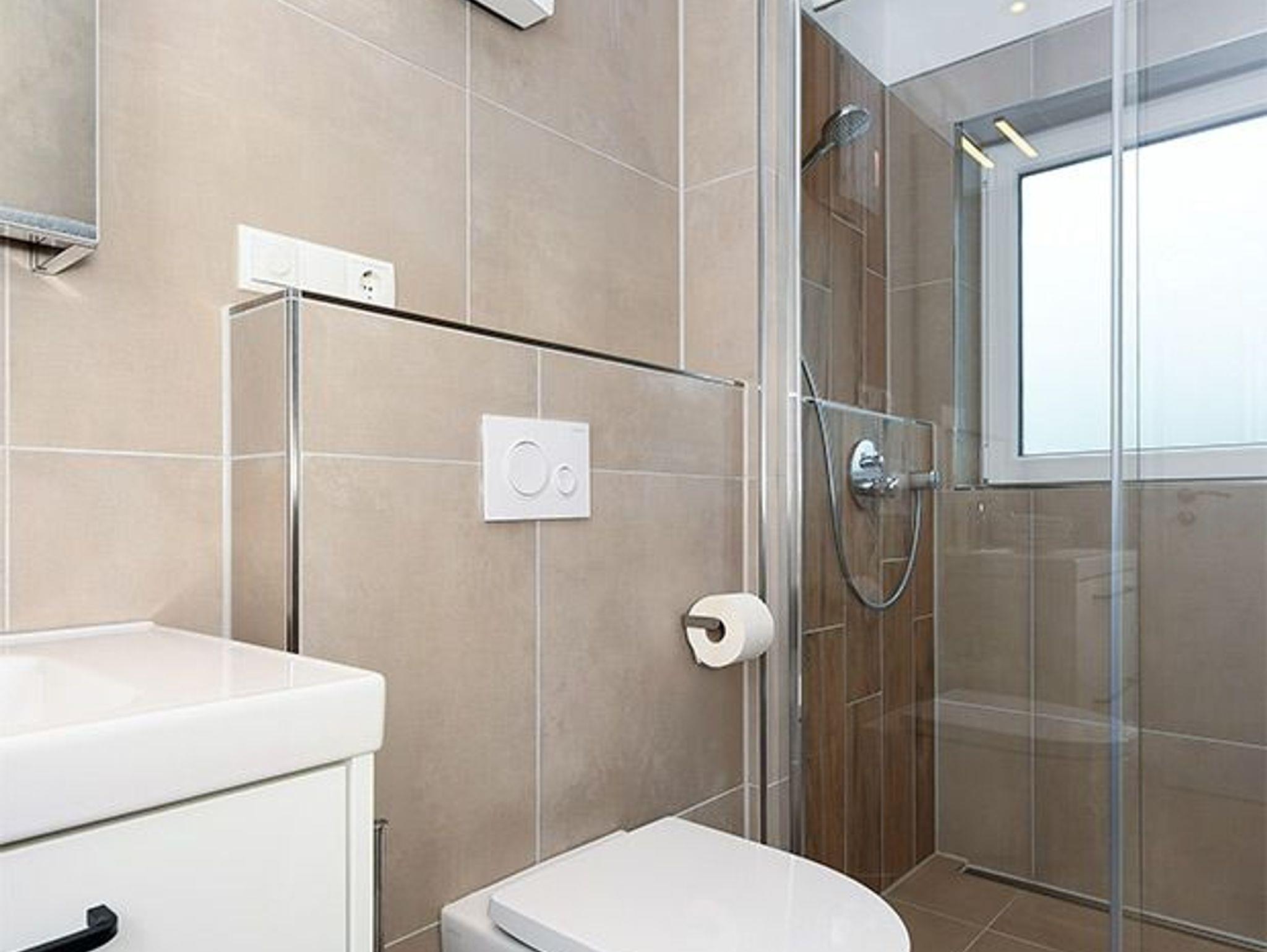 Badezimmer mit Dusche, Waschtisch, Bidet und WC