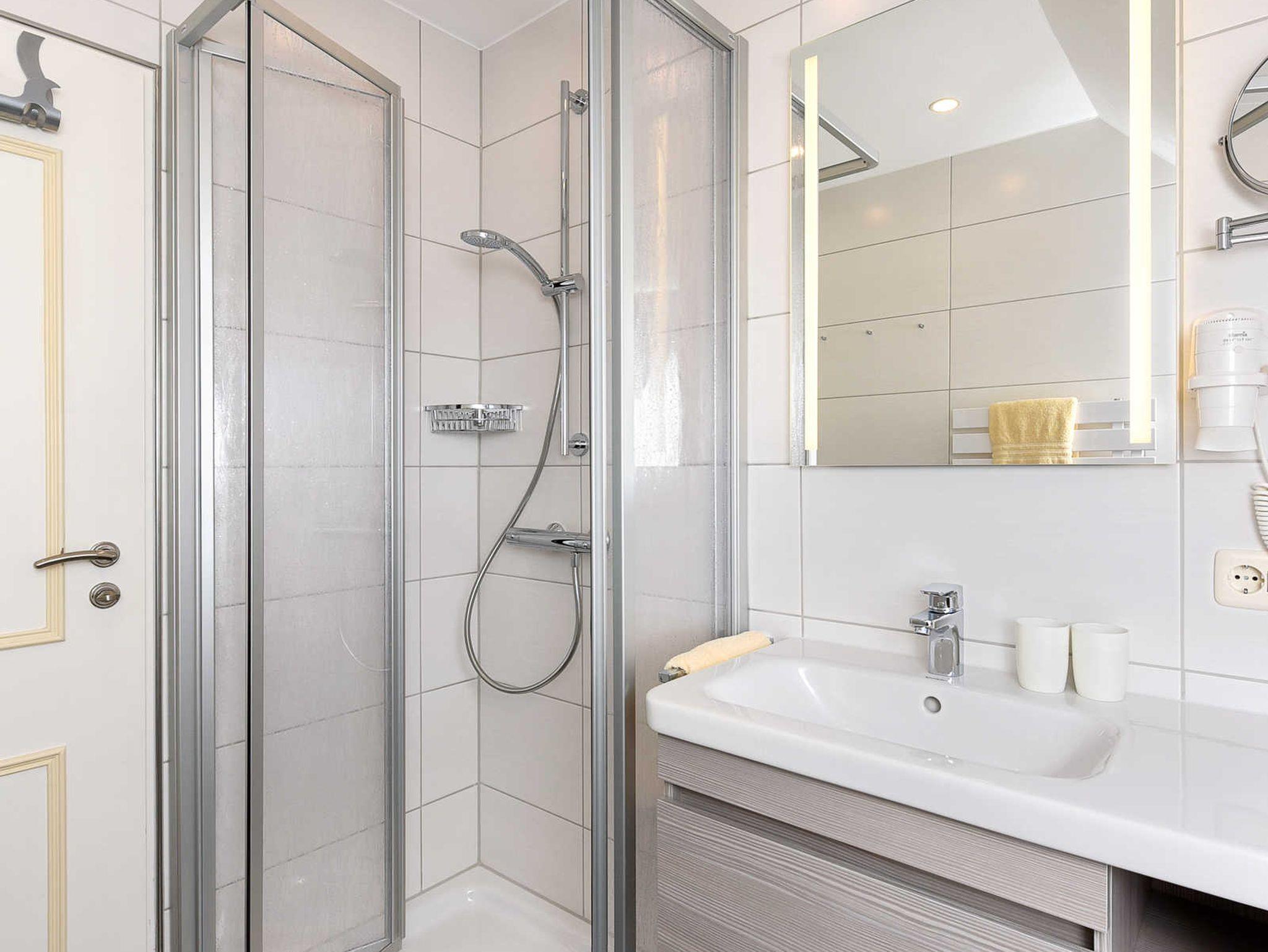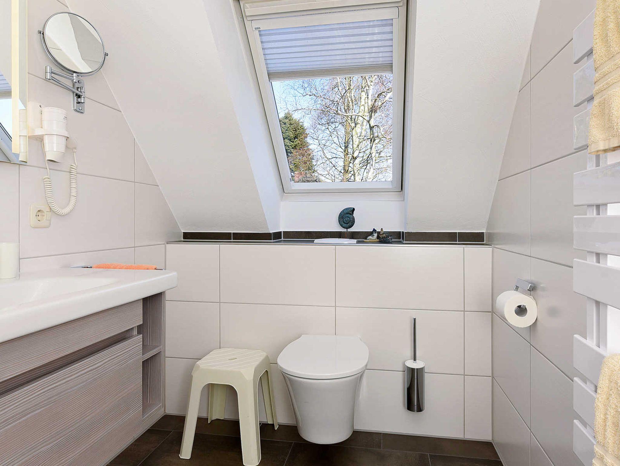 Badezimmer mit Dusche, Waschtisch und WC
