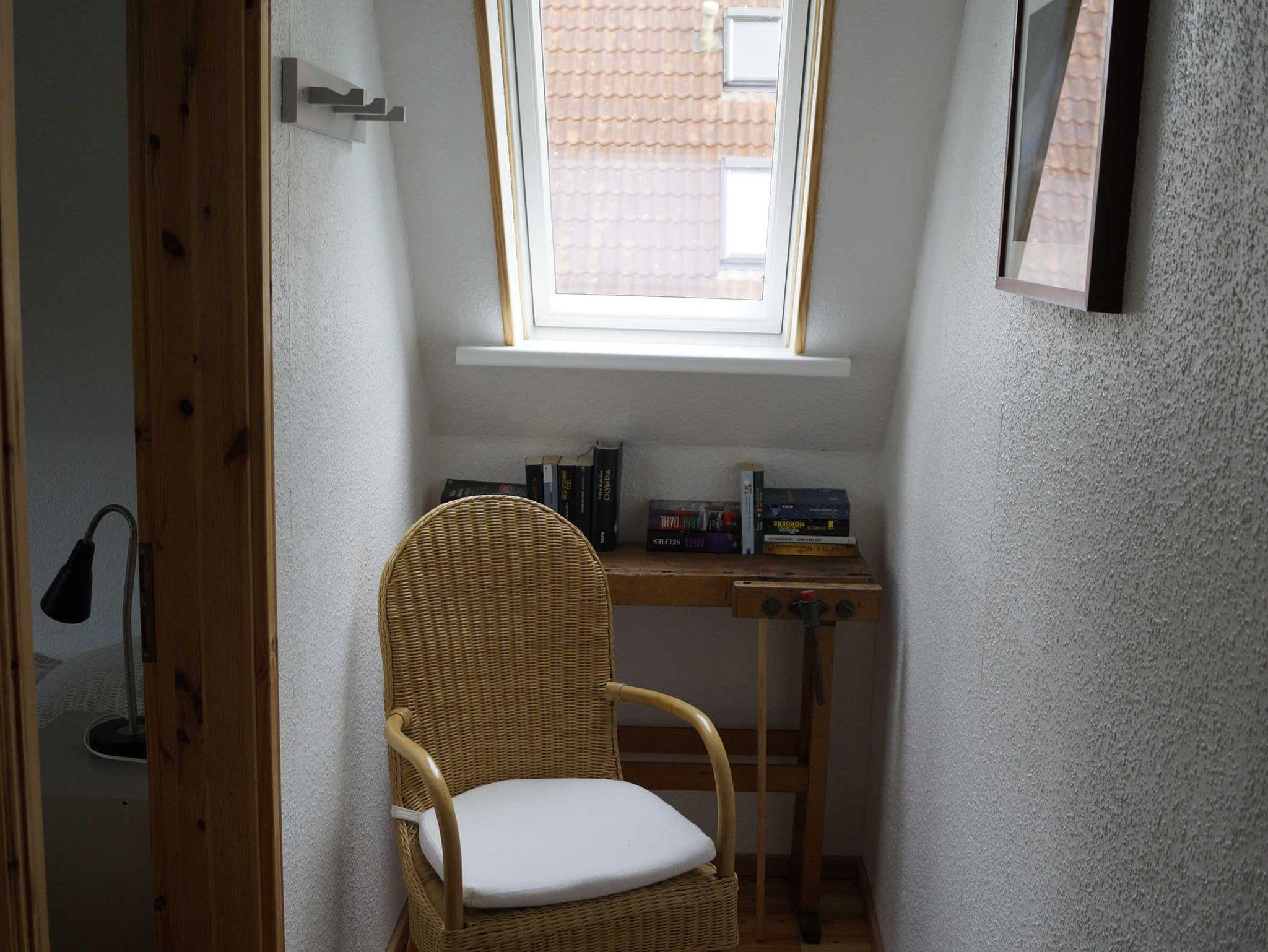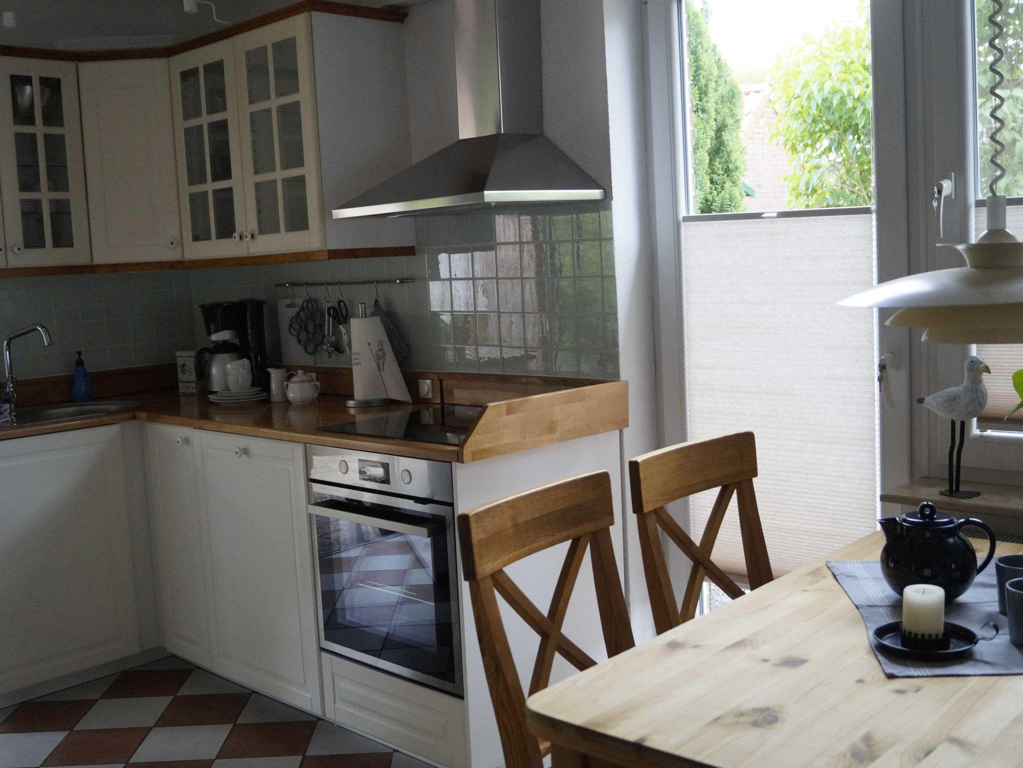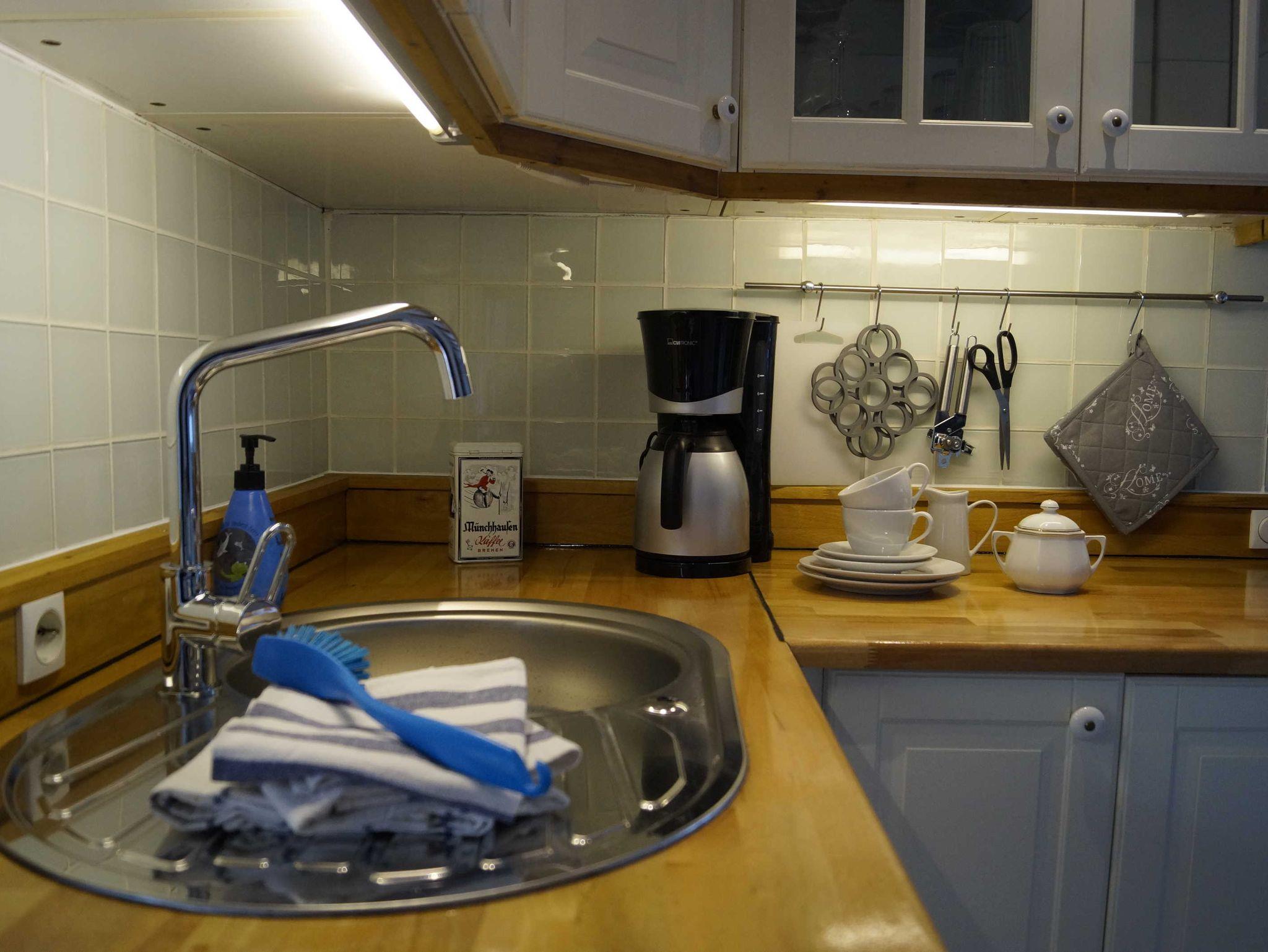 • In der modernen Landhausküche erleichtern Ihnen Spülmaschine, Mikrowelle, Gefrierschrank und Backofen die Selbstversorgung. Für die kleinen Gäste gibt es am Esstisch auch einen Hochstuhl. Vom Sofa aus können Sie im Wohnbereich bequem Fernsehen. Die Lampen sorgen auch am Abend für ein angenehmes Licht beim Lesen. Im Badezimmer mit einer Dusche steht auch eine Waschmaschine. Ebenerdig erreichen Sie das Schlafzimmer mit dem Doppelbett. In der ersten Etage, die über eine recht steile Treppe zu erreichen ist, befinden sich die zwei weitere Schlafzimmer und ein Spielbereich. Die Treppe ist für Kinder mit einem Schutzgitter abgesichert.