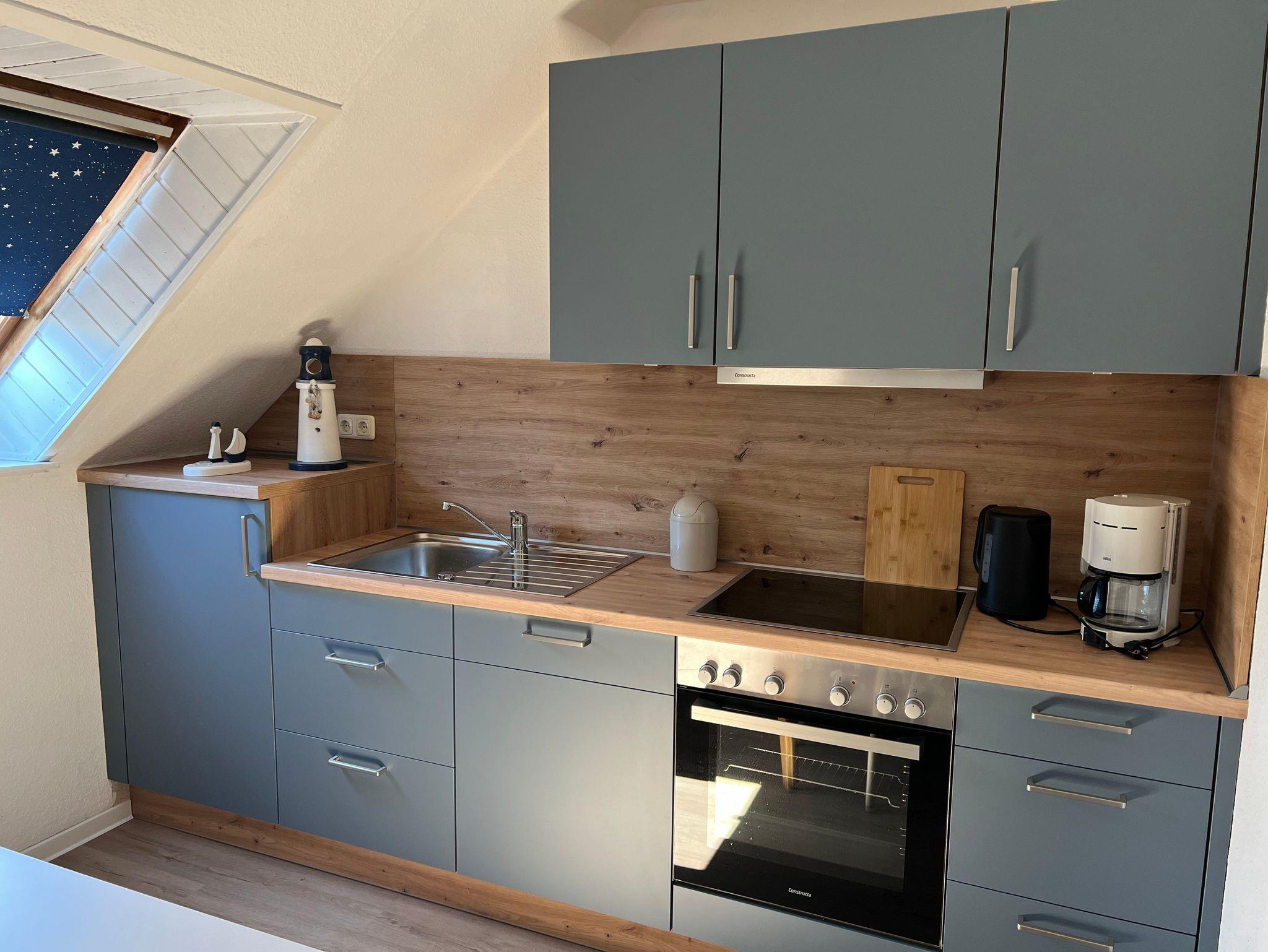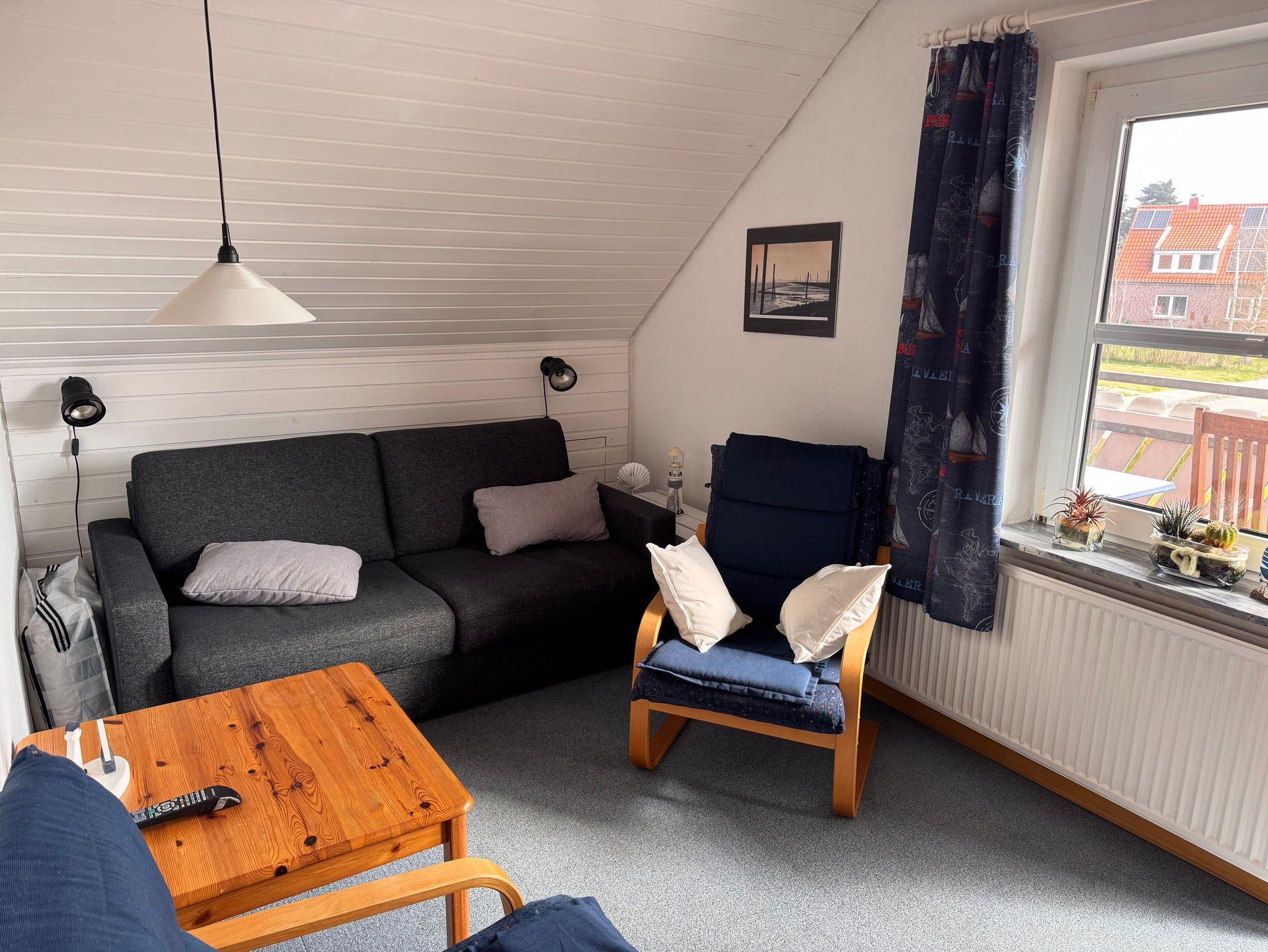 Die gemütliche Ferienwohnung im Obergeschoss erstreckt sich über 40 Quadratmeter und bietet alles, was Sie für einen entspannten Urlaub benötigen. Sie verfügt über ein einladendes Schlafzimmer mit Doppelbett, ein Badezimmer mit Dusche und WC ausgestattet und eine kleine, praktische Küche die zudem über eine gemütliche Essecke verfügt. Im angrenzenden Wohnzimmer können Sie nach einem ereignisreichen Tag entspannen.