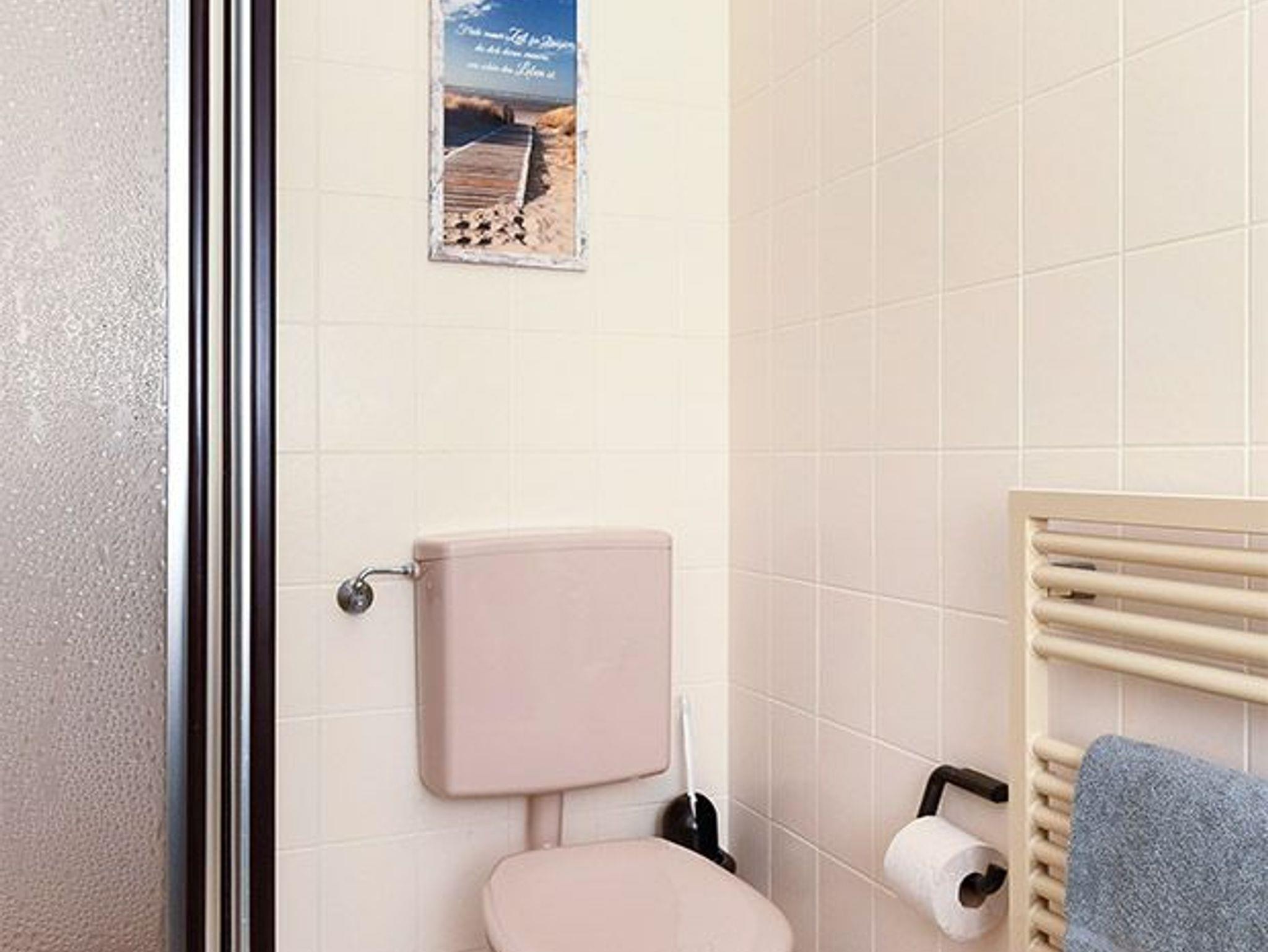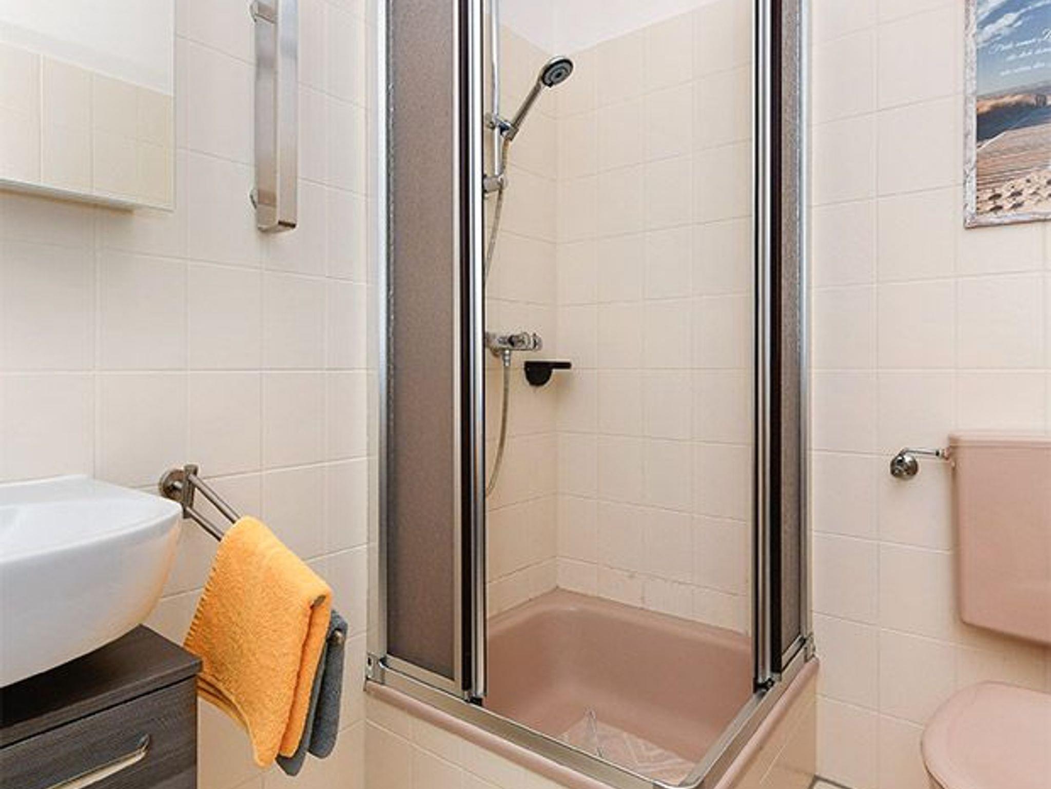Badezimmer mit Dusche, Waschtisch und WC