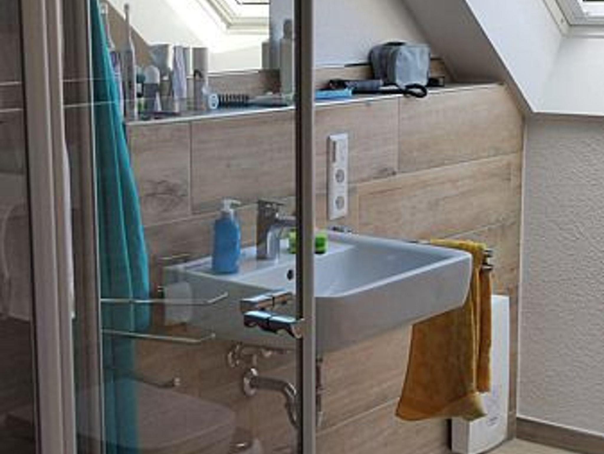 Badezimmer mit Dusche, Waschtisch und WC
