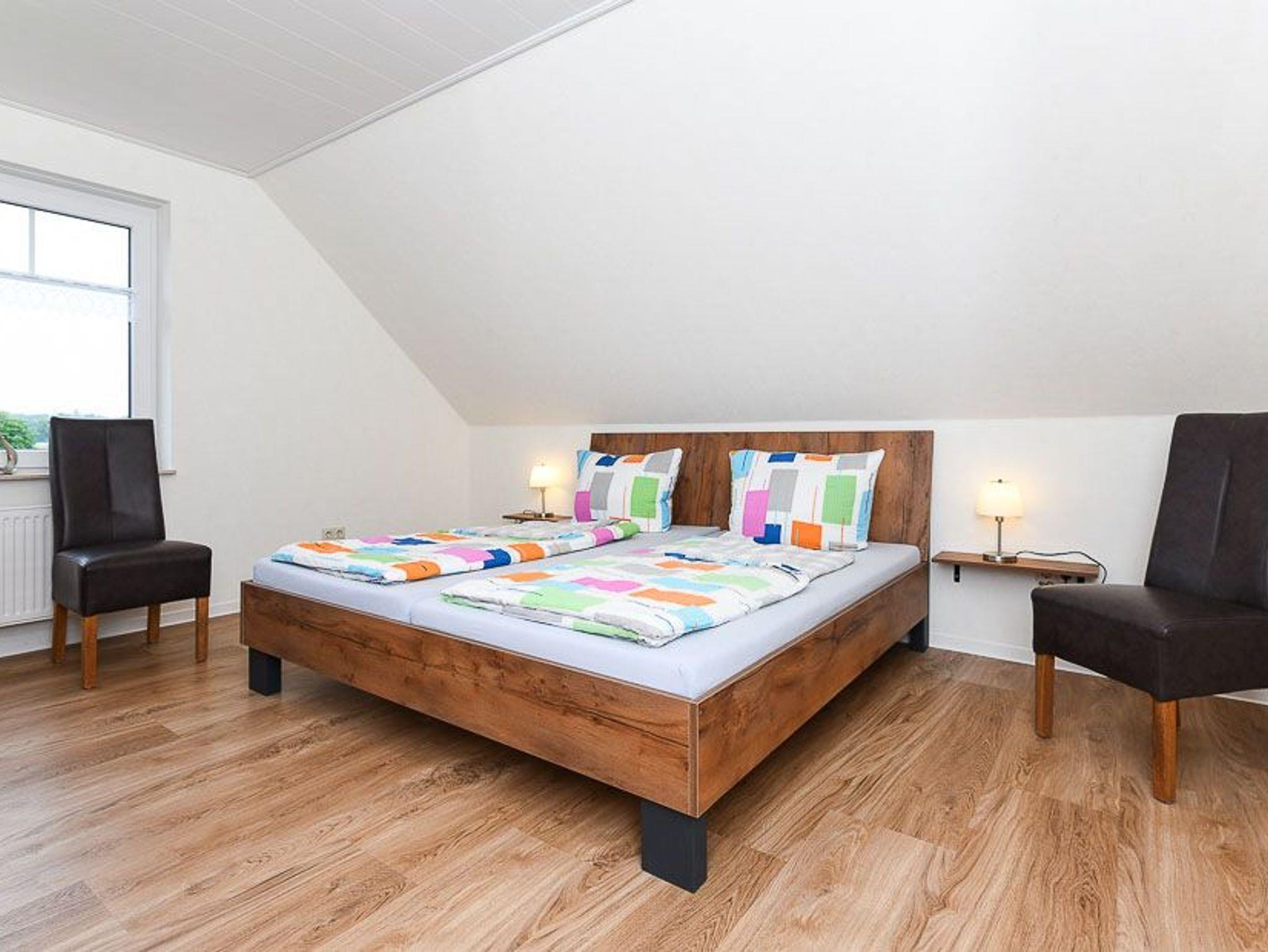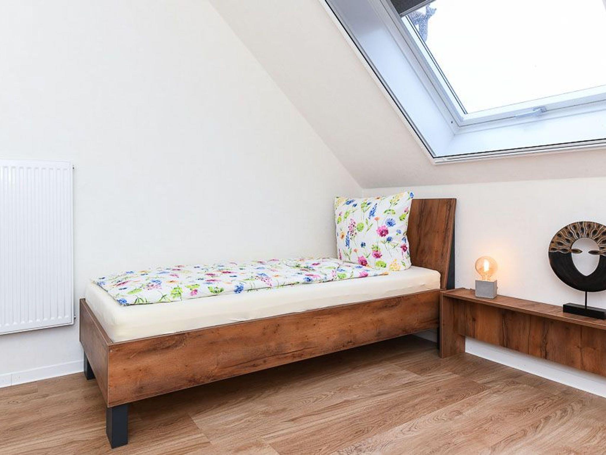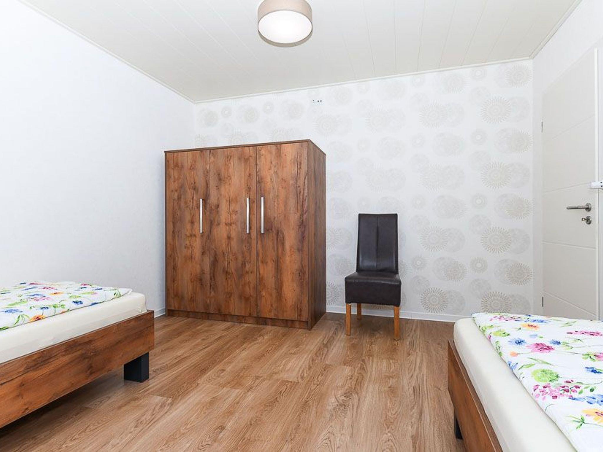 Größe ca. 65 Quadratmeter, Wohnzimmer mit integrierter Küche, Schlafzimmer, zweites separates Schlafzimmer/Kinderzimmer, Badezimmer mit Doppel-Waschbecken, Dusche und WC, Obergeschoss, optimal für 2 bis 4 Personen, seperater Fahrradschuppen zum abschließen.