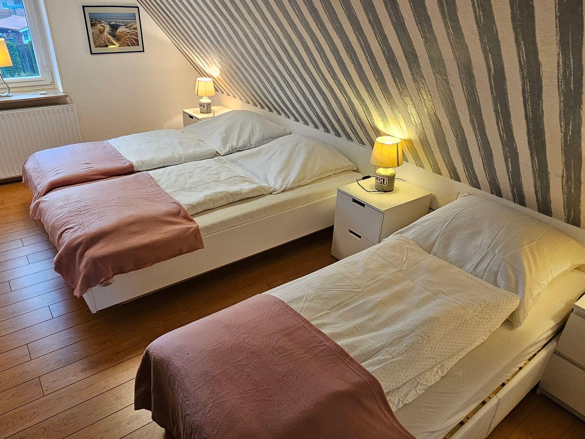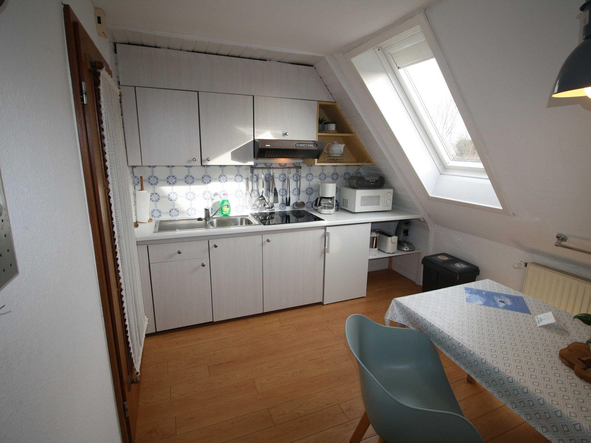 Dieses Appartement kann mit bis zu 3 Personen genutzt werden, es liegt im Obergeschoss. Es hat eine Größe von ca. 38 qm. Es gibt ein Wohnzimmer mit einer schönen großen Couch, Fernsehen und Radio, ein Schlafzimmer mit einem 1,80 m Bett und einem Einzelbett und eine Küche mit Ceranfeld, Mikrowelle, Filtermaschine und Senseo-Kaffeemaschine. Das Tageslichtbad hat Dusche und WC.