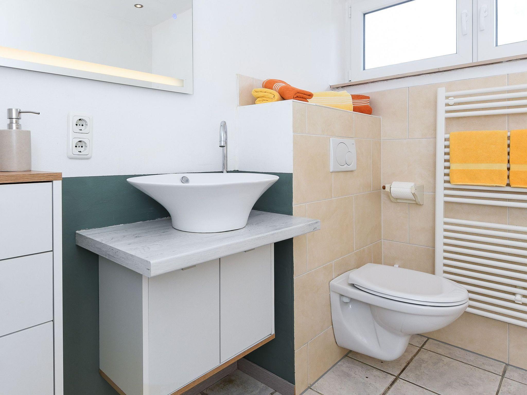 Badezimmer mit Badewanne, Dusche, Waschtisch und WC