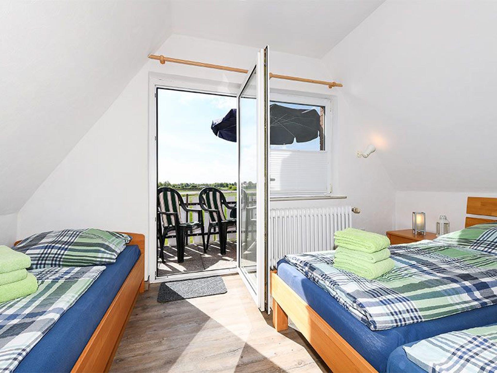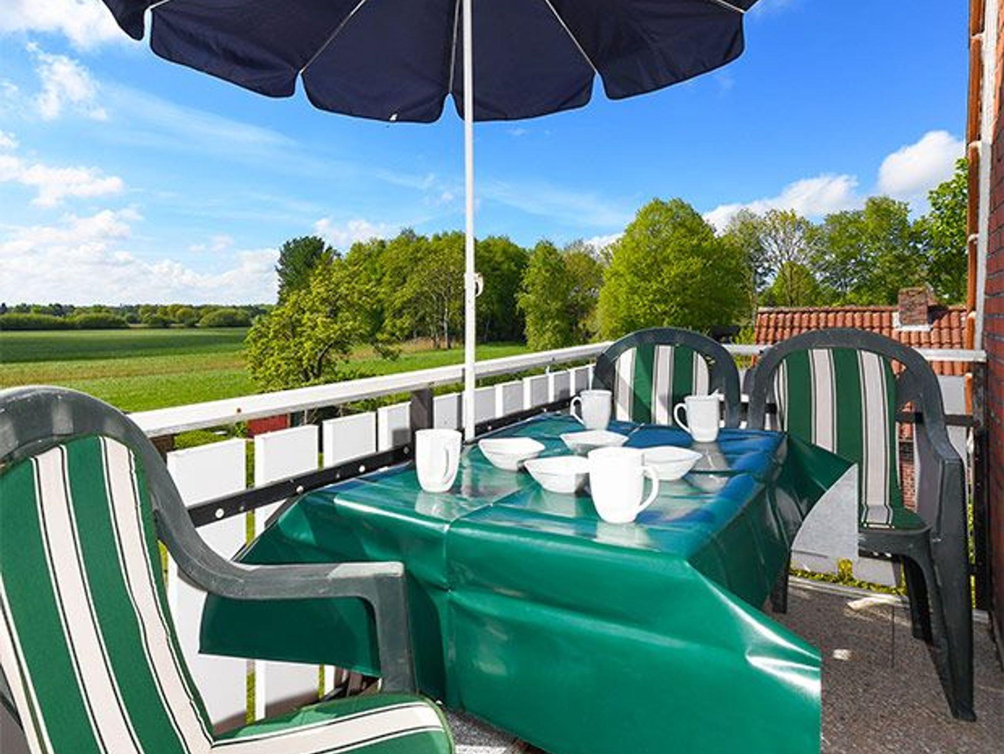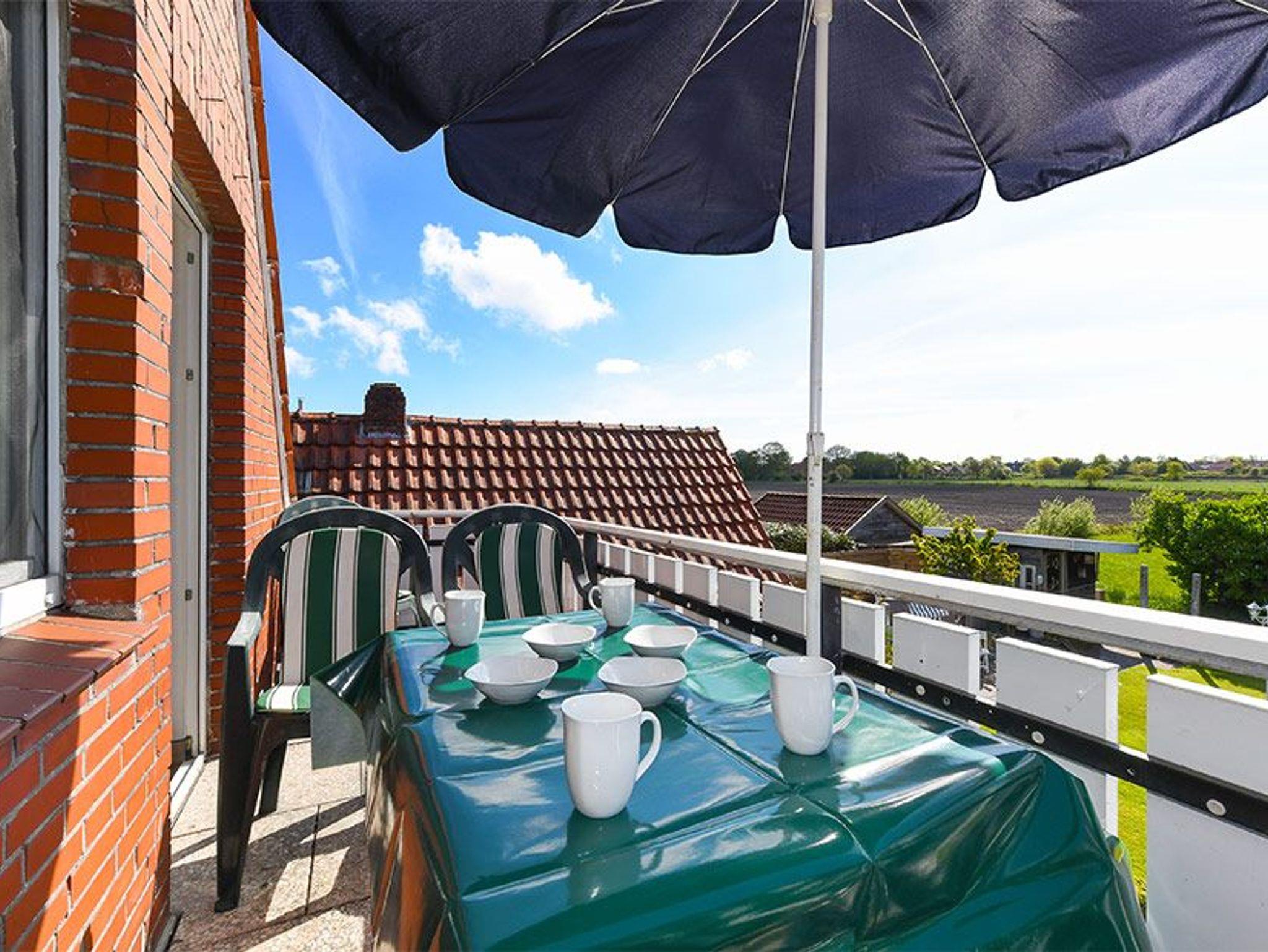 Auf dem großzügigen Balkon können Sie die herrliche Aussicht auf die Wiesen und Felder - eben die ostfriesische Weite - genießen.