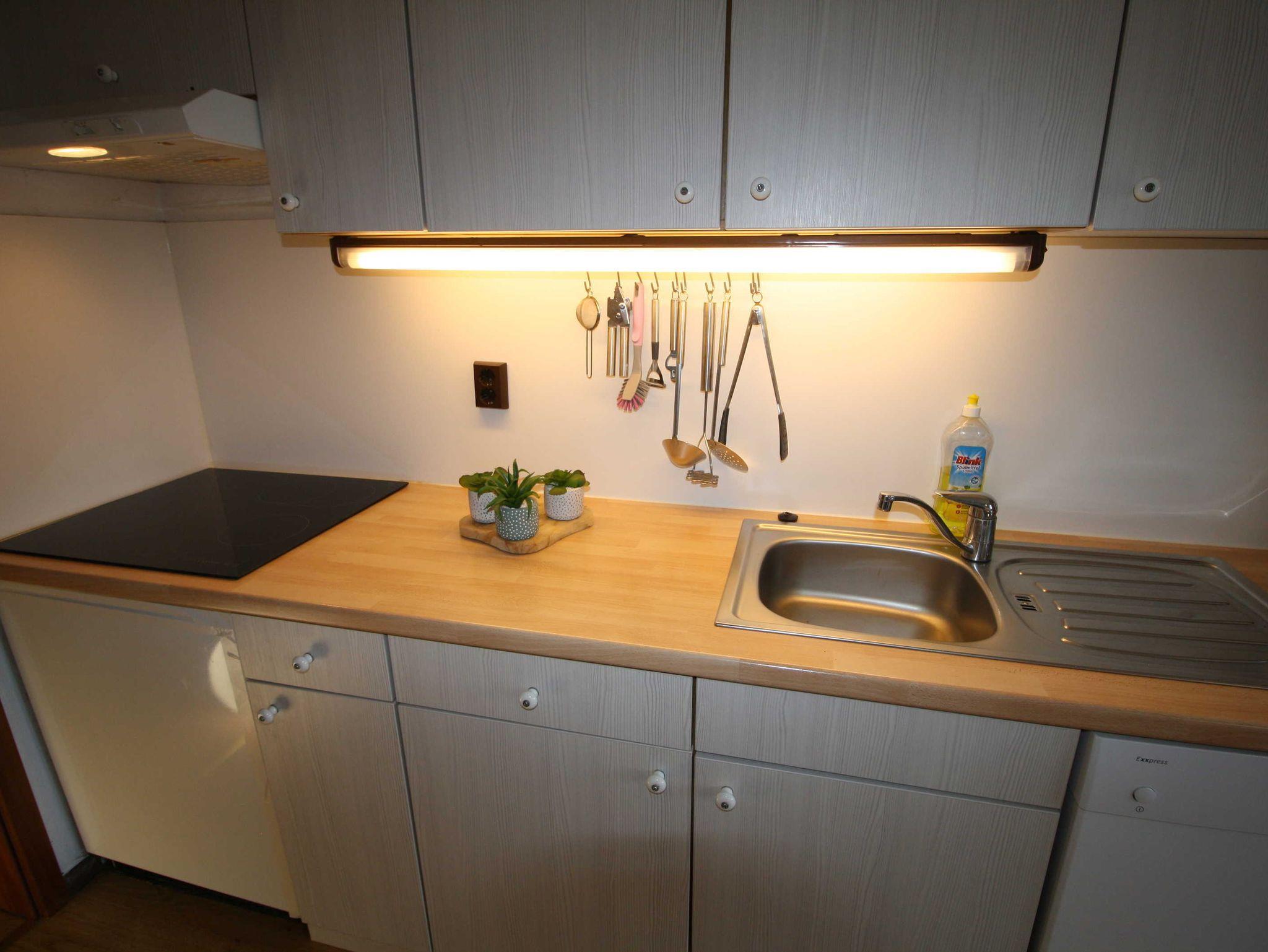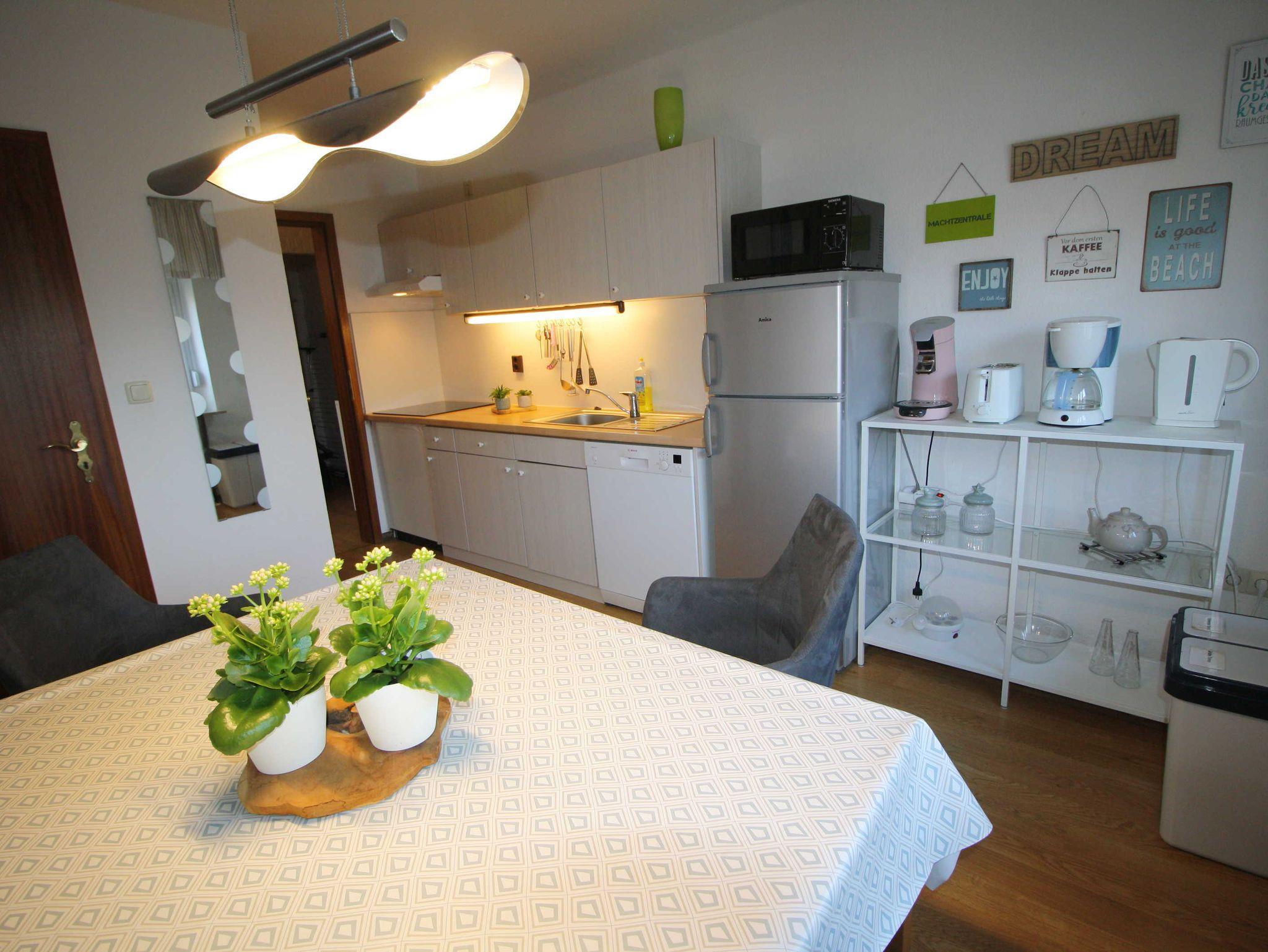 Dieses Appartement kann mit bis zu 4 Personen bewohnt werden. Es hat eine Größe von ca. 44 qm und befindet sich im Erdgeschoss. Es gibt eine schöne große Küche mit Essbereich. Sie ist ausgestattet mit Spülmaschine, Ceranfeld, Mikrowelle, Filtermaschine und Senseo-Kaffeemaschine.