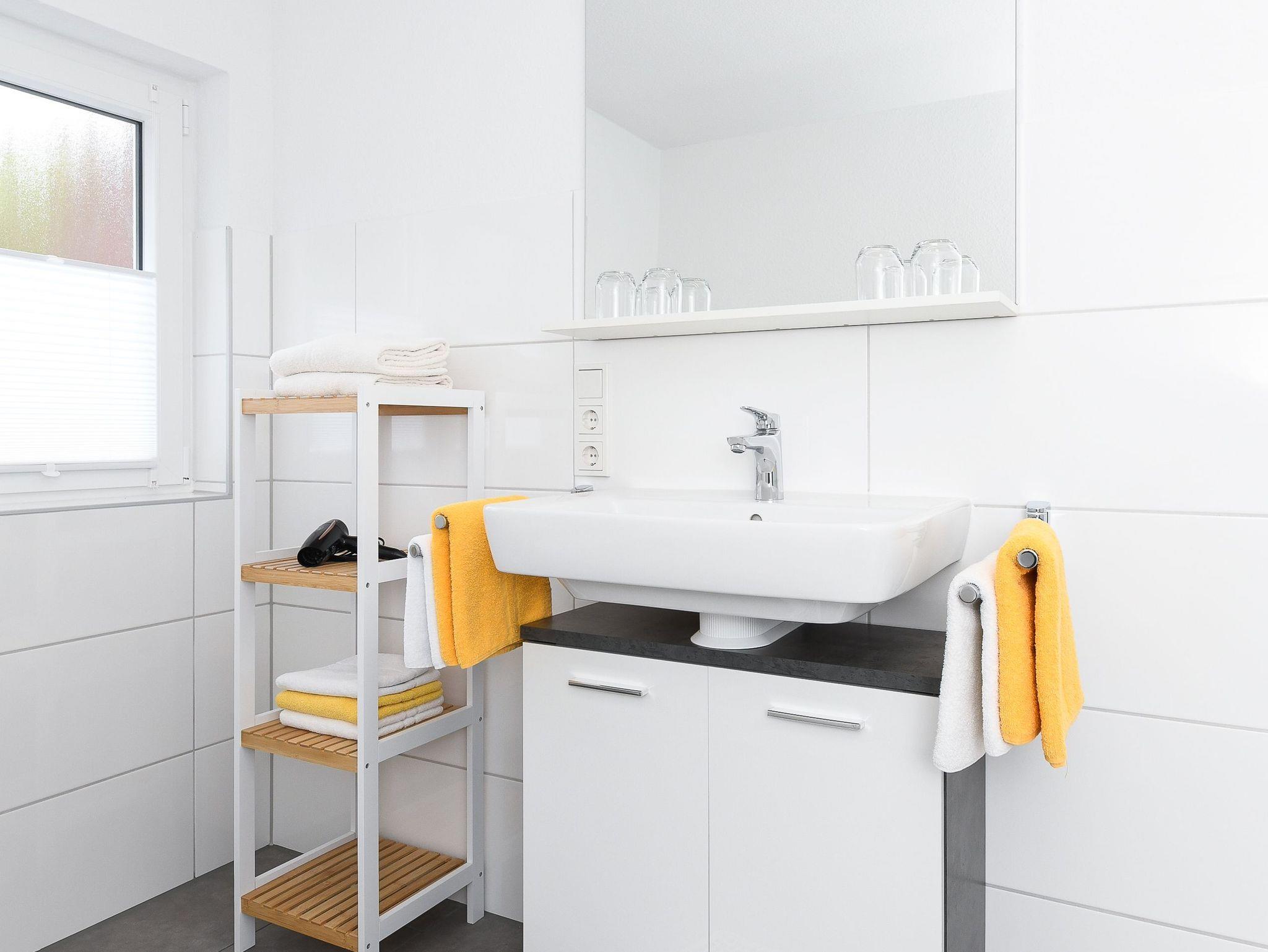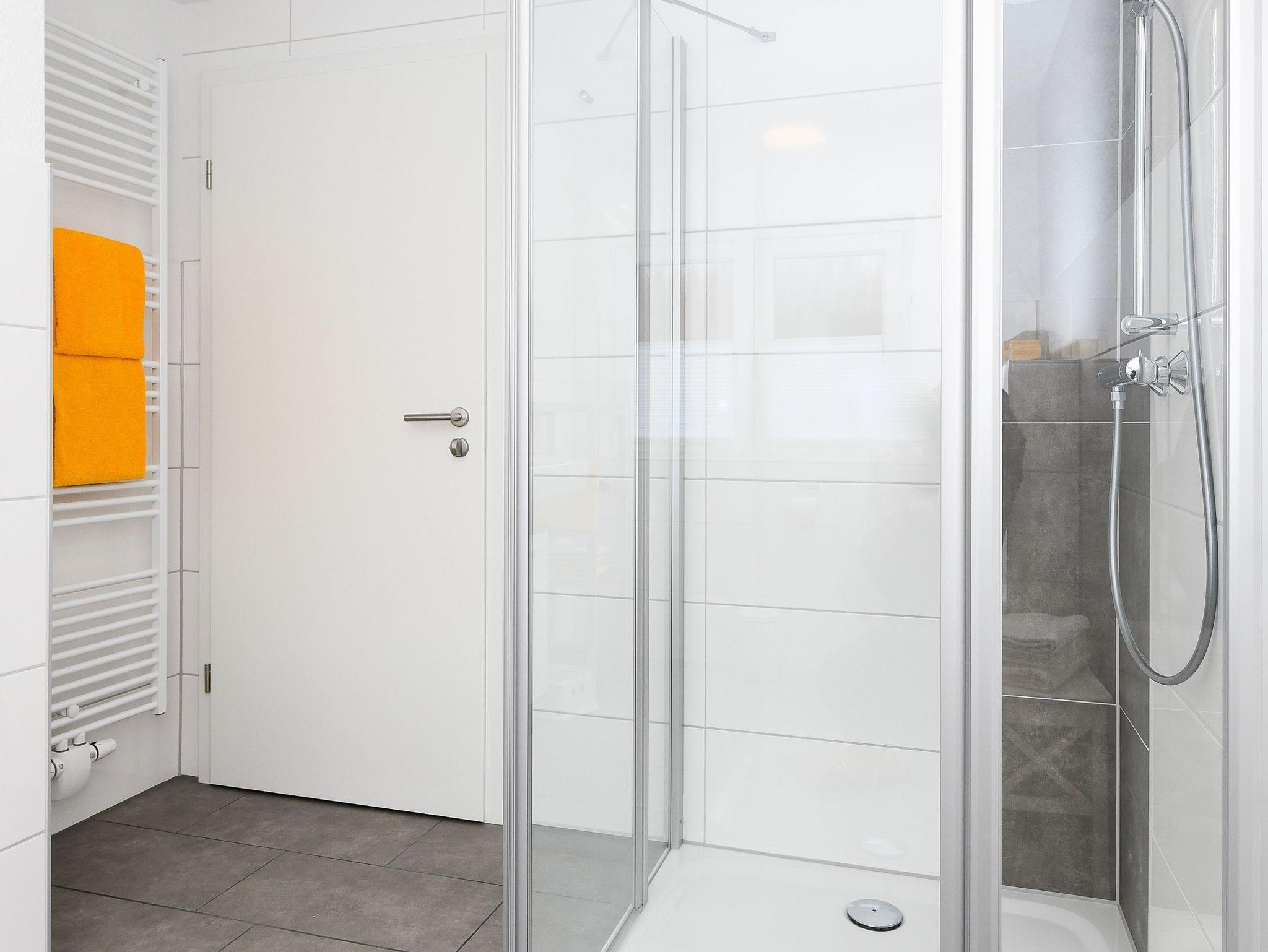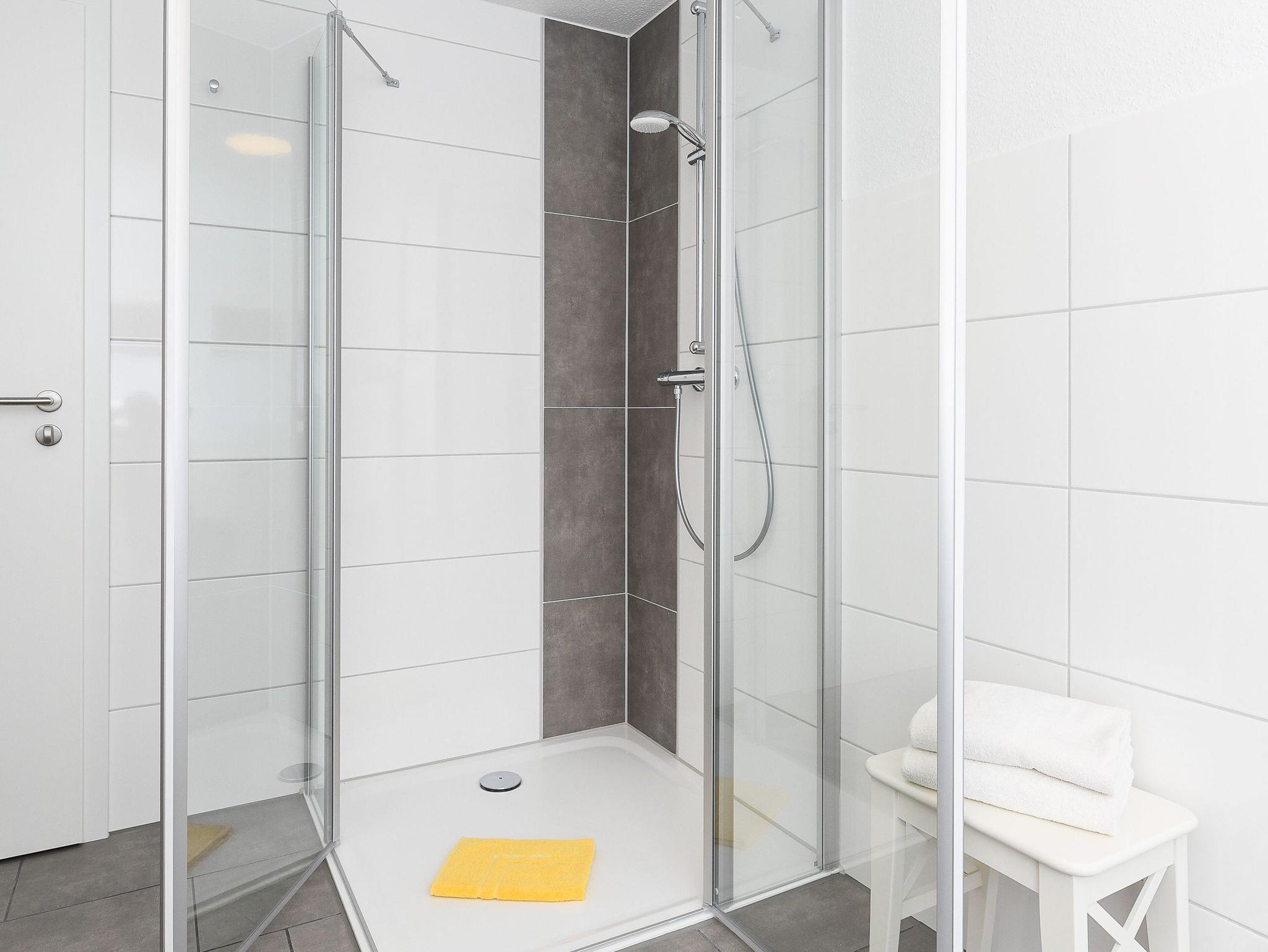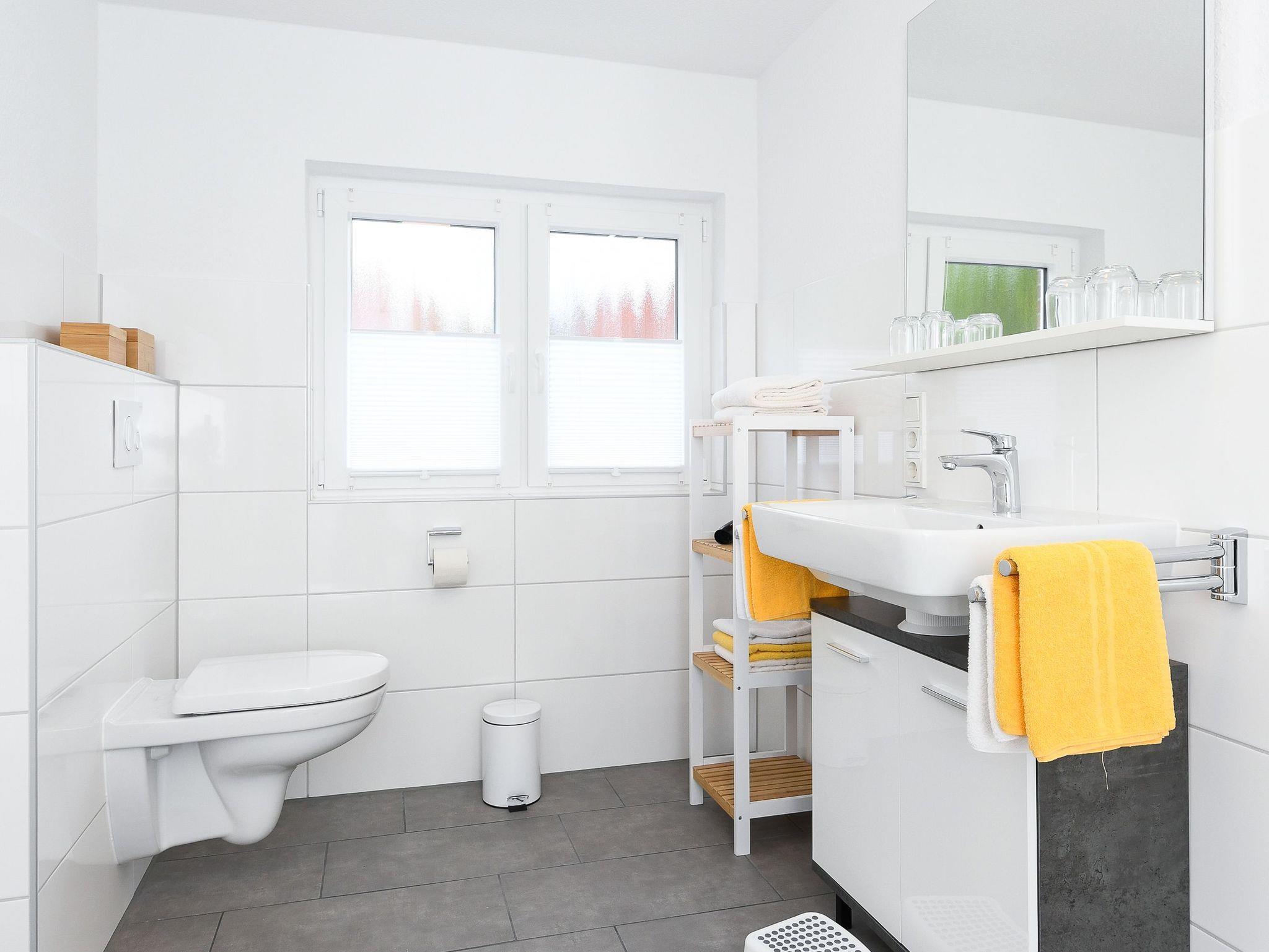 Badezimmer mit Dusche, Waschtisch und WC