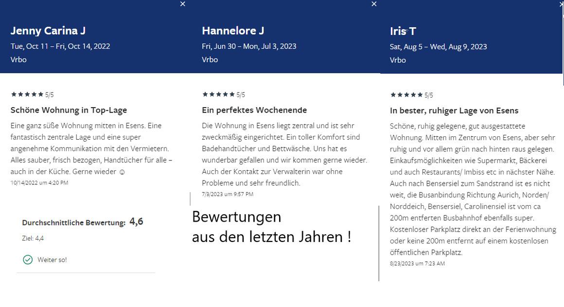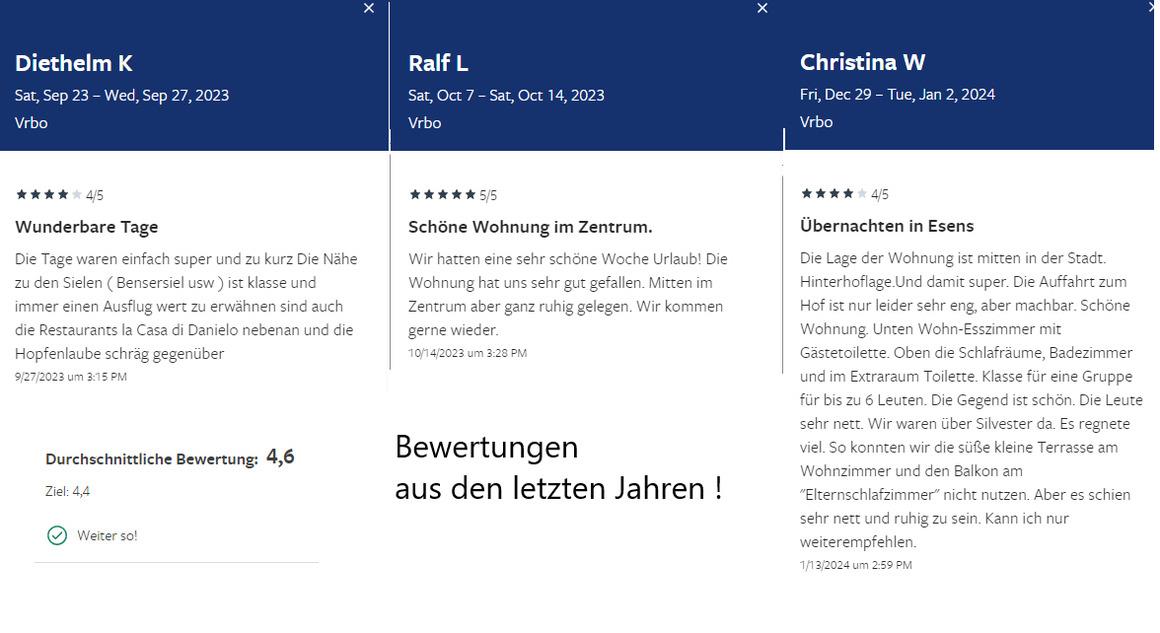 Die geräumige Ferienwohnung liegt inmitten der gemütlichen Esenser Altstadt, zentral und sehr ruhig mit Blick in den Garten. Bis zum Meer sind es 4 km. In unmittelbarer Nähe befinden sich vielzählige Einkaufsmöglichkeiten.