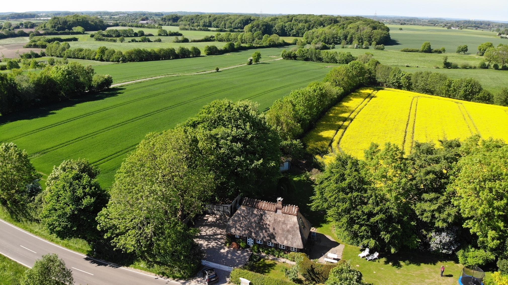 Das Grundstück hat keine direkten Nachbarn und liegt allein. Einige alte Bäume, landschaftstypischer Knick und kleine Wälle säumen die Grundstückgrenze. Die Grundstücksgrenzen sind nur zur Straße eingezäunt sonst bildet ein kleiner mit Rosen bepflanzter Wall den Übergang zum landwirtschaftlich genutztem Feld.