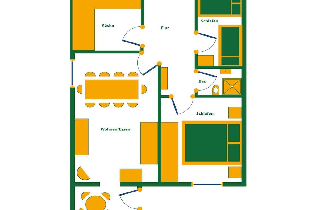 Første etasje: (Kjøkken(komfyr med kokeplater, stekovn, oppvaskmaskin, kjøleskap), Stue/spisestue(1 persons sovesofa, TV, spisebord), soveværelse(enkeltseng, enkeltseng), soveværelse(dobbeltseng, dobbeltseng)) terrasse, hagemøbler