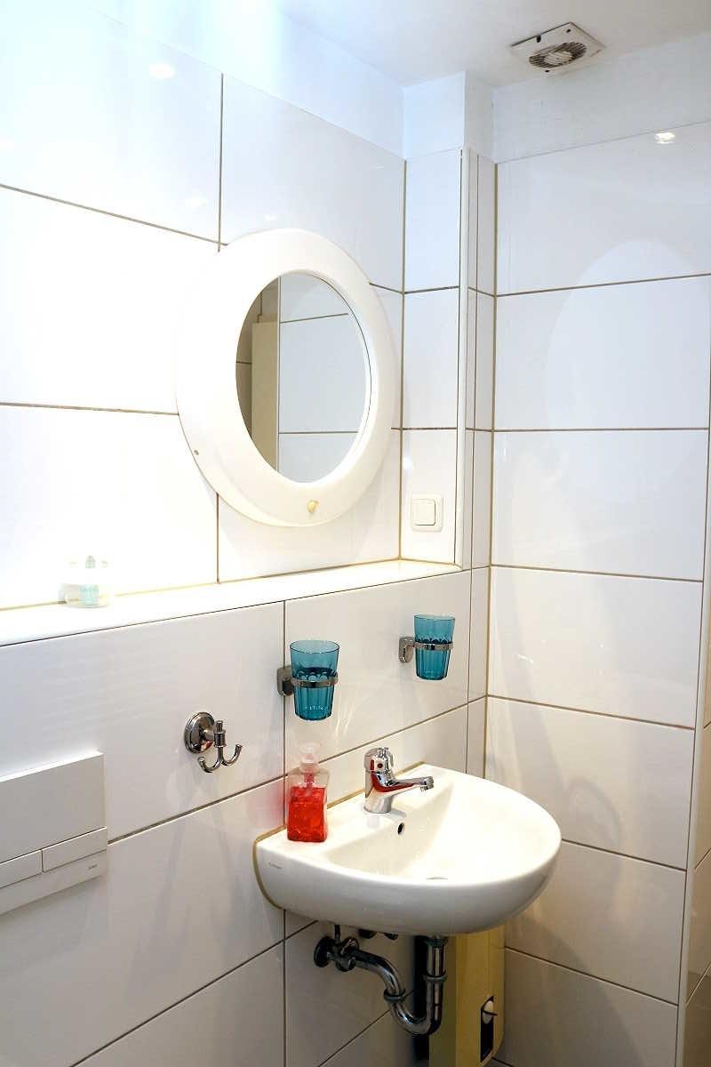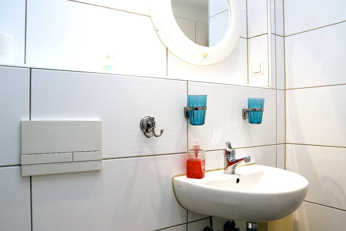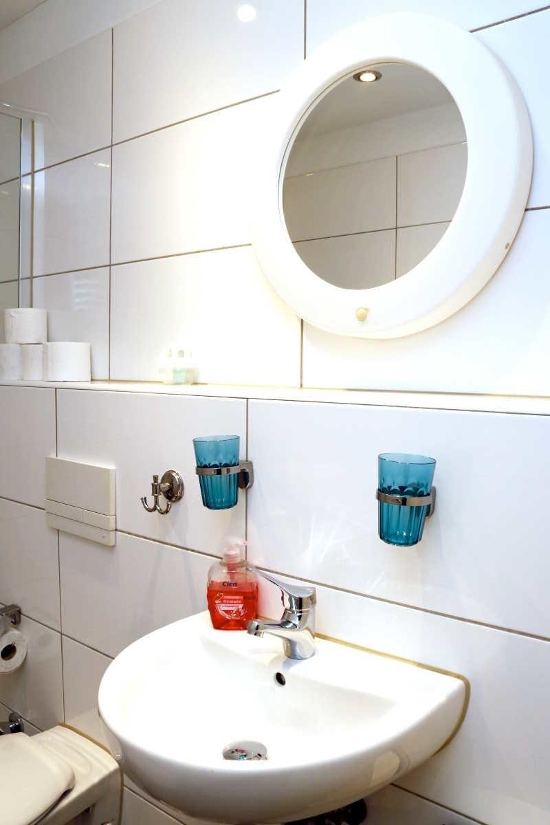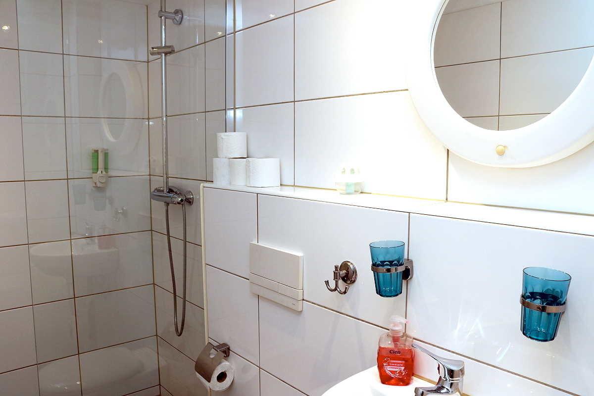 Das Badezimmer verfügt über einen Waschtisch, Spiegel, Kosmetikspiegel, WC und bodengleicher Dusche. Der Heizkörper ist als Handtuchheizung konzipiert, ein Föhn ist ebenfalls vorhanden.