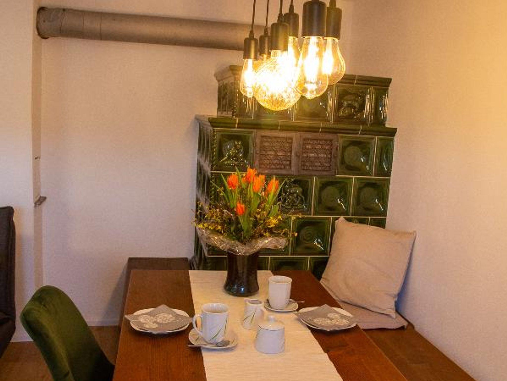 Toaster und Kaffeemaschine, Essecke, Kachelofen, Flachbild-TV und Schlafsofa.