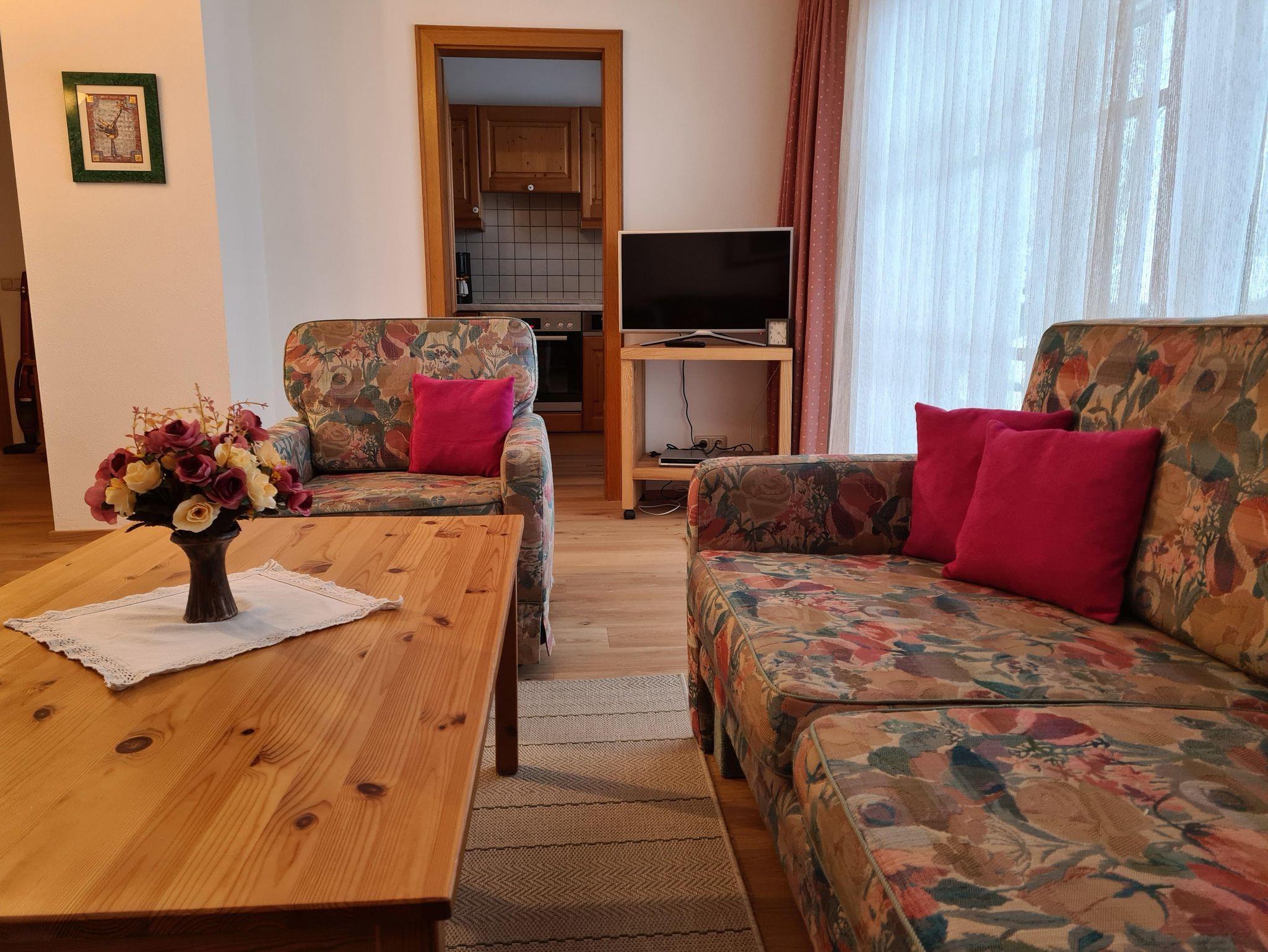 1. Stock links: 4 Sterne, 41 m² für 1-3 Personen, Wohnraum mit Küchenzeile und mobilem Geschirrspüler und Schlafgelegenheit auf der Couch, Schlafzimmer mit einem Doppelbett, Dusche mit WC, Südbalkon, Kabel- TV.