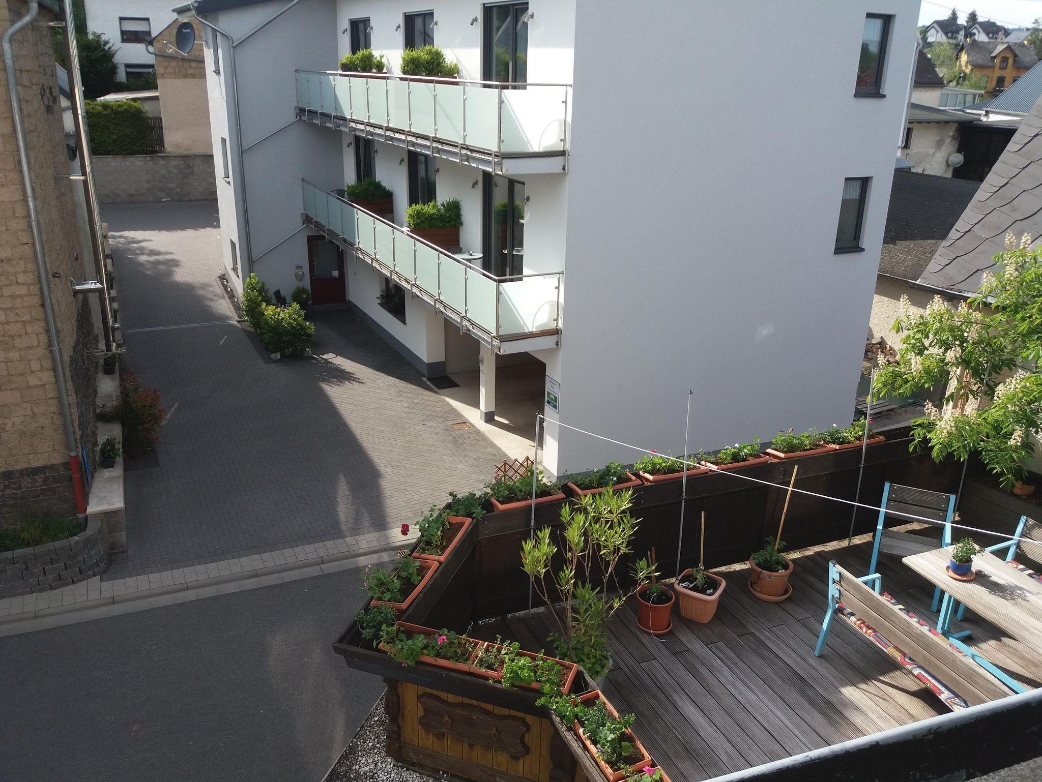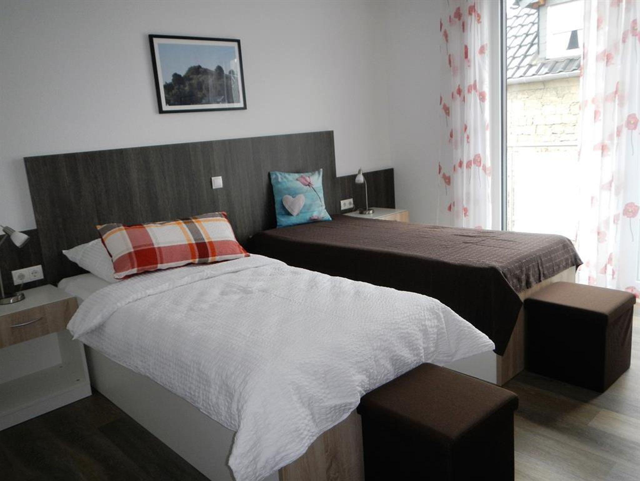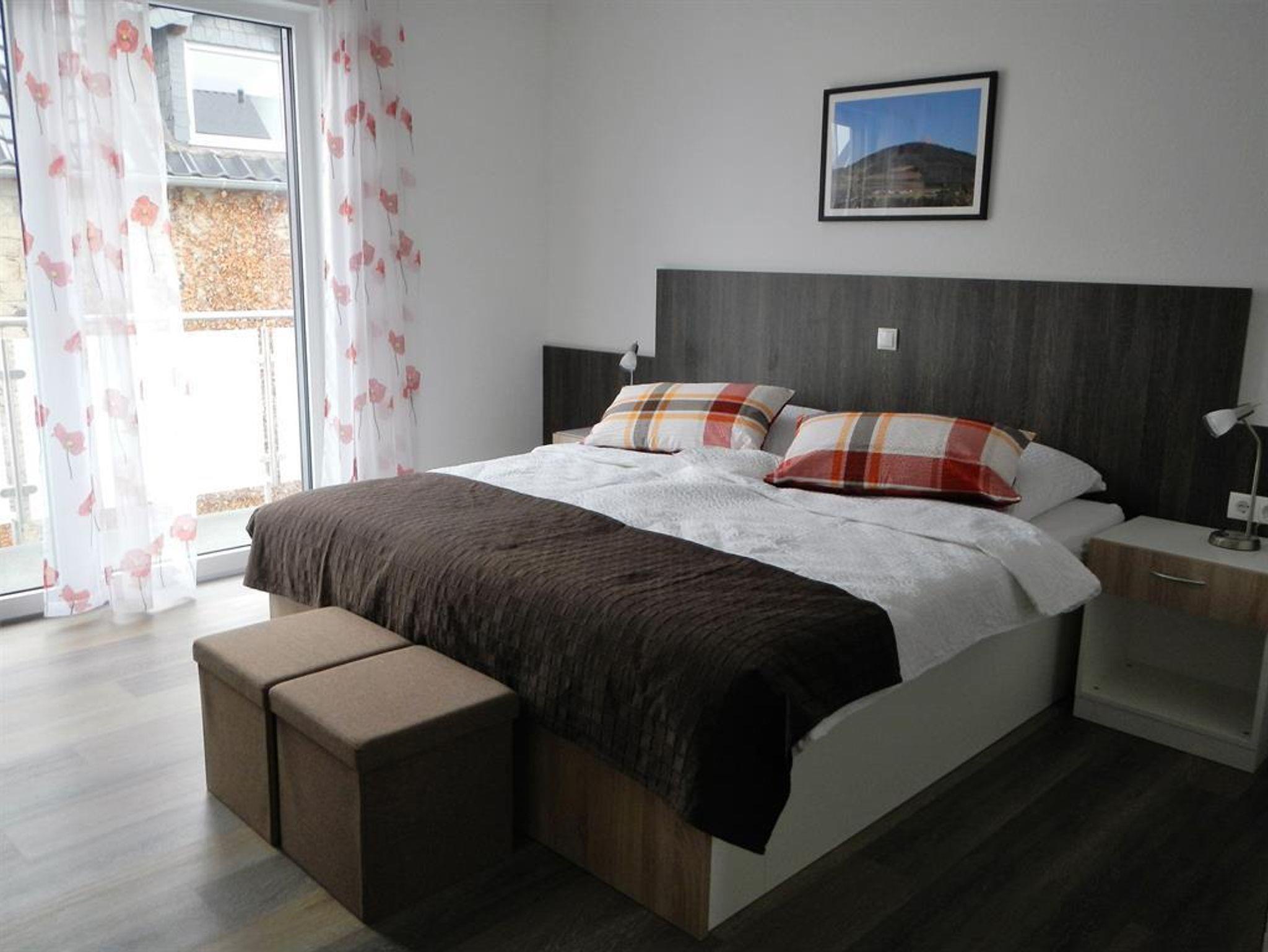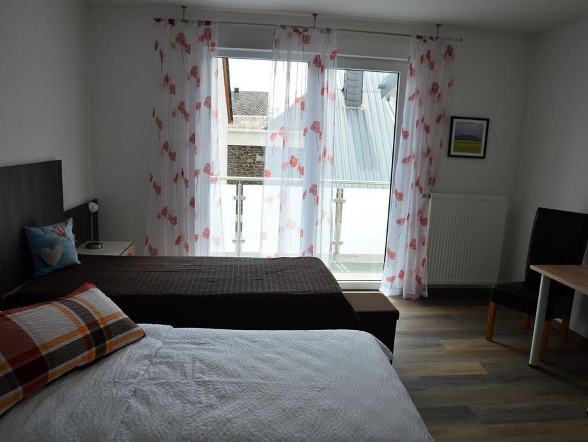 6 Doppelzimmer mit Balkon (26 m²) und bodengleicher Dusche. Das Gästehaus befindet sich in ruhiger Lage mitten in Ettringen in der Osteifel.