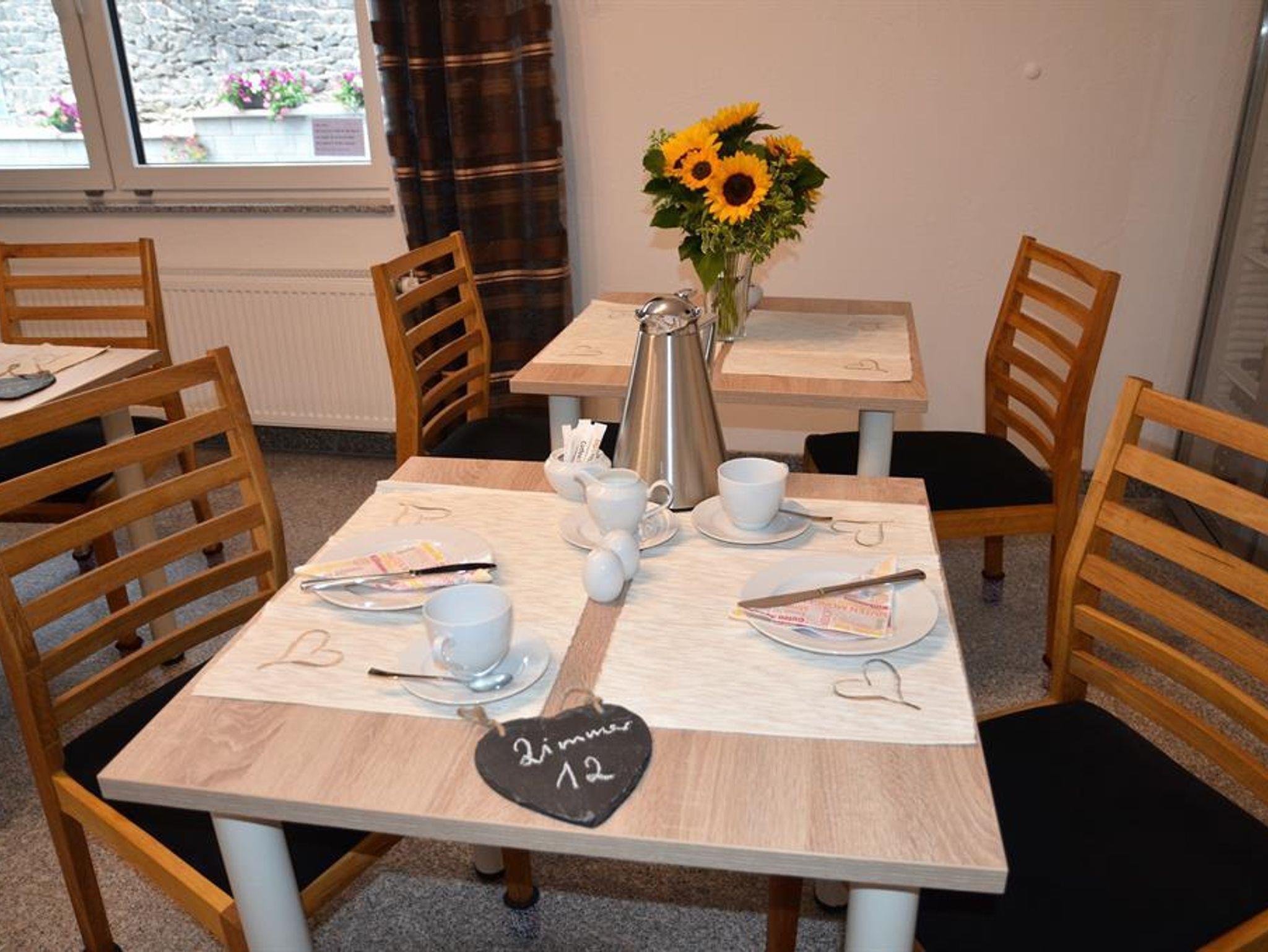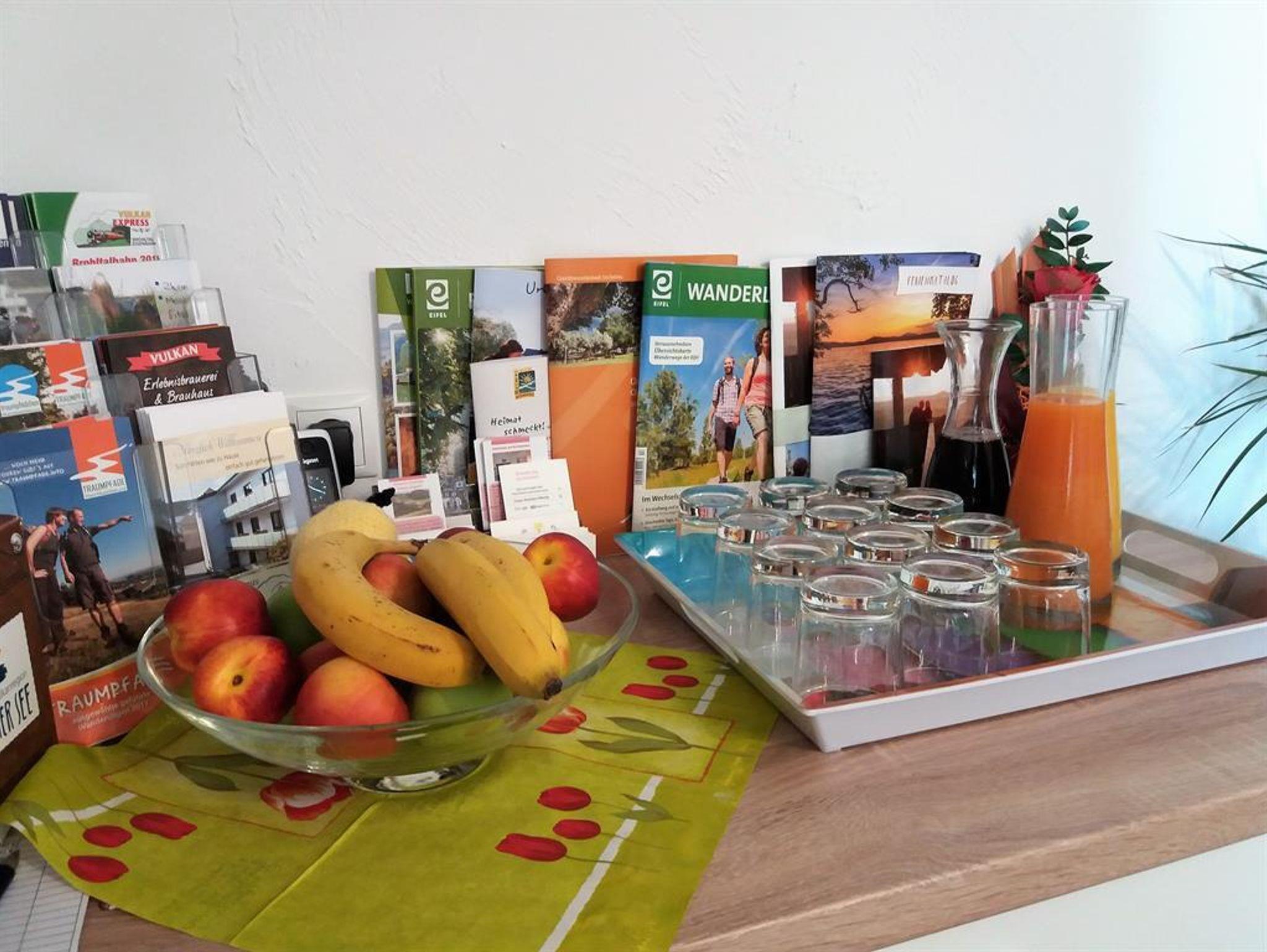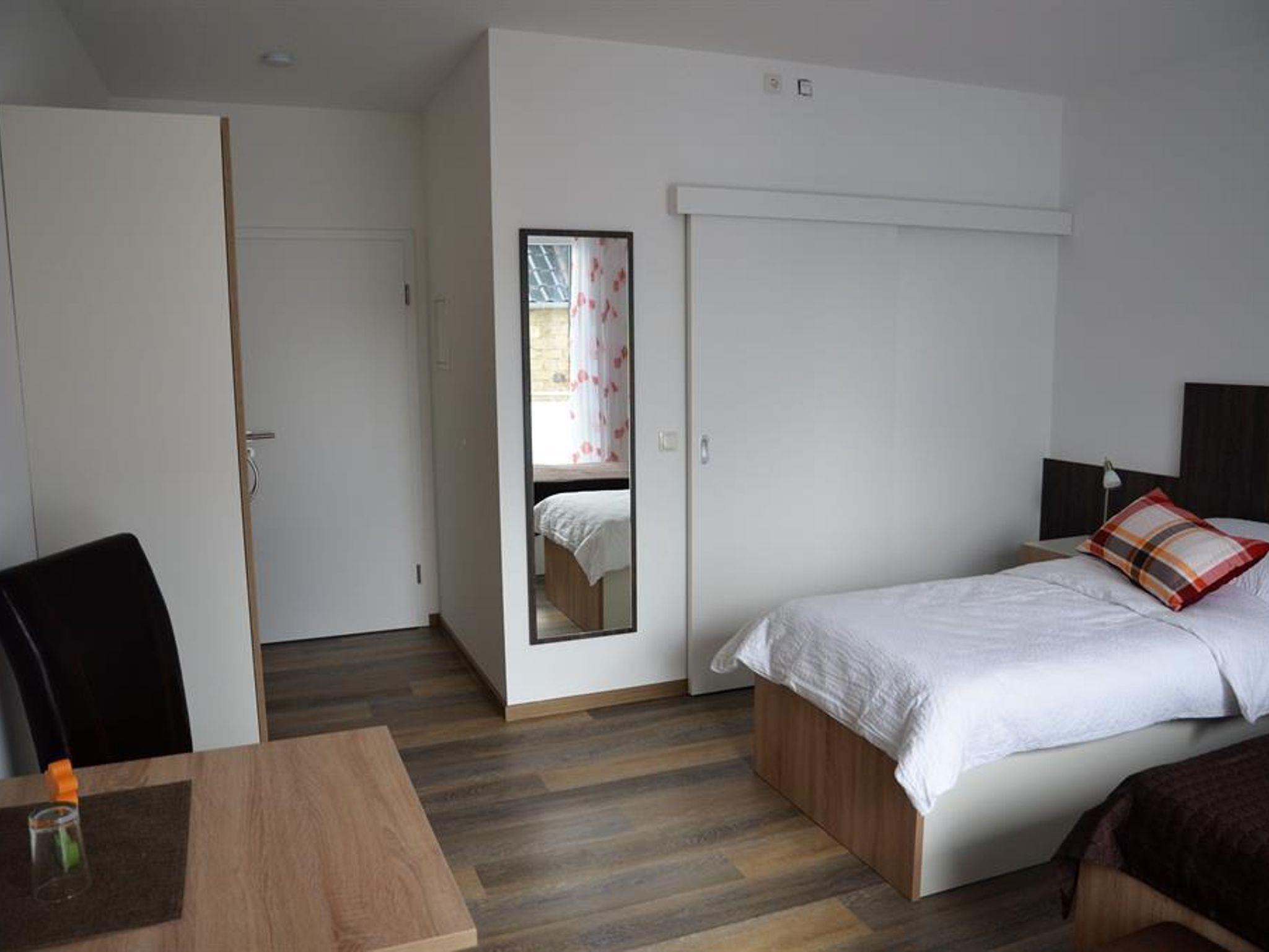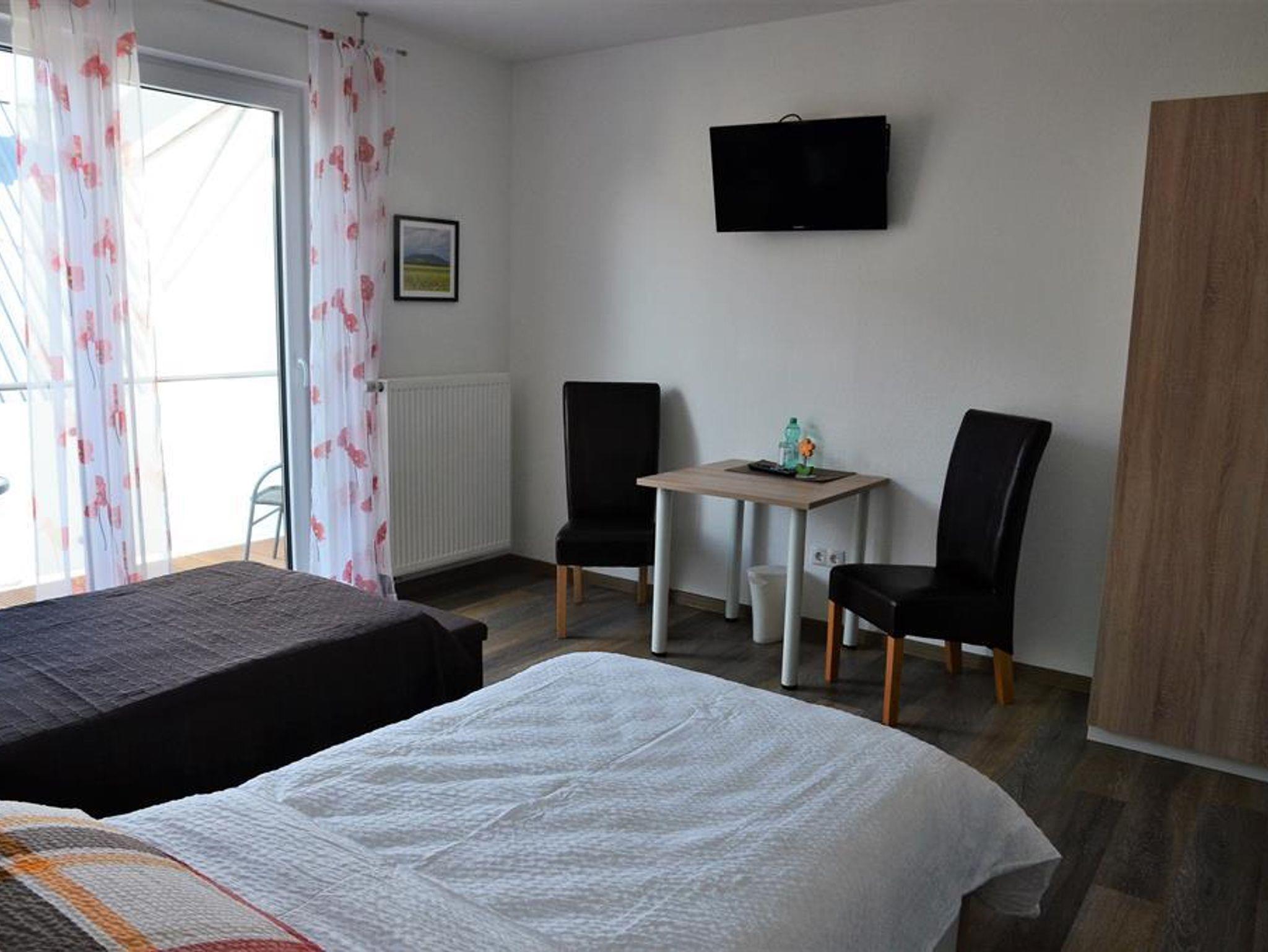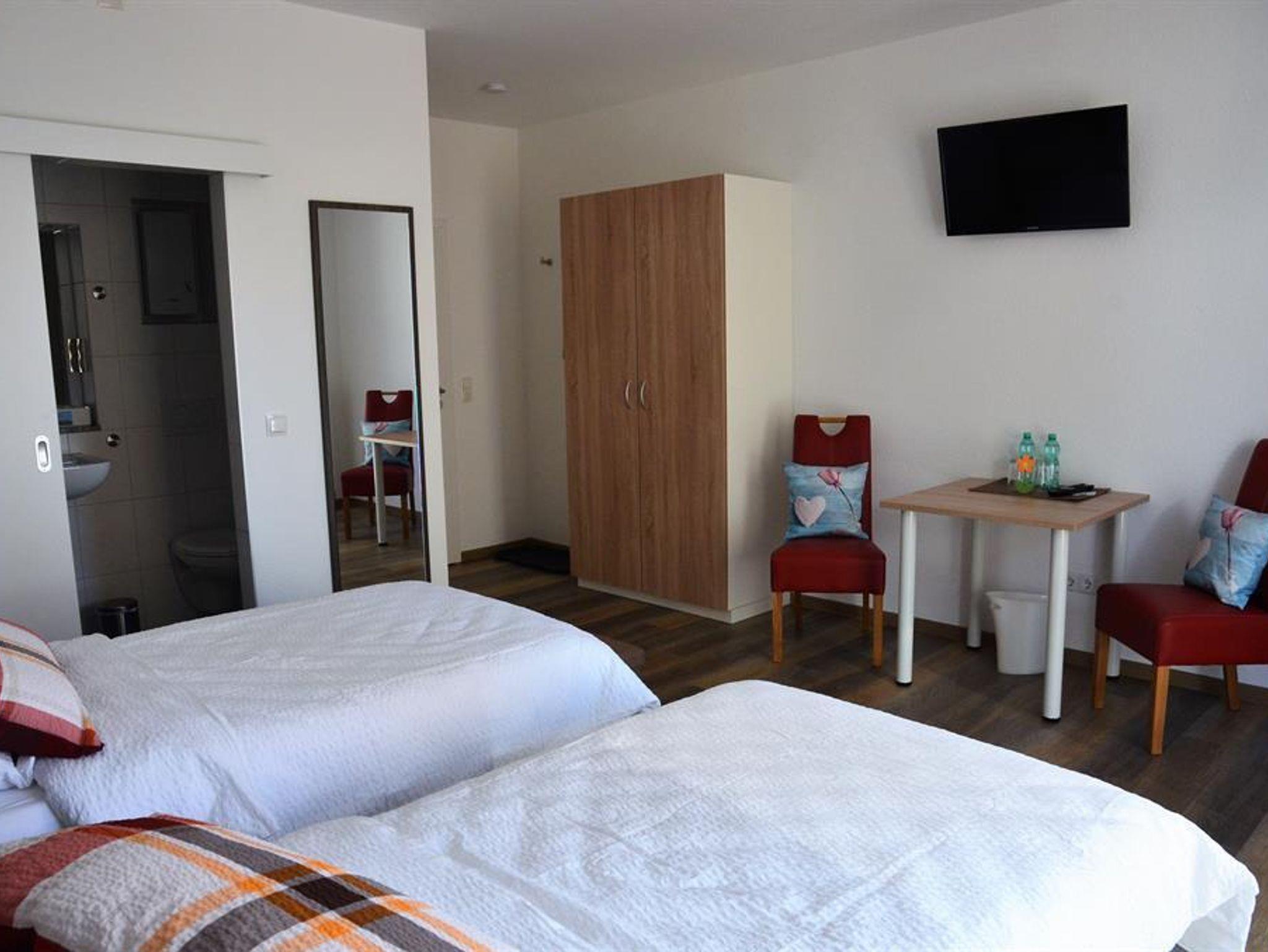 6 Doppelzimmer mit Balkon (26 m²) und bodengleicher Dusche. Das Gästehaus befindet sich in ruhiger Lage mitten in Ettringen in der Osteifel.