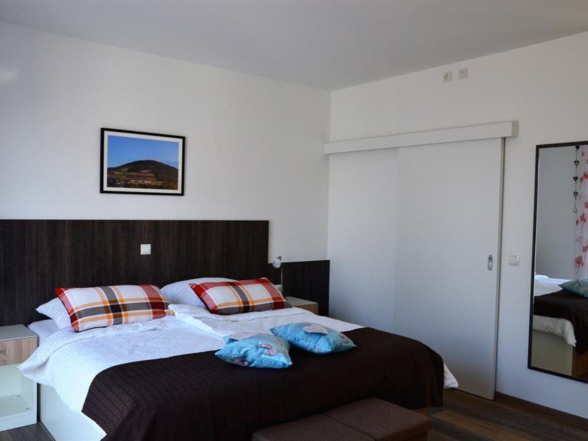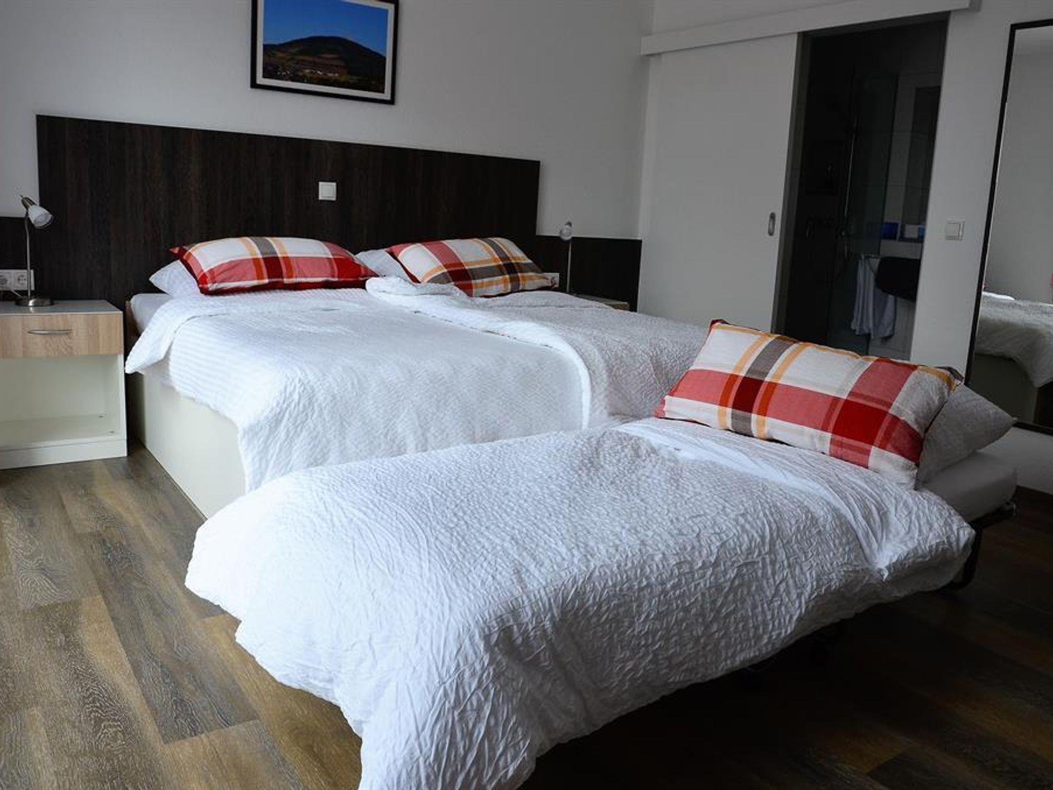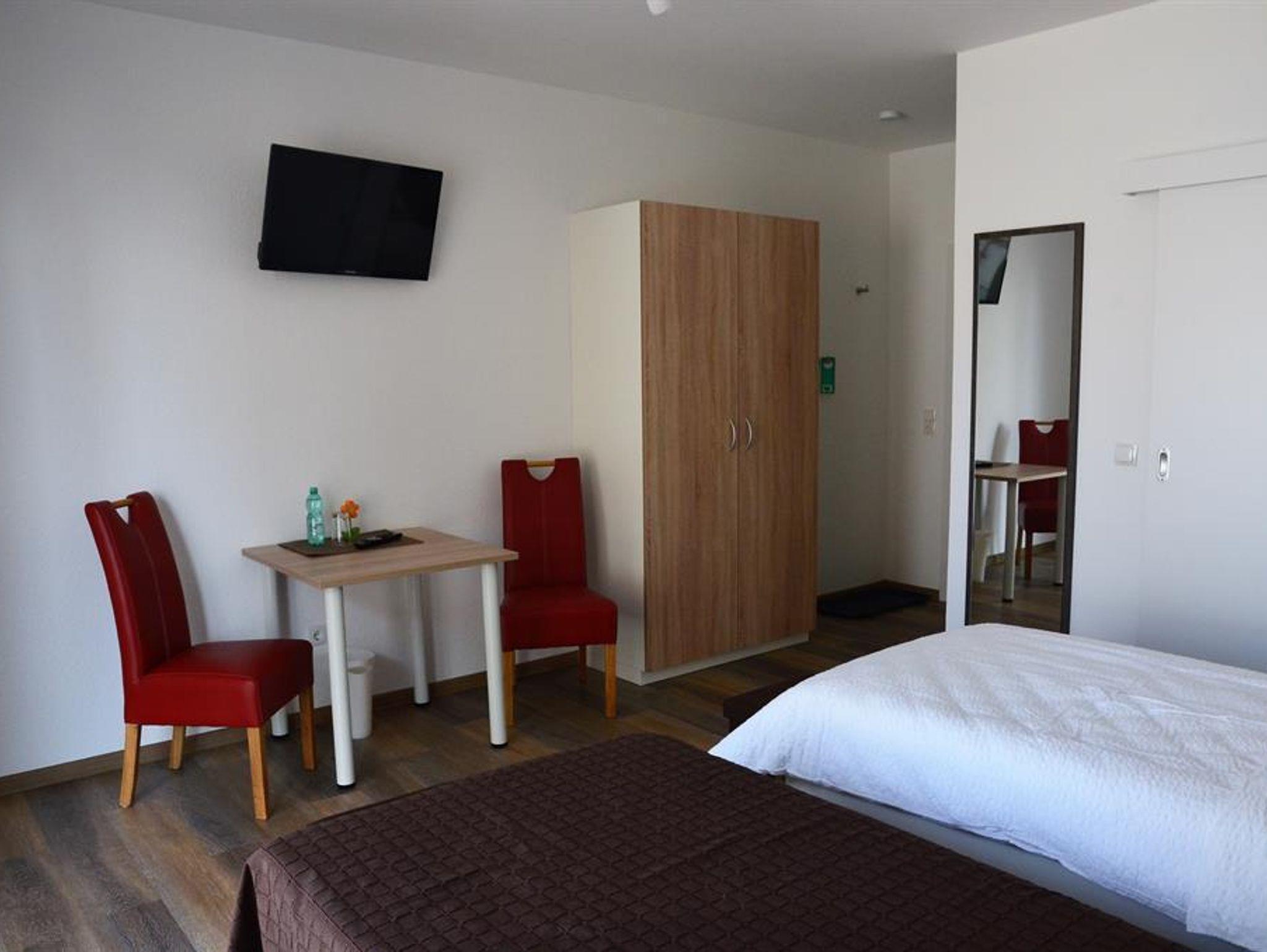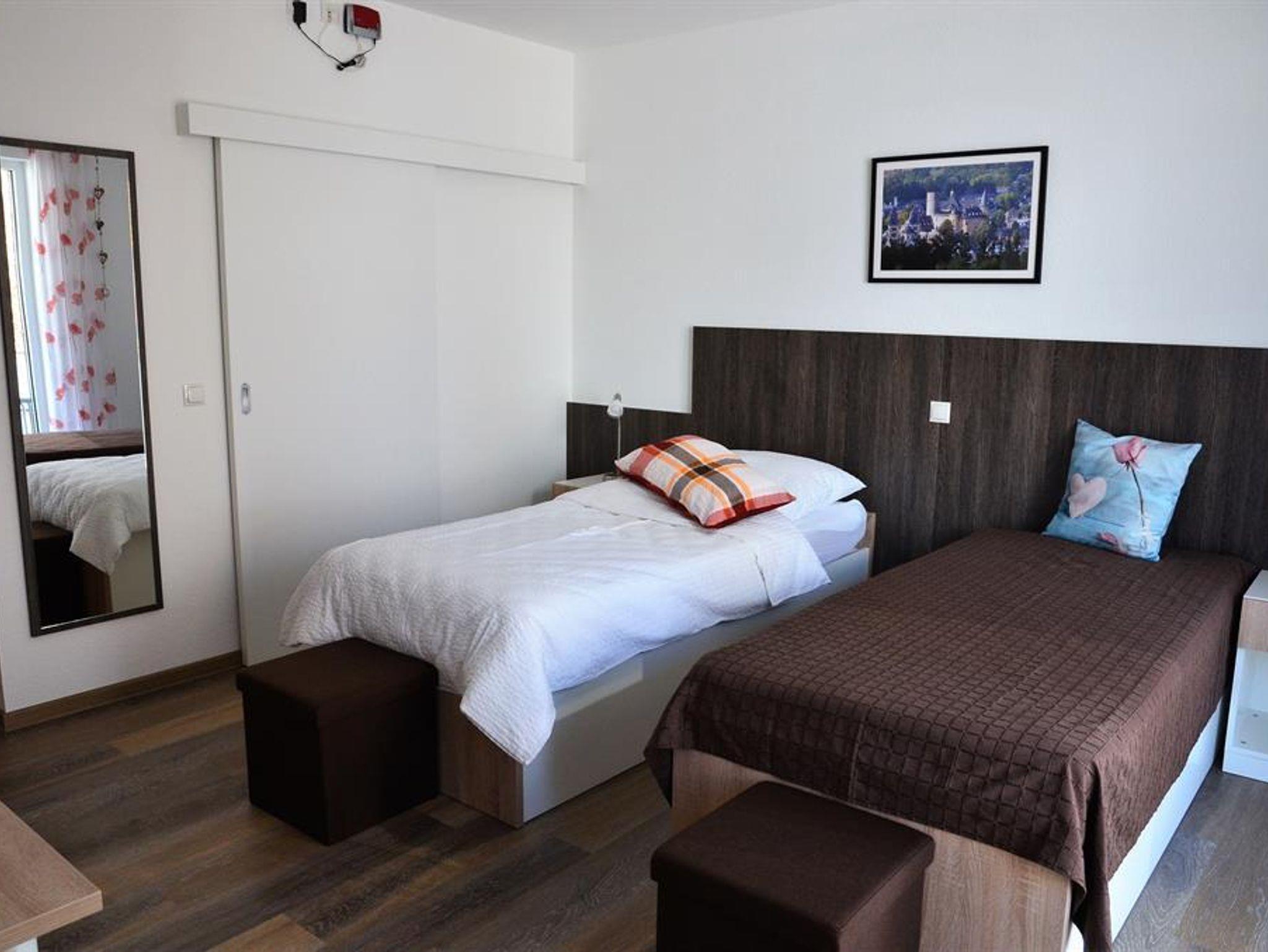 6 Doppelzimmer mit Balkon (26 m²) und bodengleicher Dusche. Das Gästehaus befindet sich in ruhiger Lage mitten in Ettringen in der Osteifel.
