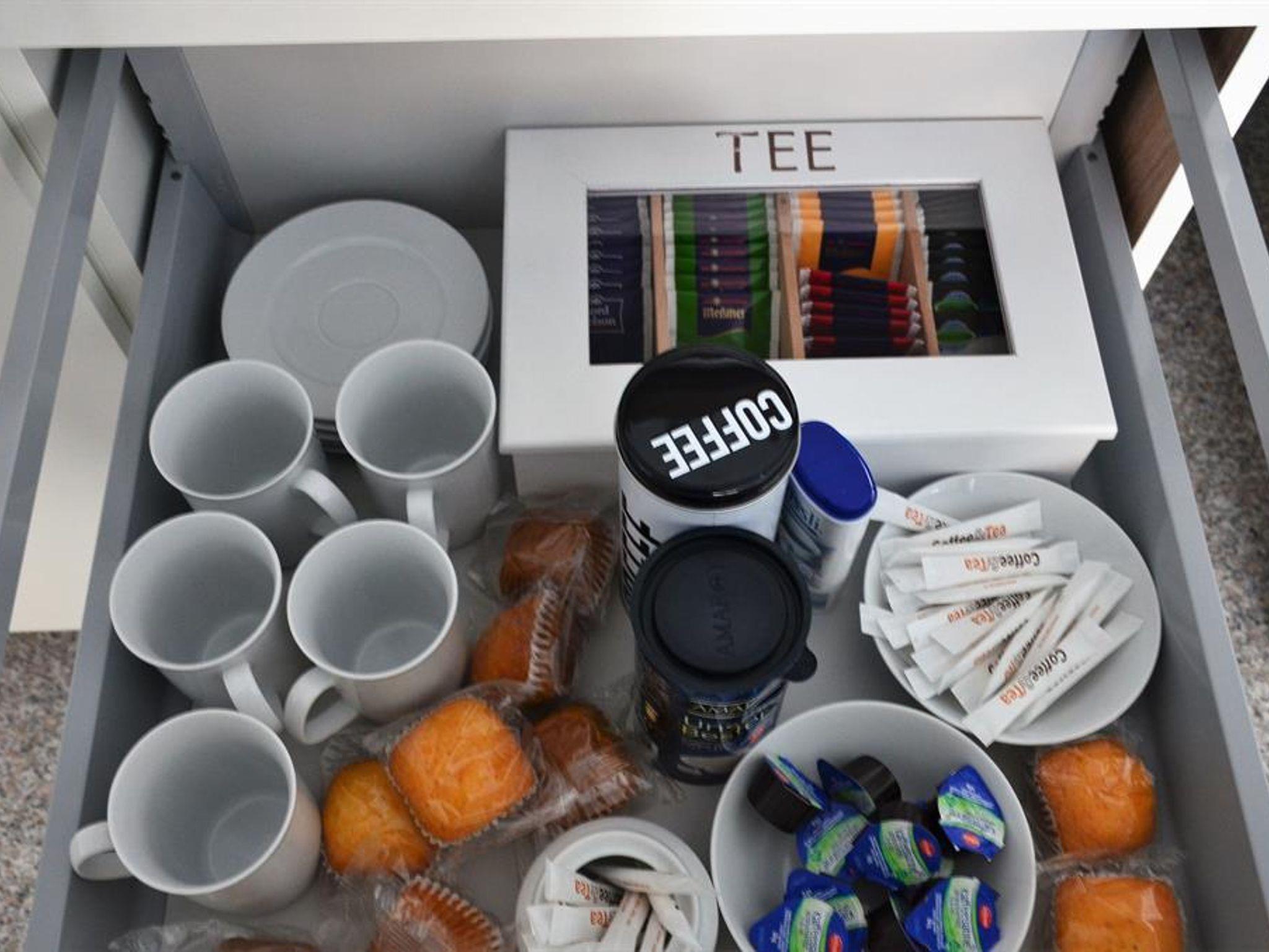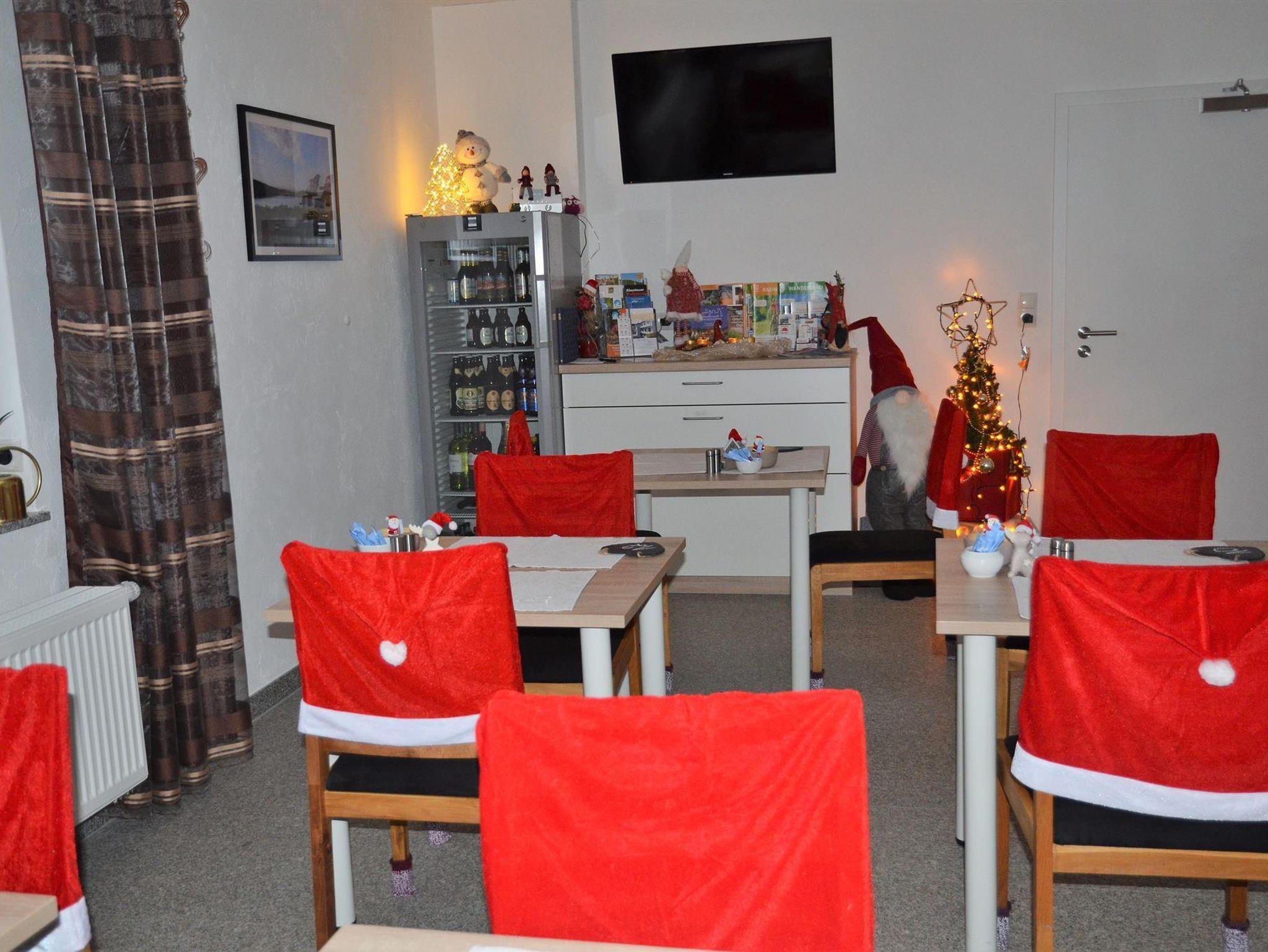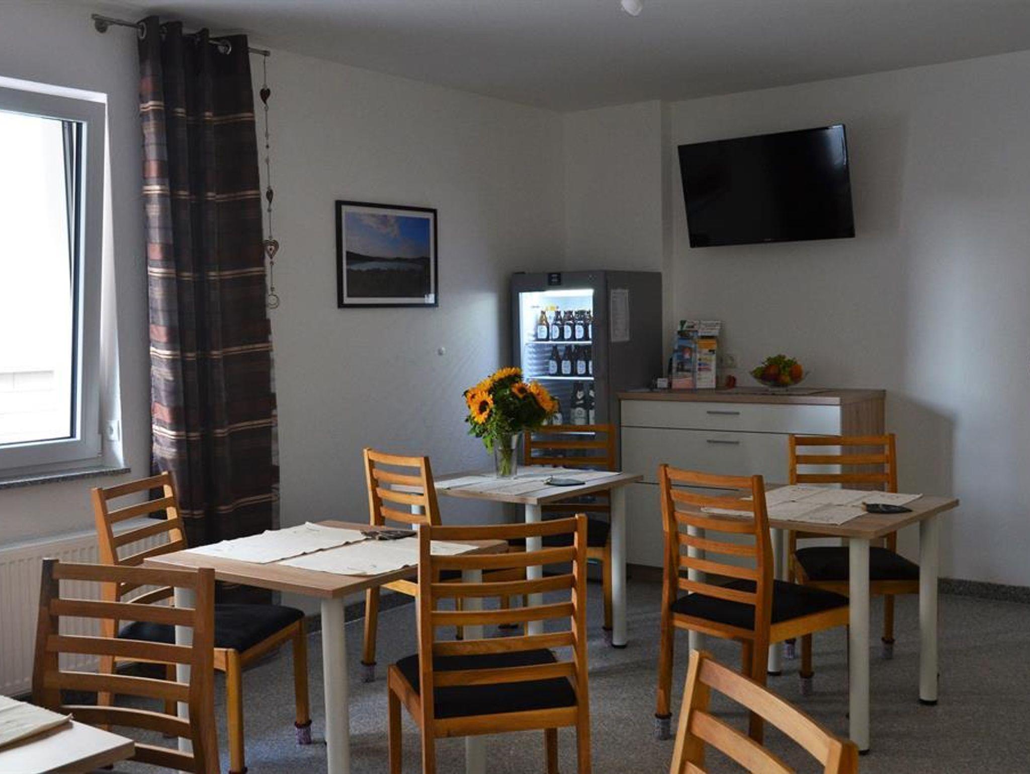 Im Frühstücks- und Aufenthaltsraum stehen Ihnen ein Getränkekühlschrank, Gästekühlschrank, Senseo Kaffeepadmaschine, Geschirr, Gläser und Besteck zu Verfügung.
