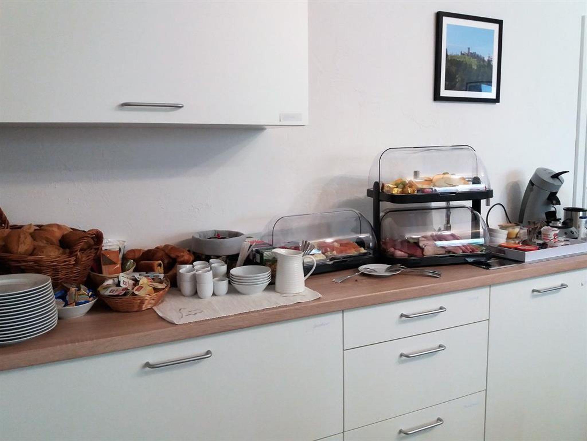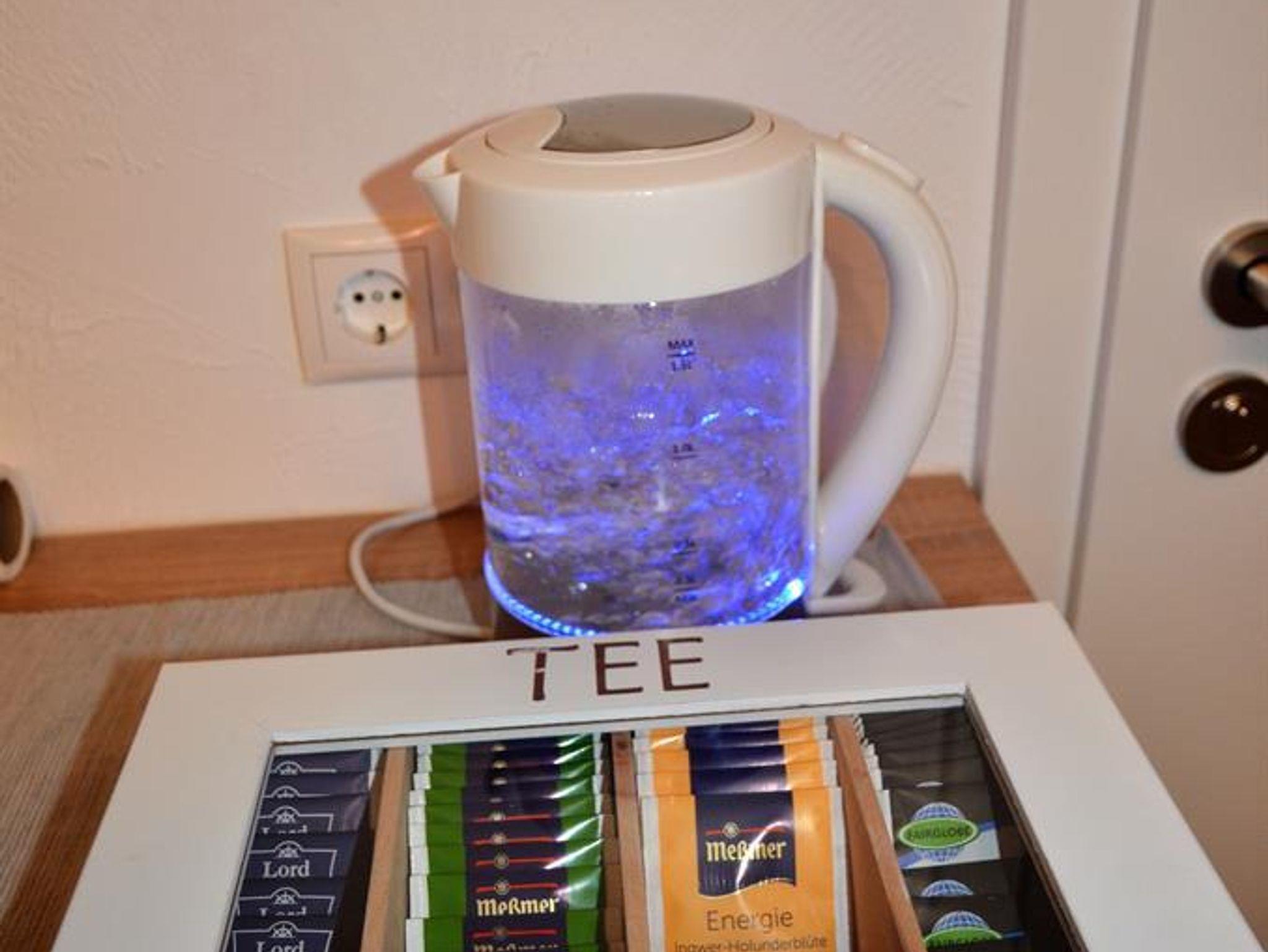 Im Frühstücksraum befindet sich ein Getränkekühlschrank und ein Kühlschrank zur Nutzung für die Gäste. Besteck, Geschirr, Gläser, Sanseo-Kaffeenschine und Wasserkocher stehen zur Verfügung.